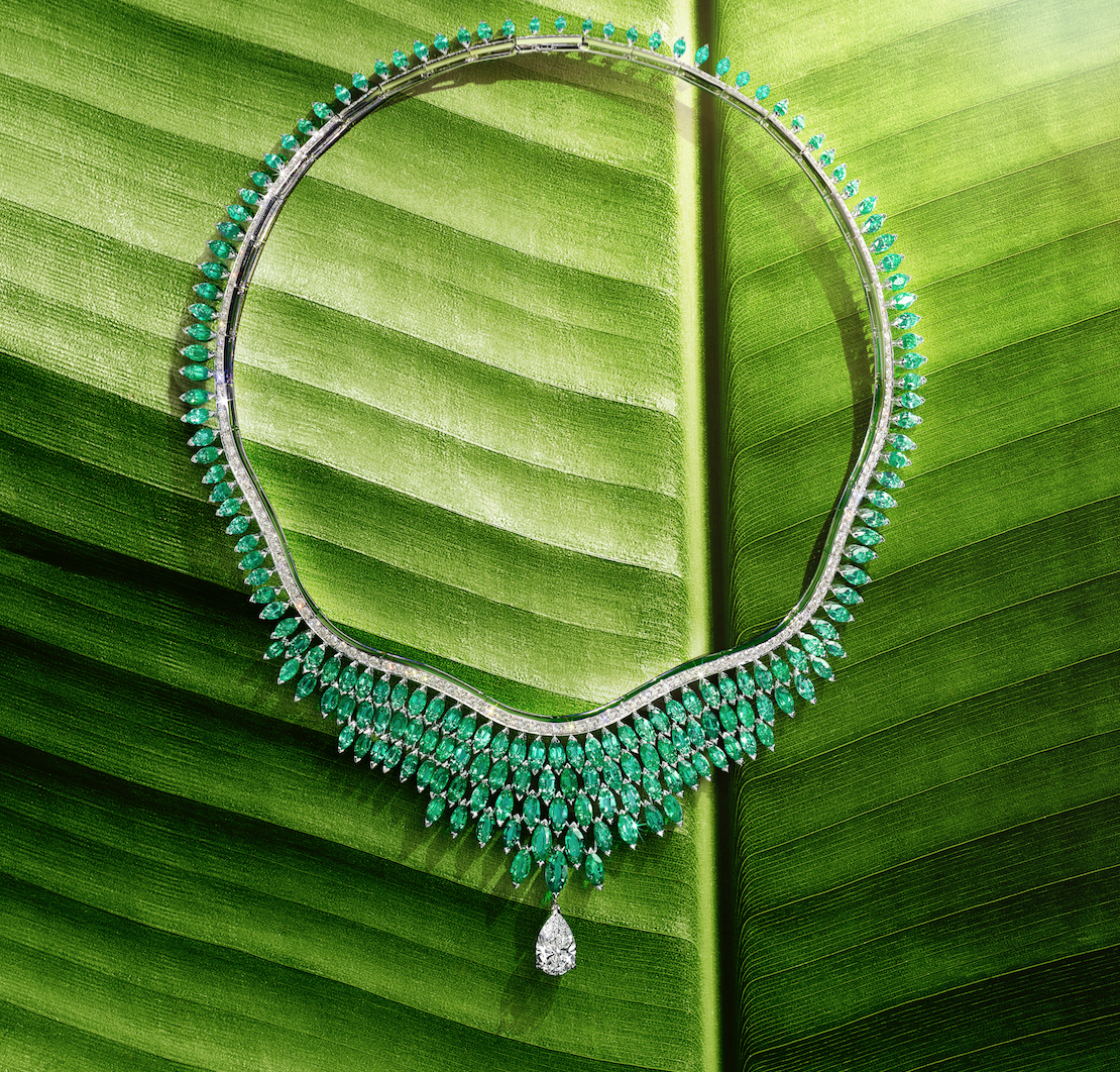 Play of Lights evoca al azul del cielo y a la obscuridad de la noche; mientras que la Golden Hour representa el paisaje arenoso a través de diamantes de color amarillo llamados fancy vivid. Los zafiros del collar Blue Waterfall, dan vida al guardar el significado de la pureza del agua y por último el intenso color y belleza pura de los cristales de las esmeraldas dan oxígeno a las piezas Luxuriante Oasis.