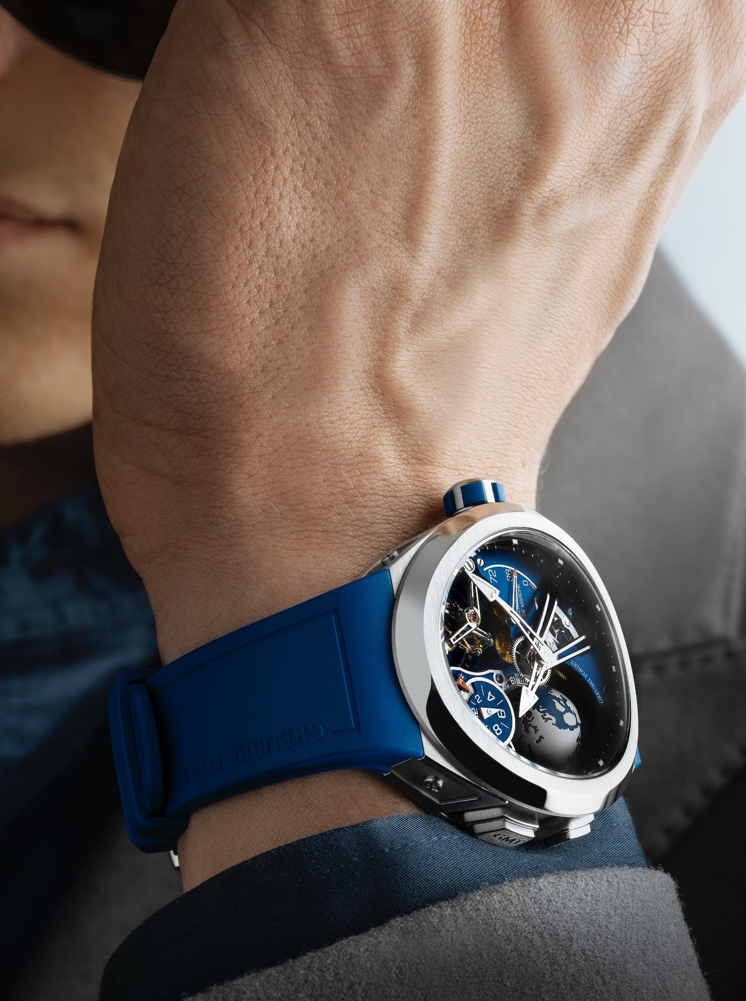 En cuanto al movimiento, este nuevo GMT Sport es el primero en un color unificado: la platina principal, los puentes, el globo, el dial de la segunda zona horaria y el anillo indicador de 24 segundos del Tourbillon 24 Secondes a la 1 en punto están todos en el mismo acabado azul. El puente en arco suspendido central, así como el puente del tourbillon, están calados para resaltar la arquitectura de movimiento tridimensional de su intenso acabado azul.