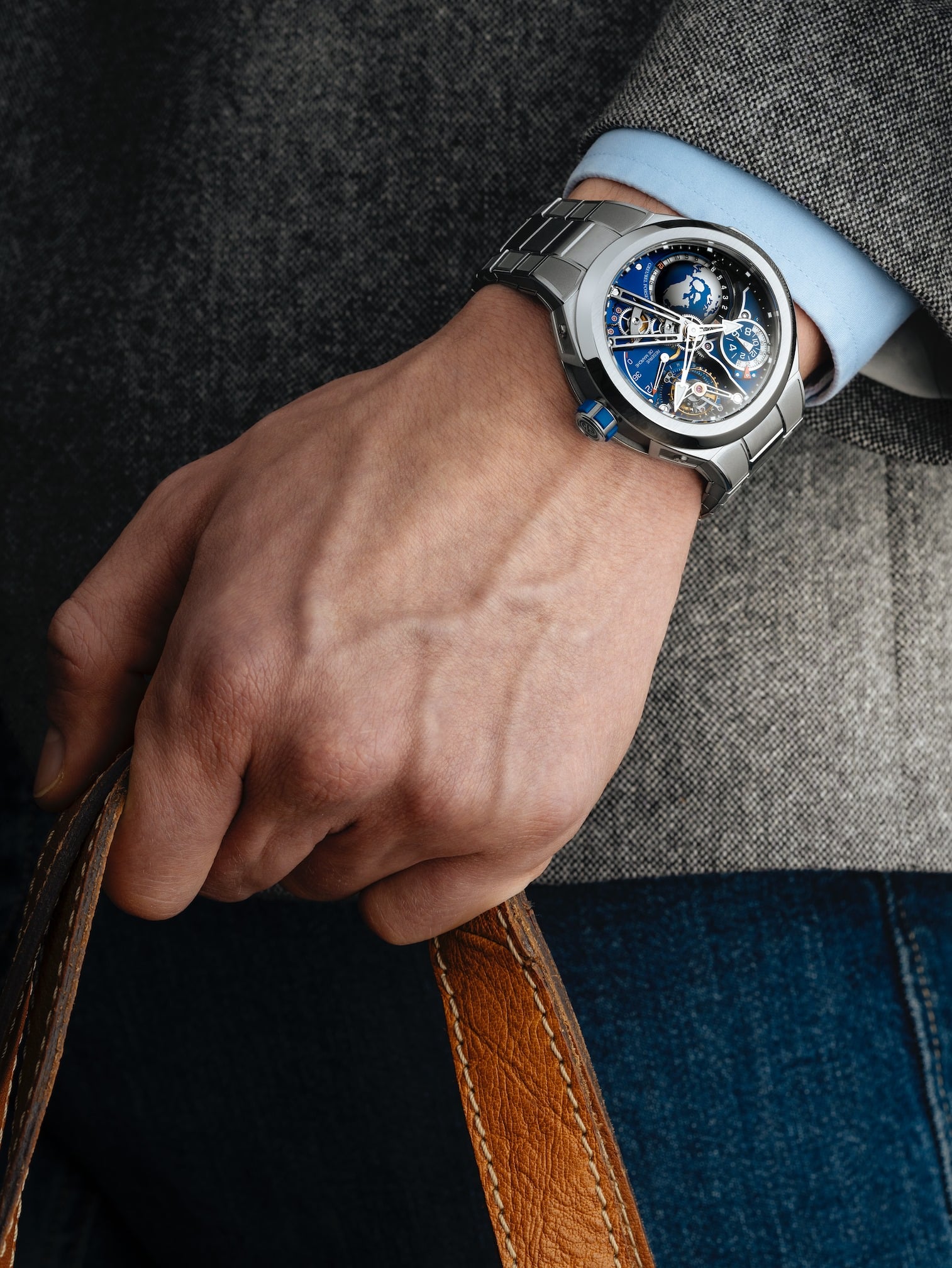 La elección, por un lado, de un azul mate intenso y, por otro, los componentes pulidos en titanio (puentes, globo) o acero (manecillas, reserva de marcha) acentúan los fuertes contrastes dentro del propio movimiento y garantizan una perfecta legibilidad. Gracias a su caja de 42 mm de diámetro (45 mm en el bisel), la expresión del tecnicismo del movimiento armoniza perfectamente con la intuitiva indicación central de horas y minutos, la segunda zona horaria a las 10 horas, la reserva de marcha a las 3 horas y Globo terrestre giratorio a las 8 horas.