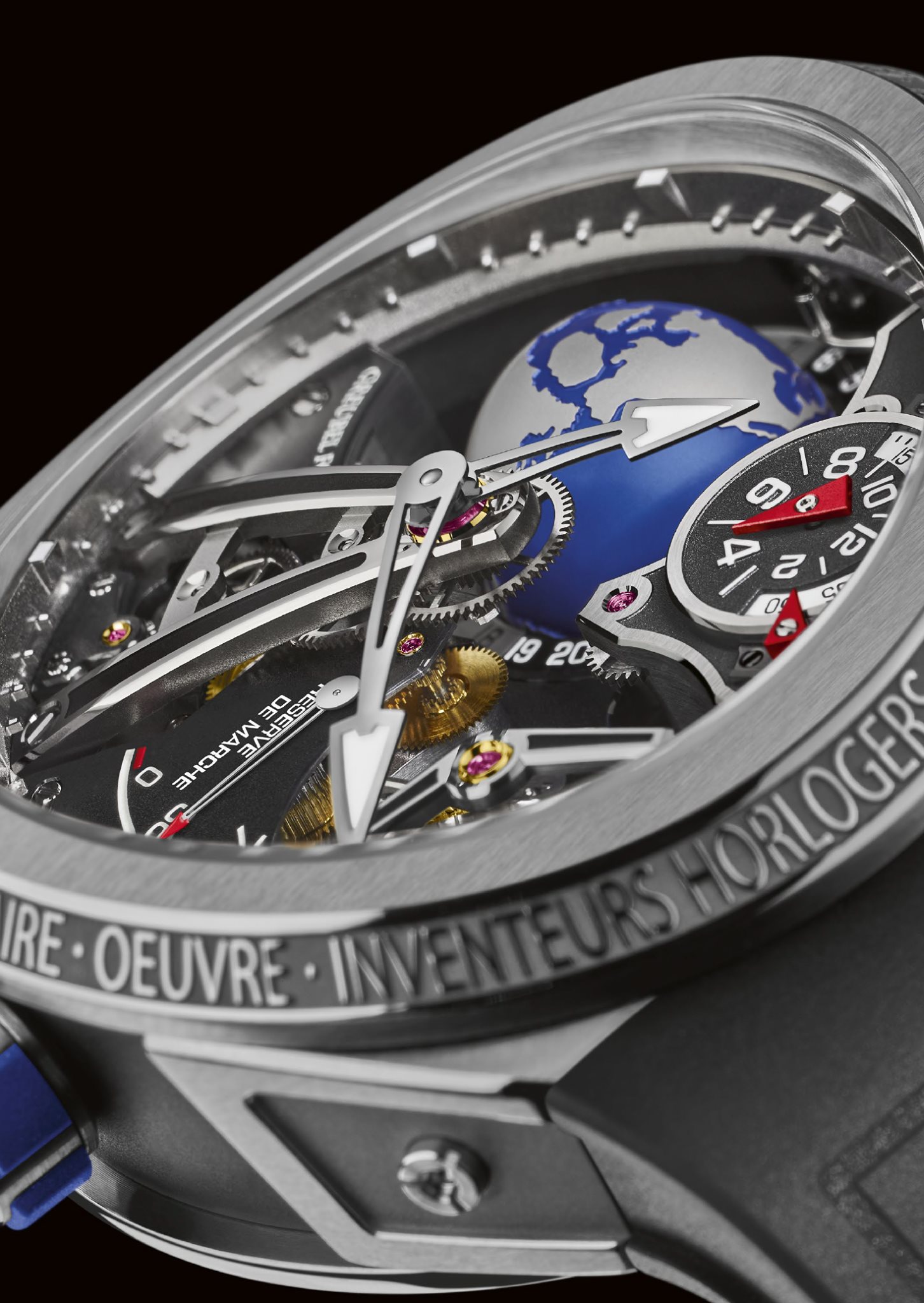 El tiempo se observa de manera poética y tridimensional, como en todas las piezas de la manufactura. Todo parte de una carátula descentrada para las horas y minutos de la hora local, mientras que un indicador adicional exhibe el home time. La reserva de marcha complementa, pero un horas mundiales de 24 horas se presenta mediante un globo esférico hecho completamente a mano. ¡Qué decir del tourbillon de 24 segundos en todo su esplendor!