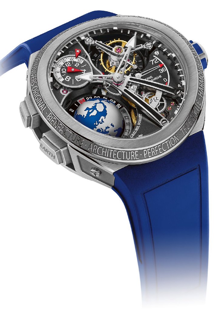 El calibre se trabajó desde cero, ya que acompaña la curvatura del conjunto. La visualización del tourbillon de 24 segundos, la indicación de la hora universal con el globo terráqueo tridimensional y el resto, fueron ajustados para ofrecer ergonomía y microarquitectura.