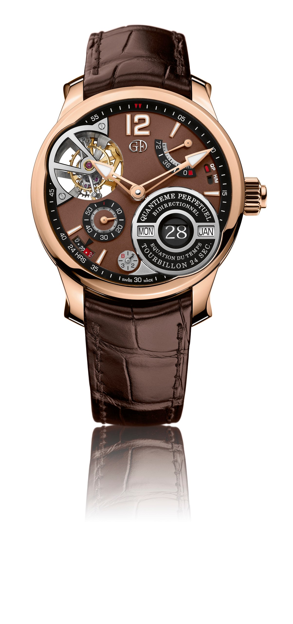 Es así que Greubel Forsey independizó dos cristales de zafiro que rotan libremente guiados por el cerebro de la pieza, pudiendo con ello observar también las diferencias, los equinoccios y solsticios, las cuatro estaciones del año y todas las informaciones del calendario perpetuo. Construido en caja de platino, la innovación de Greubel Forsey es, sin duda, uno de los mejores calendarios perpetuos de la historia, más si contemplamos su función de ecuación del tiempo.
