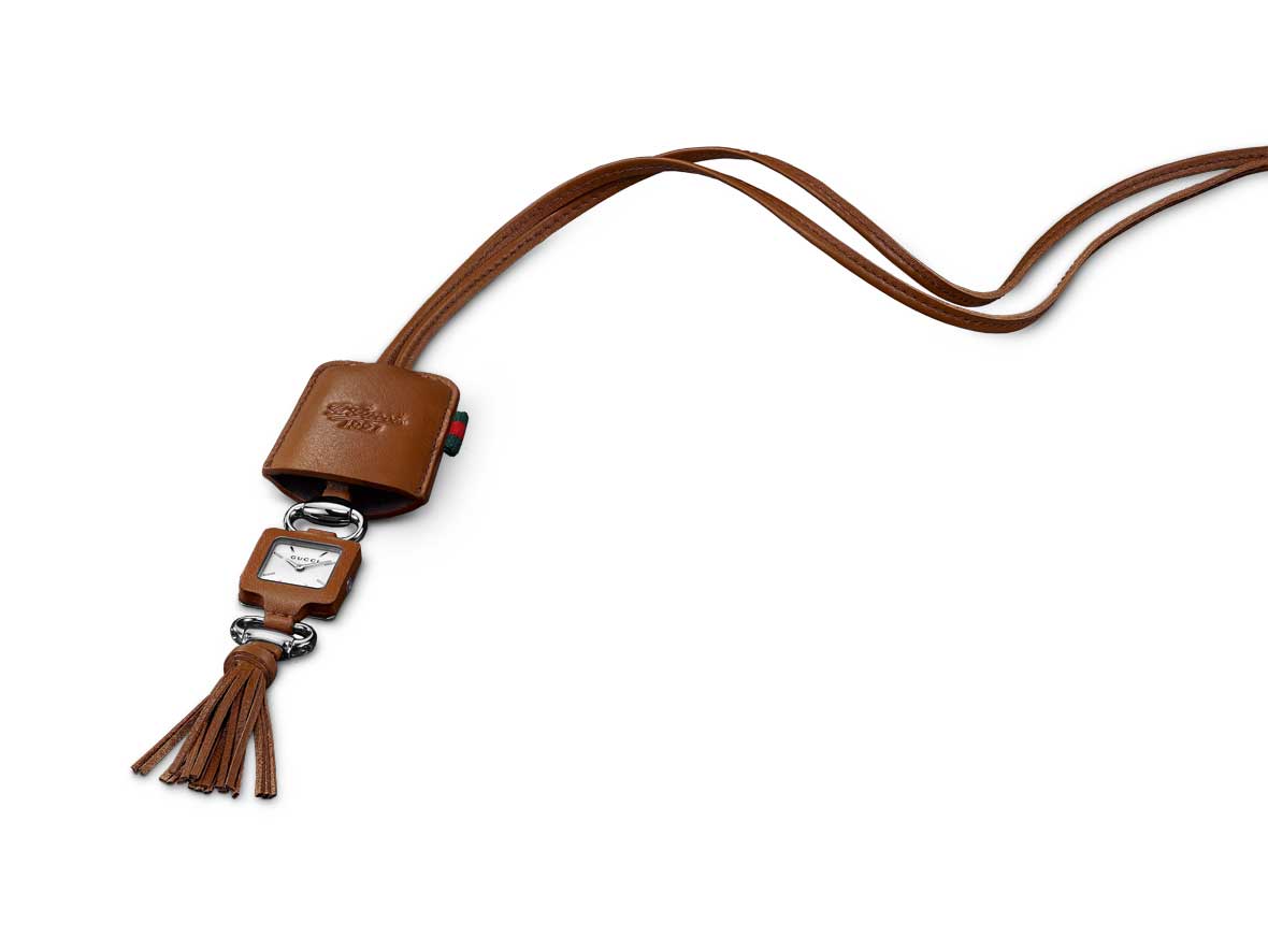 WW-PRIMAVERA 2012. Uno de los artículos más novedosos recientemente diseñados por Frida Giannini, Directora Creativa de Gucci, conmemora los 90 años de la firma. El Reloj Colgante 1921 se encuentra disponible en dos colores: un llamativo tono rojo y un clásico color camel. La novedosa pieza constituye tanto un reloj práctico como un accesorio original con un toque muy femenino.