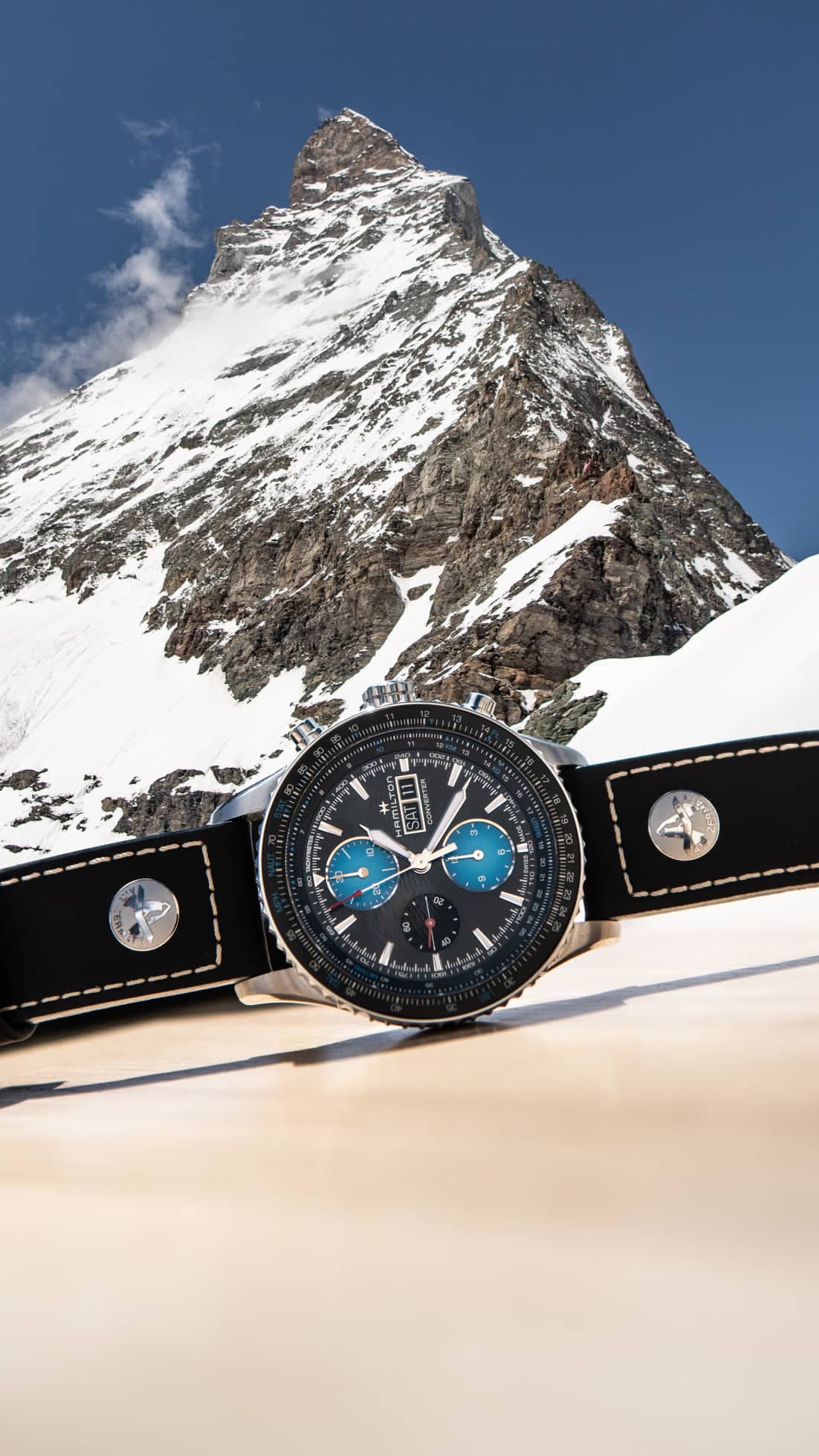 - Caja: 44 x 14.6 mm de acero inoxidable con corona atornillada; bisel bidireccional con regla de cálculo y fondo de cristal de zafiro destacado con el logotipo de Air Zermatt