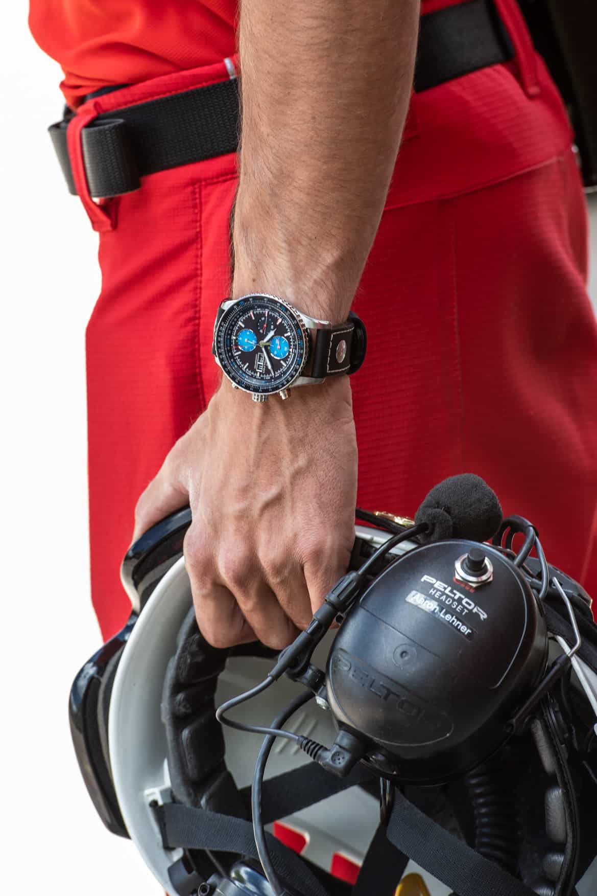 En cuanto a la estética, toma sus tonos de los famosos colores distintivos de los helicópteros rojos del equipo de rescate con el logotipo azul glaciar de Air Zermatt. Los elementos más importantes del cronógrafo de esfera negra se destacan con subesferas en degradado azul y el segundero sobresale en rojo brillante. Los marcadores de la calculadora del bisel también son de color azul glaciar. En el fondo se distingue el logotipo de Air Zermatt, mientras que el calibre H-21 se deja admirar en todo su esplendor. Se trata de un mecanismo de última generación, desarrollo de grupo, que cuenta con un órgano regulador amagnético gracias a la espiral de silicio, al tiempo que con este material se garantizan la estabilidad, temperatura y precisión de la cronometría.