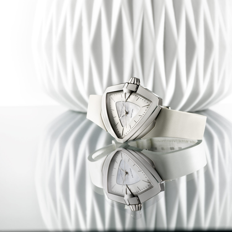 Porque ladies first… Hamilton presentó un Ventura decididamente femenino y elegante. Le dotó de una carátula madreperla y de una talla ideal para posarse en la muñeca de las mujeres actuales: 34.5 x 38 mm de diámetro. Al interior cuenta con un calibre de cuarzo de alta precisión y se abraza al pulso gracias a una correa de caucho blanco.