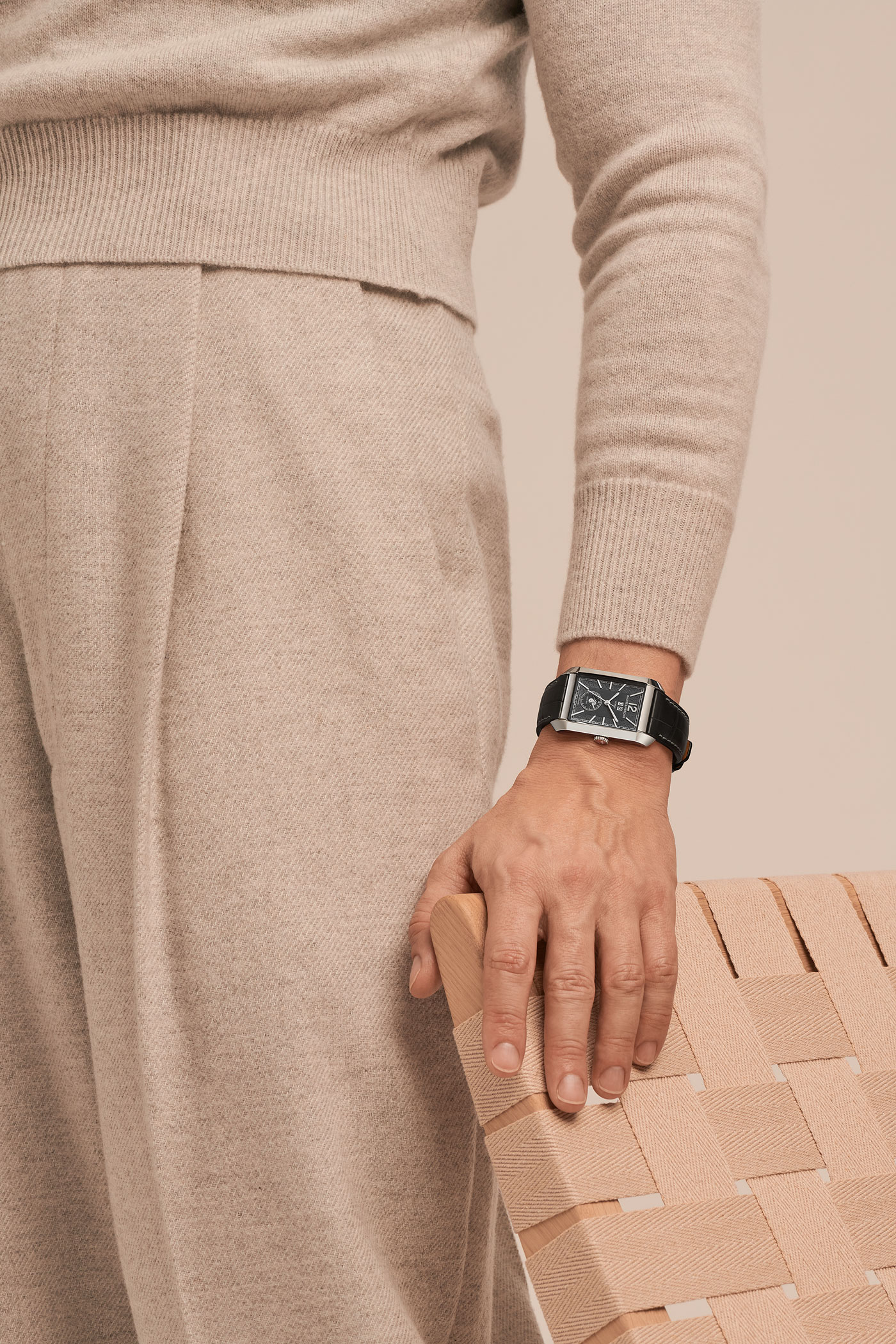 Esta versión de tamaño mediano, incorpora un movimiento de cuarzo de muy larga duración. La correa de piel de becerro marrón con pespuntes beige, el tono de tendencia, combina a la perfección con la caja de acero pulido. Su silueta rectangular se acentúa mediante un juego de rectángulos grises que se alargan hacia el exterior como si quisiesen salirse del marco.