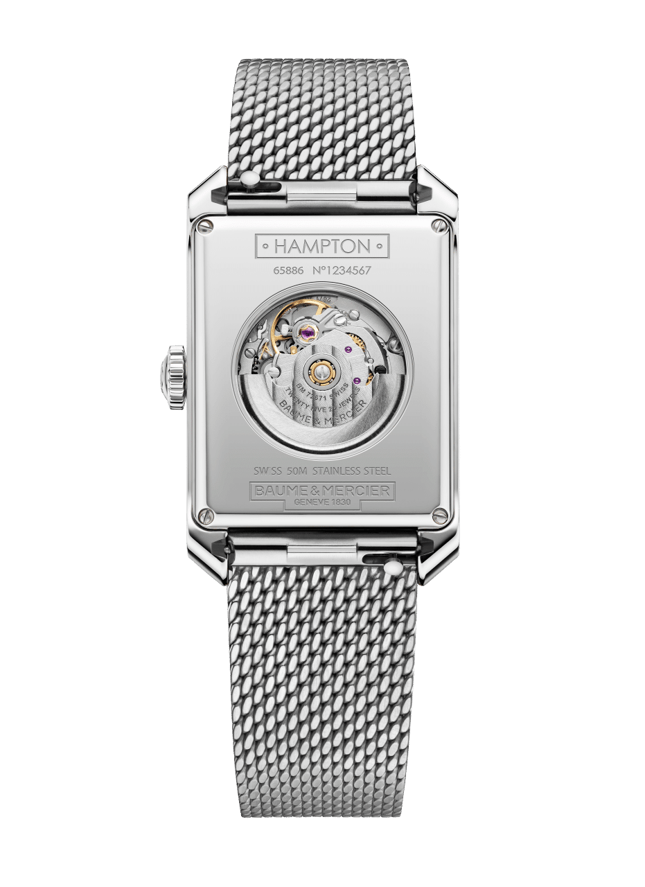 Además de su emblemática caja, esta colección es reconocible por su brazalete de malla milanesa, estilo que floreció en la década de los cincuenta y que Baume & Mercier ha logrado perfeccionar. Hampton revisita el brazalete con una malla milanesa bien apretada de acero pulido y satinado que se adaptan de forma impecable a la muñeca. Todo el mundo se deja seducir por este aspecto retro en que se encuentran el Art Déco y la artesanía italiana. El reloj, con una elegante caja de acero inoxidable pulido de tamaño mediano, está disponible con movimiento automático o u de cuarzo de larga duración. Pero conozcamos a detalle cada una de estas piezas.