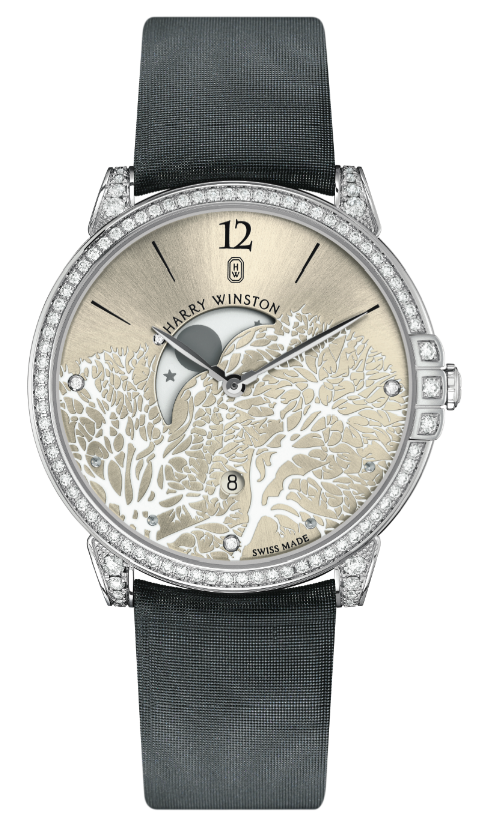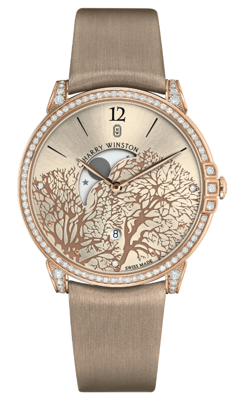 A través de la Midnight CollectionTM, Harry Winston ofrece una romántica interpretación de la complicación fases de la Luna. Es mediante una apertura en forma de Luna creciente que se extiende entre las 9 h y las 12 h, la Luna y las estrellas se asoman tras las ramas de unos árboles meticulosamente grabados y lacados haciendo contraste.