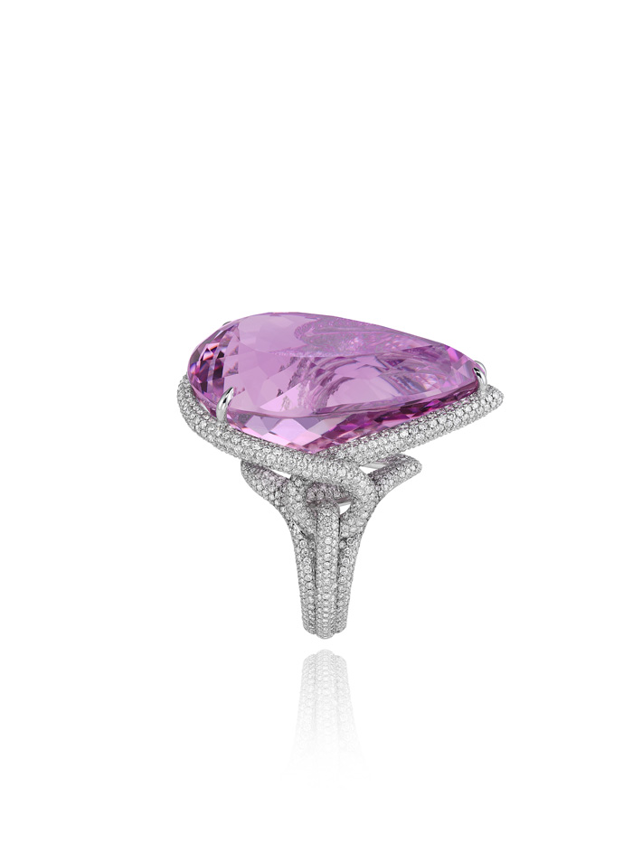 Una primaveral prenda de amor: una sortija amapola de pétalos tan delicados, que podríamos jurar que los vemos temblar al menor movimiento… Para realizar esta minuciosa obra de arte en oro amarillo y blanco, joyeros y engastadores han mezclado con los diamantes más de 700 rubíes, 640 tsavoritas y 168 esmeraldas.