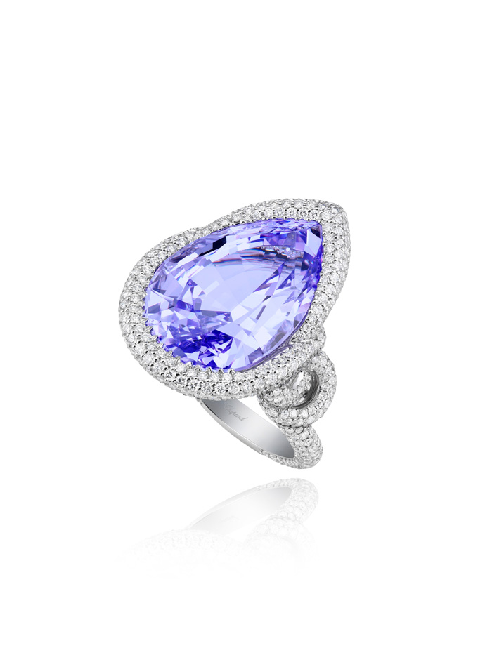 Perfecta alianza entre belleza, pureza y misterio, símbolo del máximo lujo y del amor eterno, el diamante es también, como le gusta decir a Caroline Scheufele, « el rey de las alfombras rojas ». Situado tanto en primer como en segundo plano, representa su papel a la perfección, ofreciendo a las creaciones un pequeño plus de elegancia y de magnificencia que marca toda la diferencia. Una de las piezas centrales de esta nueva colección es, sin la menor duda, un majestuoso collar de oro blanco, con un diamante talla pera de 5 quilates y 284 diamantes talla rosa, que representan casi 183 quilates. Además, la Casa Chopard, experta en el arte de la realización de relojes de joyería, propone, también, un espectacular ejemplo de su saber hacer.