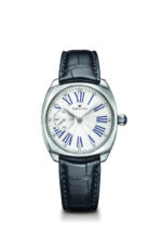 El nuevo Heritage Star 33 mm encarna la sutil alquimia entre excelencia técnica y seducción femenina y hace latir más fuerte el corazón de las amantes de la mecánica relojera en combinación con un glamour impregnado de clasicismo. La caja “retro-chic” en forma de cojín, de oro rosa o acero, es más pequeña que en los modelos anteriores y despliega sus elegantes formas en unas delicadas dimensiones: 33 x 33 mm, para transmitir mejor la finura que ha guiado la concepción del reloj. Aunque tenga un grosor de solo 9.45 mm, el reloj late al ritmo de un movimiento automático de una precisión y fiabilidad excepcionales, a saber, el calibre Elite 681. Se trata de un verdadero tesoro de delicadeza con una altura de solo 3.47 mm, que oscila a una frecuencia de 4 Hz y que cuenta con una reserva de marcha de más de 50 horas y una resistencia al agua de hasta 30 metros de profundidad. Sus rodajes y su masa oscilante con motivo “Côtes de Genève” se pueden observar a través del fondo de zafiro, mientras en la carátula se va desgranando el paso inexorable del tiempo. Del delicado guilloché “flinqué-froissé” plateado surgen tres números romanos clásicos con un aureola azul o dorados, jalonados por 12 diamantes talla brillante.