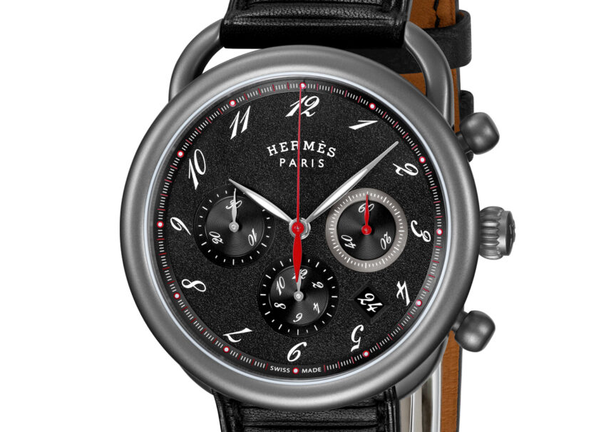 Con 41 mm de diámetro, Hermès Arceau utiliza el titanio granallado para el desarrollo de la caja. Esto le confiere un estilo único y una ligereza excepcional, que destaca por su bella estética. Asimismo, el conjunto de los tres totalizadores posicionados en la carátula y sus emblemáticos números enmarcan la indicación de: horas, minutos y trotadora central. El pequeño segundero destaca a las 3 y los contadores de minutos y horas hacen lo propio a las 9 y 6 horas.