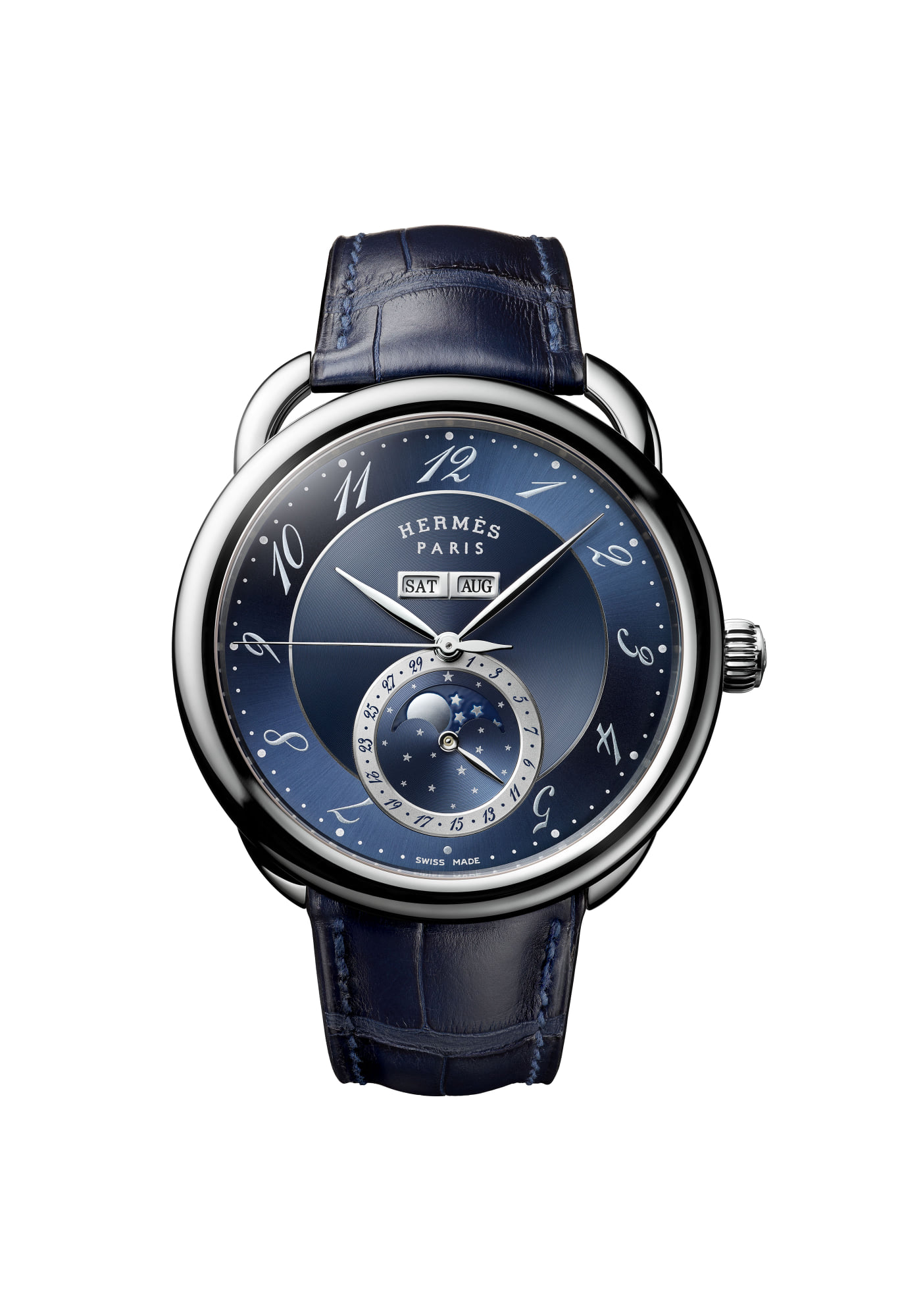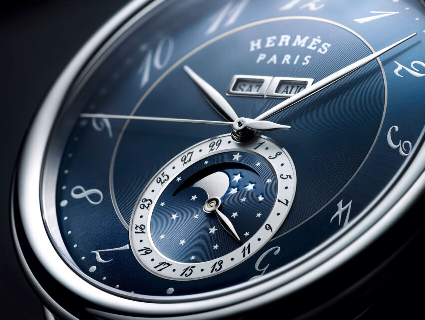 Las finas agujas y las cifras que dan sensación de movimiento confieren al modelo un estilo dinámico subrayado por el contador de fecha y fases lunares –que se muestran sobre un cielo estrellado– y por la doble ventana con indicación de día de la semana y mes dispuesta bajo el logotipo de Hermès.