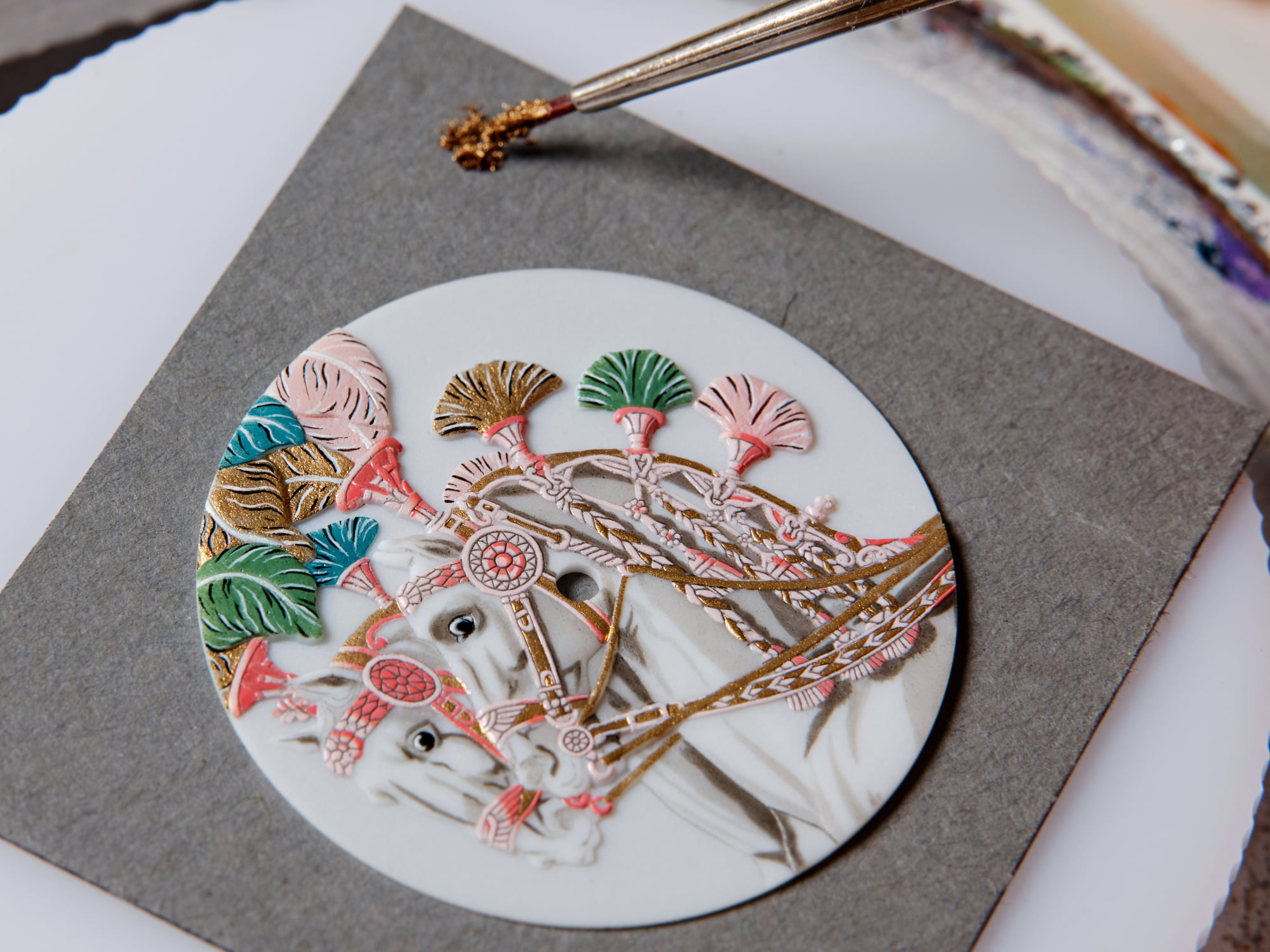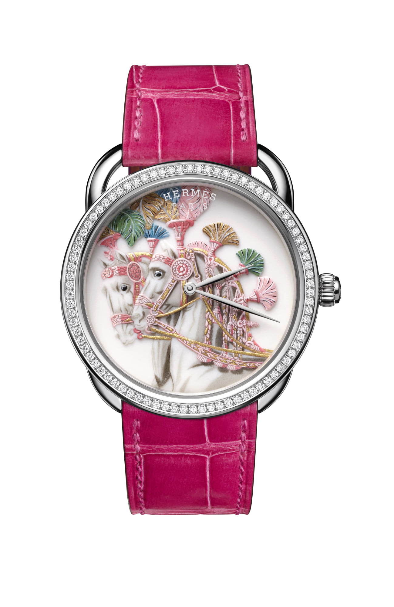 Arceau destaca por su caja redonda de asas asimétricas que recuerdan un estribo, diseñado en 1978 por Henri d’Origny. El dial cuenta con una figura ecuestre en relieve, con sombras y colores que se aplican directamente. El perfil de los caballos se graba a mano en porcelana bisquit de Limoges blanca y mate. Mientras que el esmaltado brinda brillo y textura.