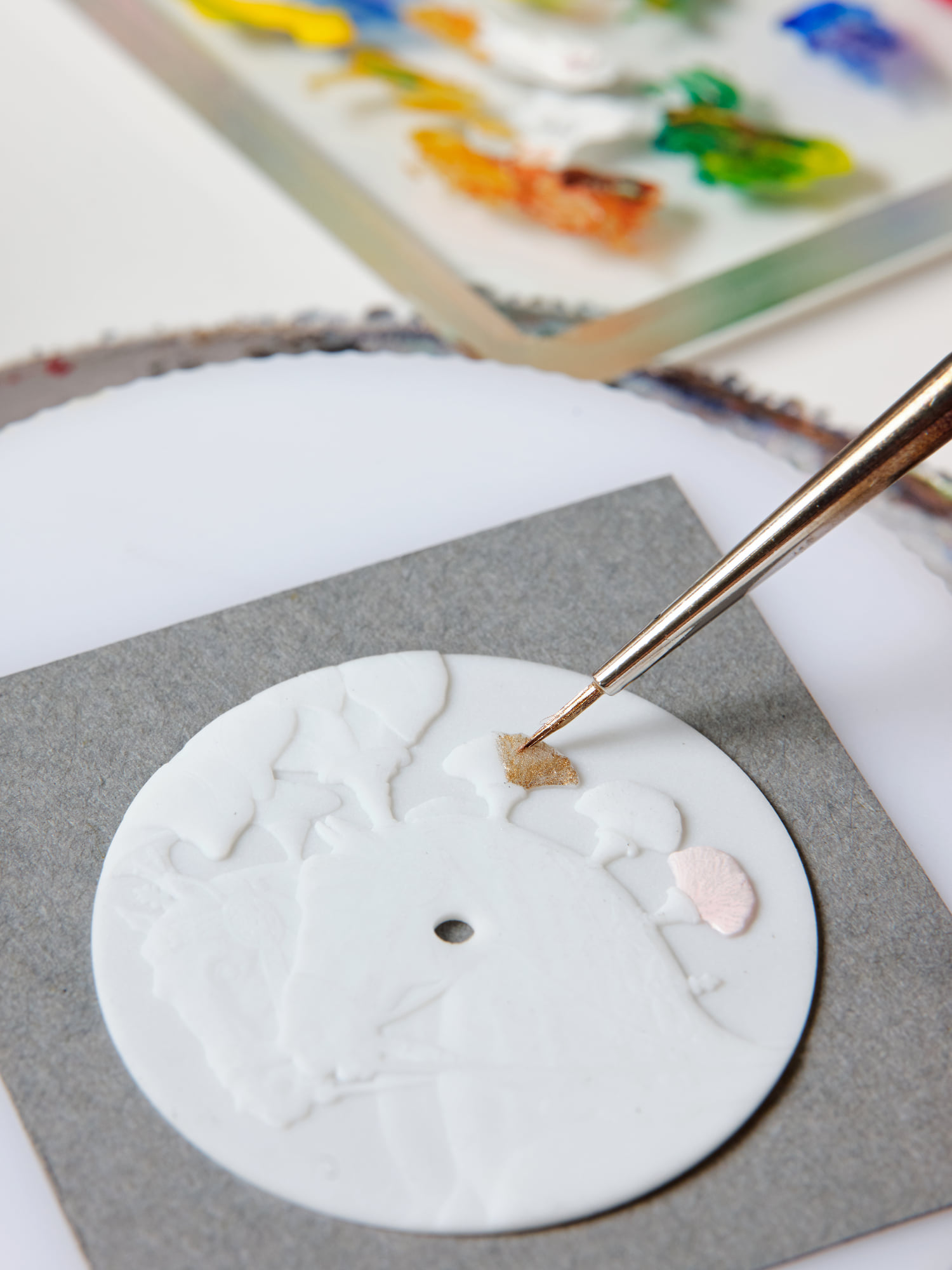 Los colores se aplican uno a uno y los tonos se logran gracias al proceso de horneado, permitiendo que el pigmento se fije y exhiba el brillo requerido.