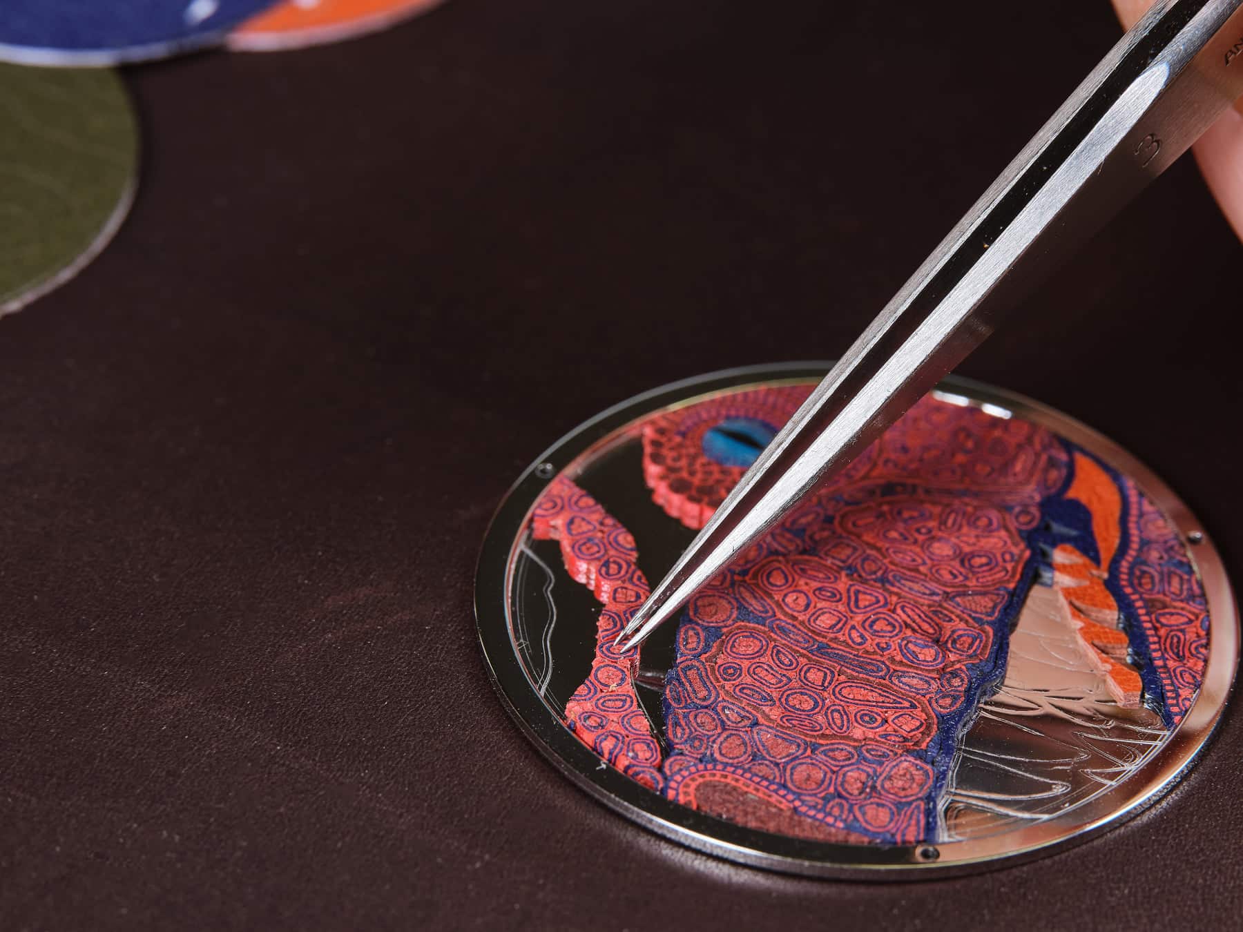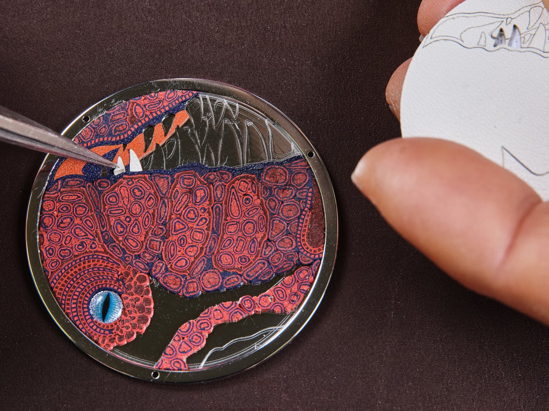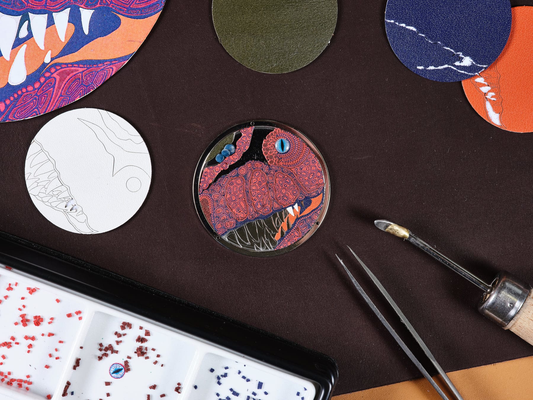 El ojo abombado del tiranosaurio, visible en los dos lados de la tapa, es un cabujón esmaltado. Las fauces y la lengua son de marquetería de cuero: finas teselas cortadas en distintos tipos de piel de colores —previamente afinada obtener un grosor de 0,5 mm— y yuxtapuestas sobre la base de esmalte. El toque final de esta pieza de marroquinería en miniatura es un cordón de piel de aligátor rojo H que, fijado al asa rectangular, realza el diseño en su conjunto.