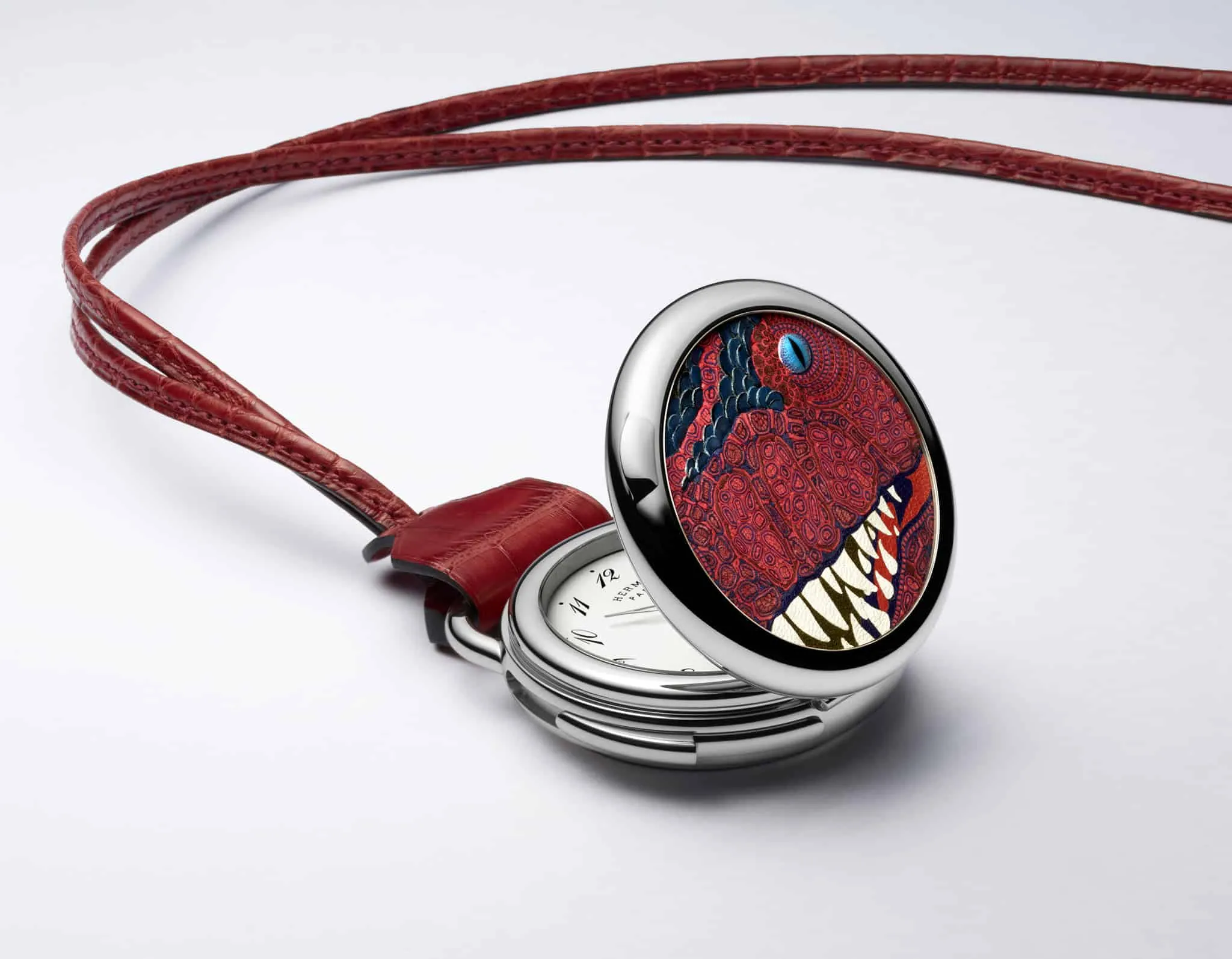 Esta pieza amplía el bestiario imaginado por la artista Alice Shirley. El rey de los lagartos tiranos, con las fauces entreabiertas y mirada alerta, cobra vida gracias a la mano experta de los artesanos de Hermès Horloger, que han dedicado un mes de trabajo minucioso para confeccionarlo con técnicas exclusivas desarrolladas en el taller de piel de la casa.