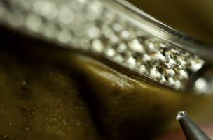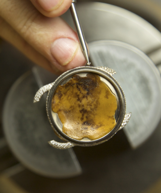 El engastado nieve (snow-setting), es una técnica que demanda pericia, pues se debe engastar cuidando a detalle que el tamaño de la superficie corresponda a las dimensiones de la piedra, sin dejar huecos entre sí, creando una armonía incomparable. La opulencia de los materiales entabla un fascinante diálogo con la delicadeza de los terminados, en donde las tradiciones y los conocimientos se encuentran y se mezclan para dotar a cada una de estas creaciones con el esplendor refinado del Japón imperial.