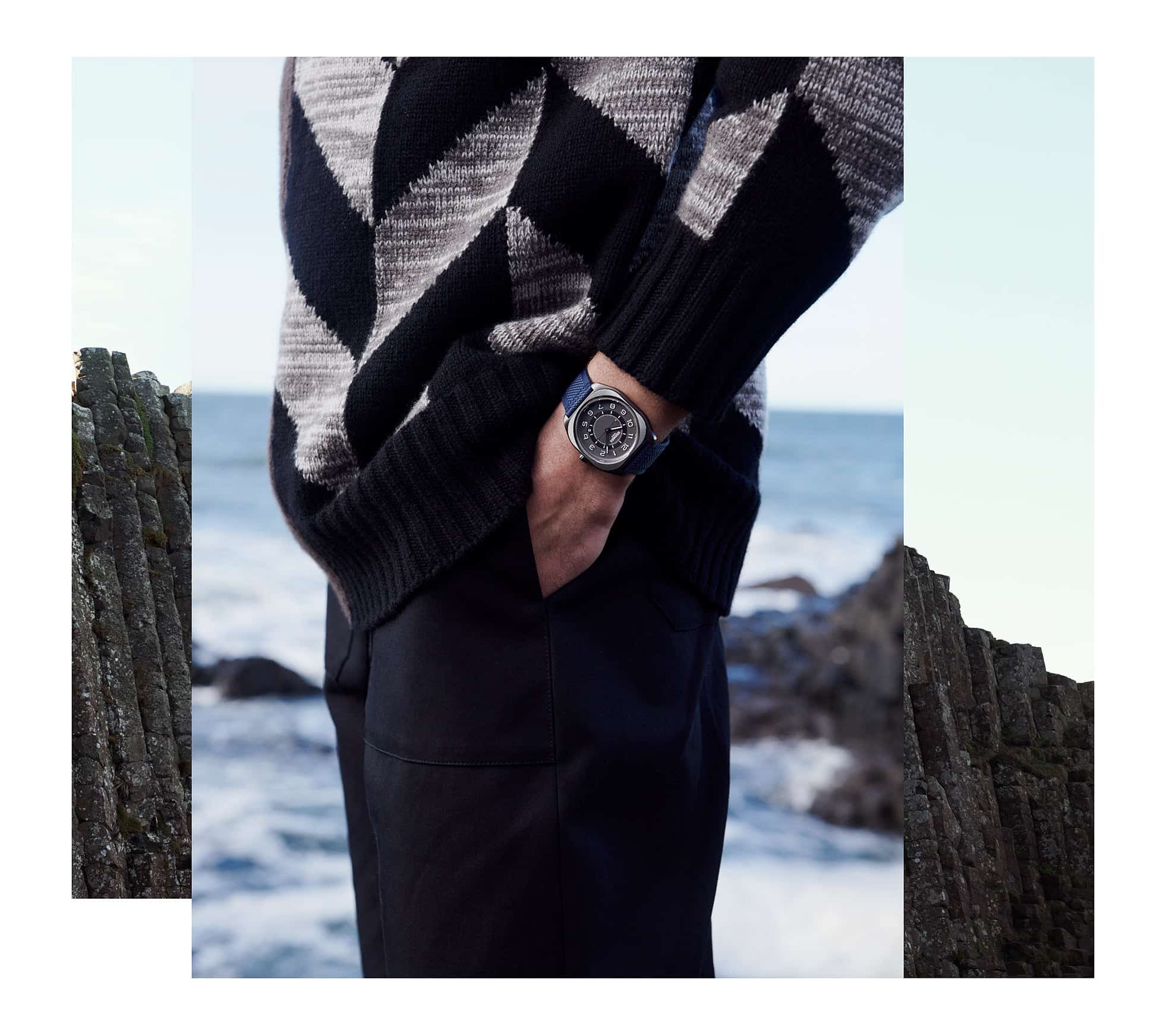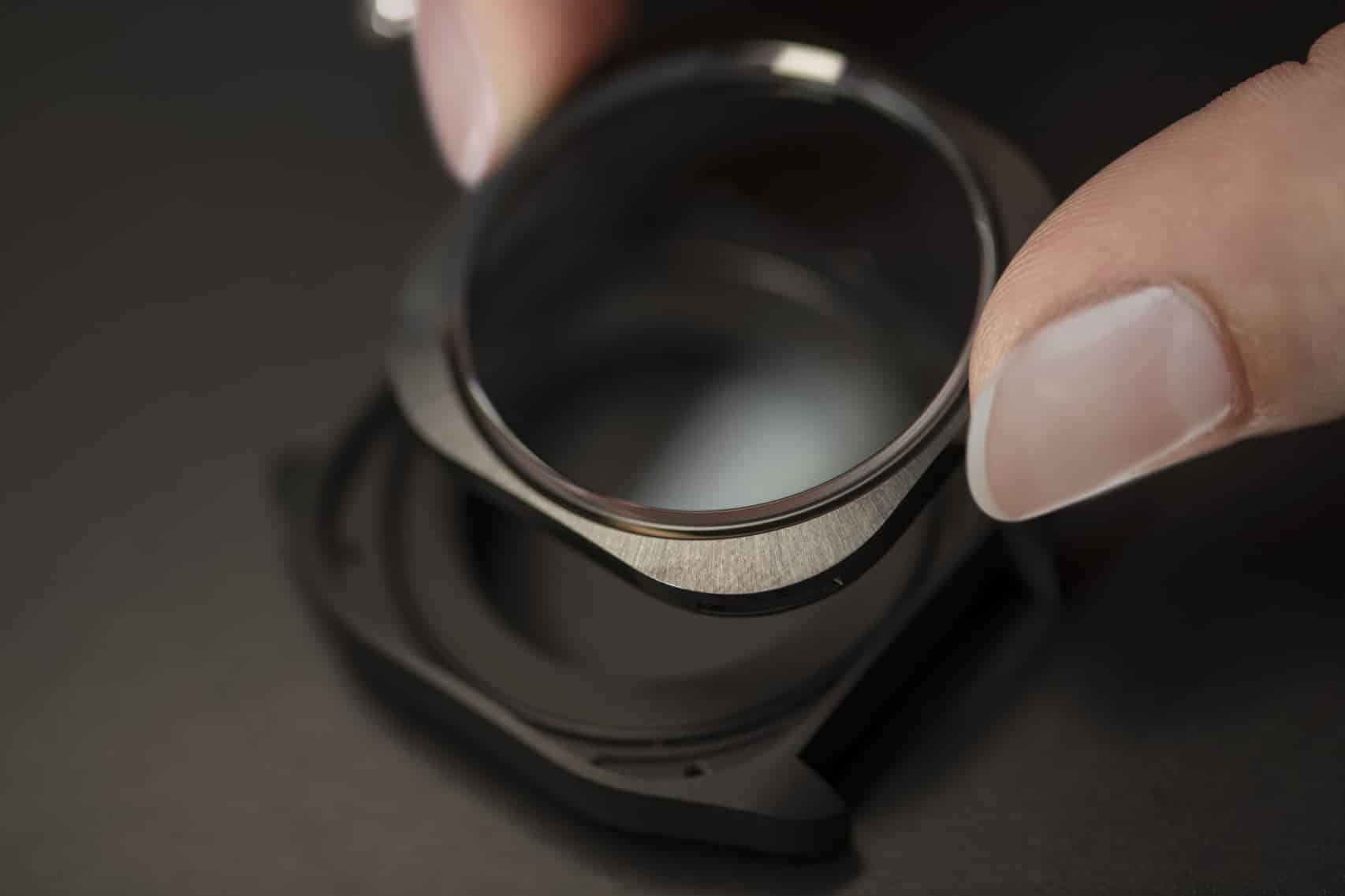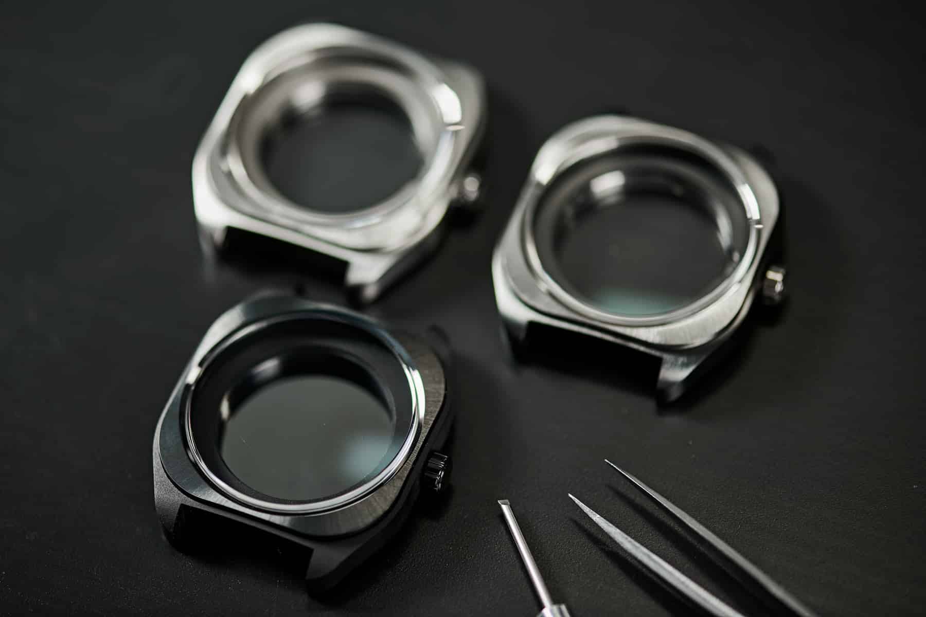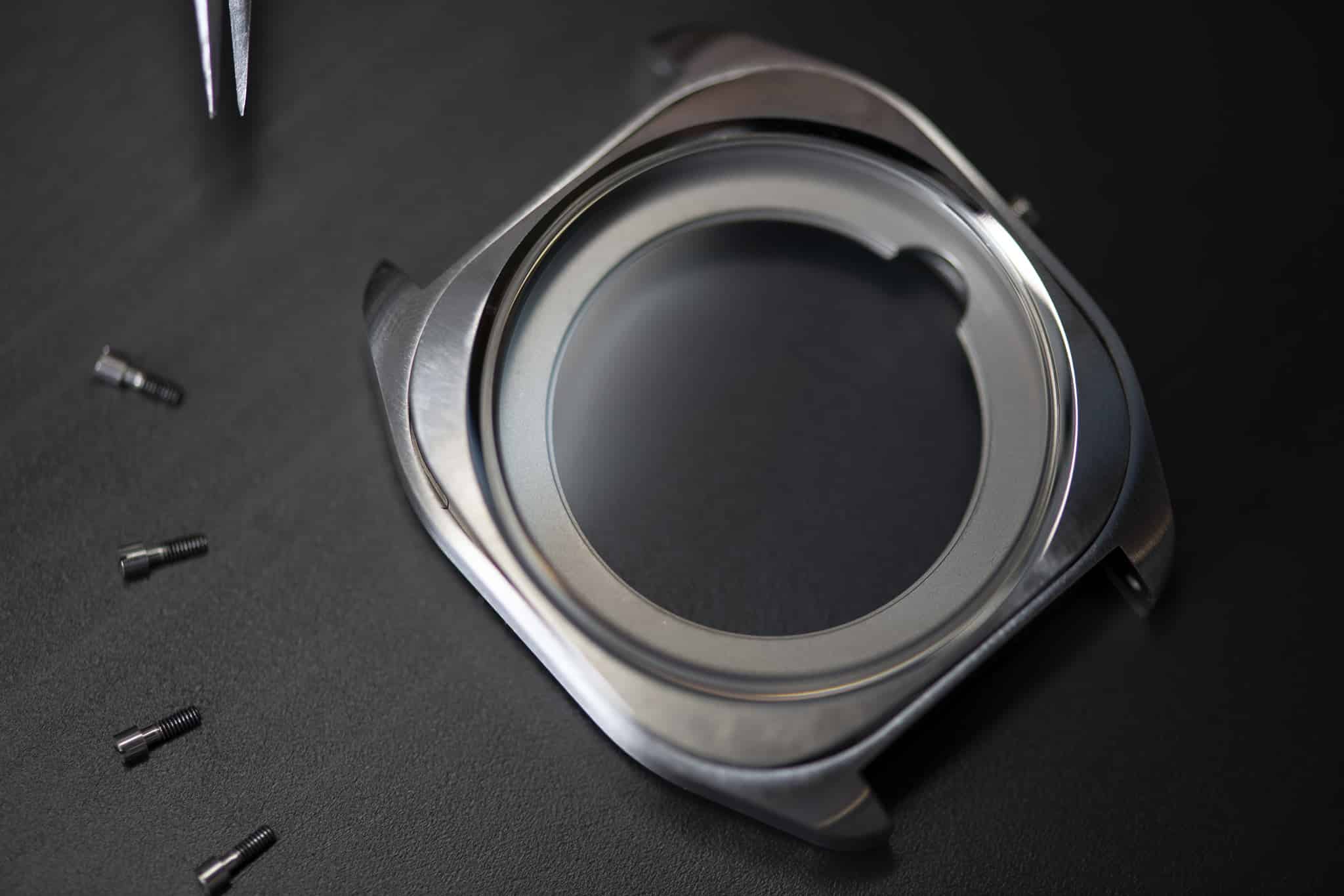 La caja, que mide 39 mm x 39 mm y tiene forma de cojín con una silueta cuadrada redondeada. El bisel, que no se eleva por encima de la carátula como un reloj deportivo, varía en grosor, mientras que los acabados satinados en vertical para los modelos de titanio contrastan con los acabados de la carátula oscura y el guiño en color naranja del segundero.