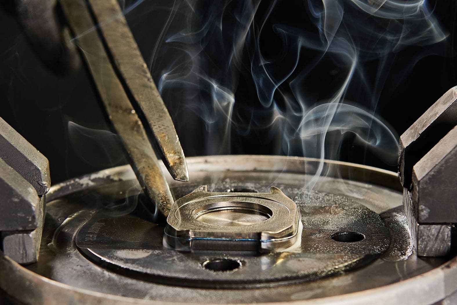 - Carátula: tres layers de oro negro con tratamiento gris, minutería de números arábigos aplicados a mano recubiertos con Super-LumiNova, fechador entre las 4 y las 5, segundero con flecha color naranja Hermès