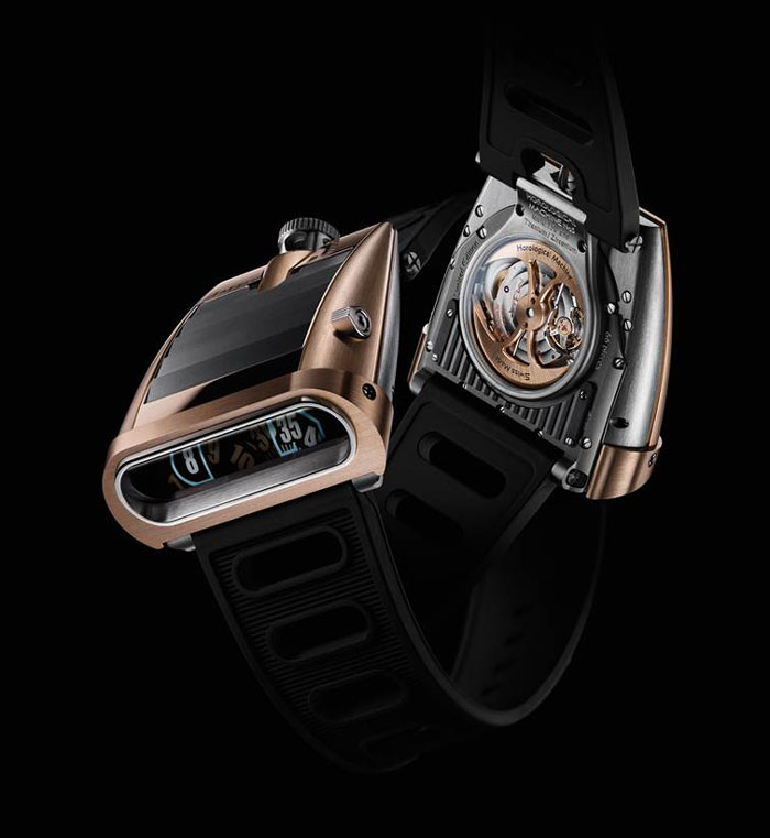 El laboratorio generado por Maximilian Büsser, ha decidido presentar para esta época del año, la más importante en cuanto al consumo, una edición de su poderoso HM5 (Horological Machin No. 5), la cual posee un movimiento de visualización vertical y ampliado, completamente hermético y que recupera la época digital de los años 70, al tiempo que se anima gracias a un movimiento íntegramente mecánico, de carga automática. Adicionalmente, las horas saltan a la “carátula”, que más bien resulta una apertura sumamente espectacular.