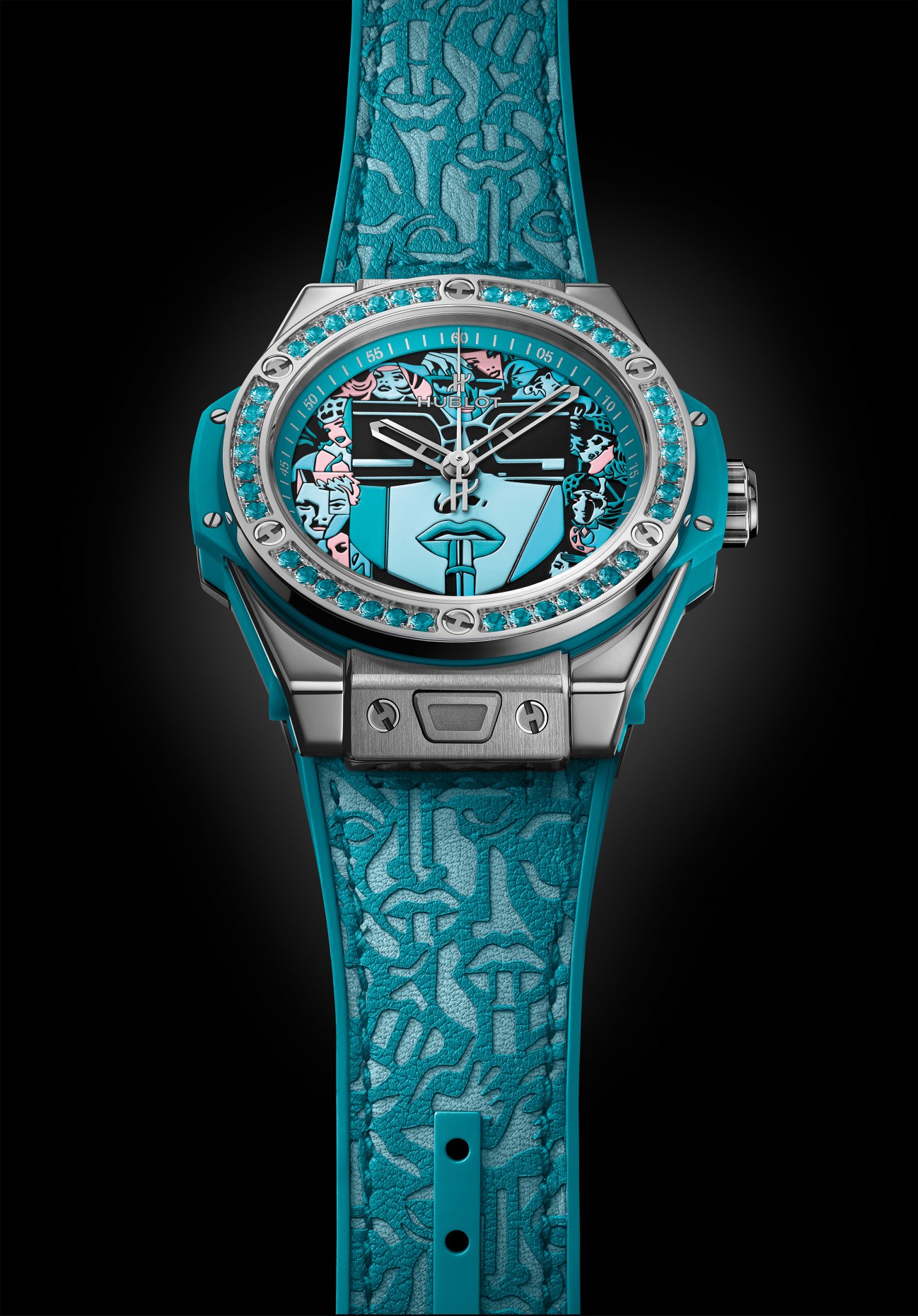 Se abraza al pulso gracias a una correa de piel de becerro color turquesa o rojo diseñada por Marc Ferrero, las cuales pueden ser intercambiadas de manera práctica gracias al sistema One Click patentado por Hublot.
