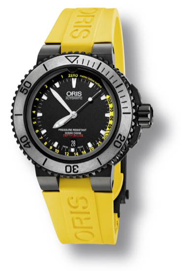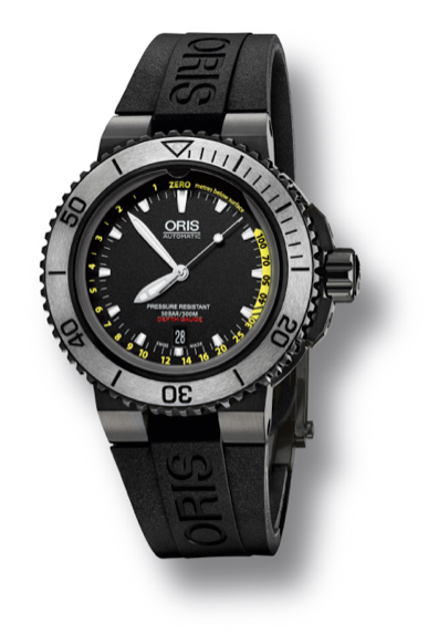 Finalmente, y antes de salir del agua, nos sumergimos en una patente para la manipulación del bisel unidireccional que le ganó a Oris recibir la aprobación de una alianza con Force Recon (Cuerpo de Marines de los Estados Unidos). El sistema consiste en que el bisel únicamente se desplazará sobre sí mismo en una dirección si previamente es levantado, por lo que dicha medida de seguridad bien podría salvar la vida de un buzo en una labor de reconocimiento. Sus dimensiones son inmensas: 49 mm para la caja, pero ideales para portar por encima de un traje de neopreno, además de estar animado por un nuevo movimiento Oris GMT con graduación de 24 horas y tratamiento DLC (Diamond Like Carbon).