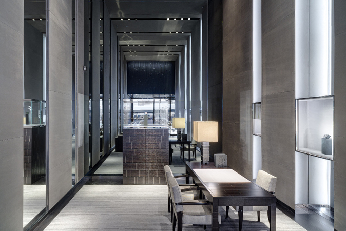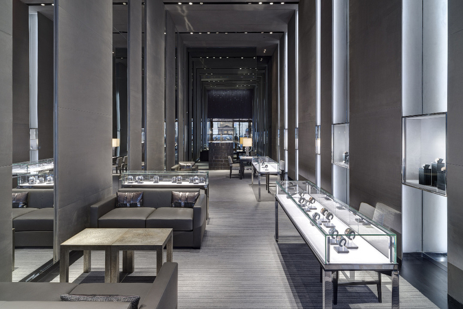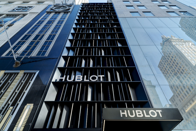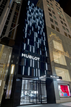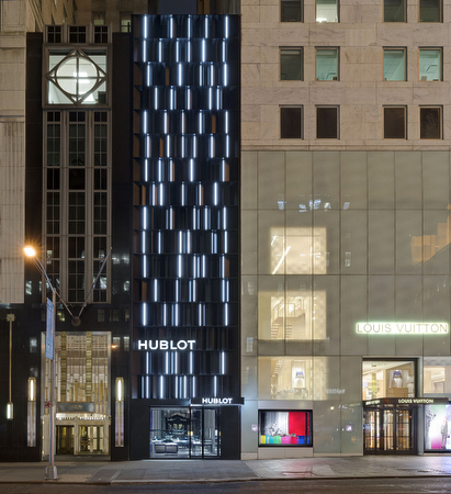 El nuevo espacio en el número 743 de la Quinta Avenida (entre las calles 57 y 58, en el centro de Manhattan) es el último ejemplo de la larga colaboración entre el arquitecto Peter Marino y Hublot, relación que comenzó en 2010 cuando Marino diseñó la parisina boutique insignia de la Place Vendôme, la primera de las cinco boutiques existentes. El diseño de la boutique neoyorquina exhibe el ADN de lujo e innovación de la marca junto a su concepto del Arte de la Fusión que da lugar a combinaciones inesperadas. La impresionante fachada, iluminada con LEDs y en la que pueden observarse facetas de paneles de aluminio negro tratado con revestimiento en polvo, se eleva hasta los 21 m por encima de la Quinta Avenida y se convierte en el edificio de la marca de mayor altura del mundo. La decoración de la boutique es un reflejo del uso que hace Hublot de materiales únicos, práctica que sigue desempeñando un papel importante en el diseño de los relojes de la marca. La superficie interior de 139 m2, la mayor de la marca en EE. UU., está decorada siguiendo un estilo contemporáneo, con suelos de madera y piedra de lava negra, mobiliario de cuero de color grafito, elementos fijos de acero inoxidable pulido y cristal, e innovaciones de alta tecnología, entre las que se incluyen vitrinas con LCD “sin sombras”, una iluminación sofisticada a la par que discreta, una pared con pantallas y, en el escaparate principal de la Quinta Avenida, un “libro” con “páginas” que pasan de forma virtual y que muestran la historia de Hublot. Un cuadro sin título del año 2014 del artista Albrecht Schnider parece “flotar” frente al espejo de color gris ahumado que va del suelo al techo en la parte posterior de la boutique. El espacio revela una fusión entre materiales de excelente calidad y una estética lujosa y moderna.