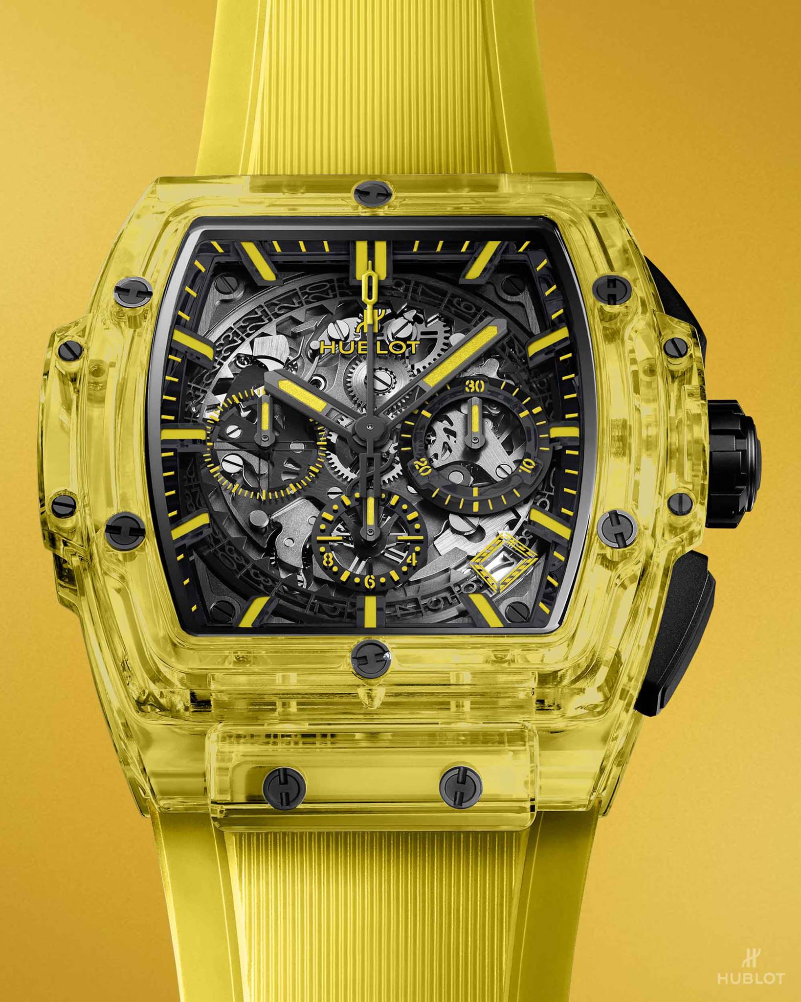El zafiro es un must para las líneas de Hublot y en este caso se presenta un cronógrafo en caja transparente colorada en tonalidad amarillo, que contrasta con el calibre mecánico automático esqueletado en color negro. Dicha pieza ofrece luminosidad excepcional y un atractivo fantástico.