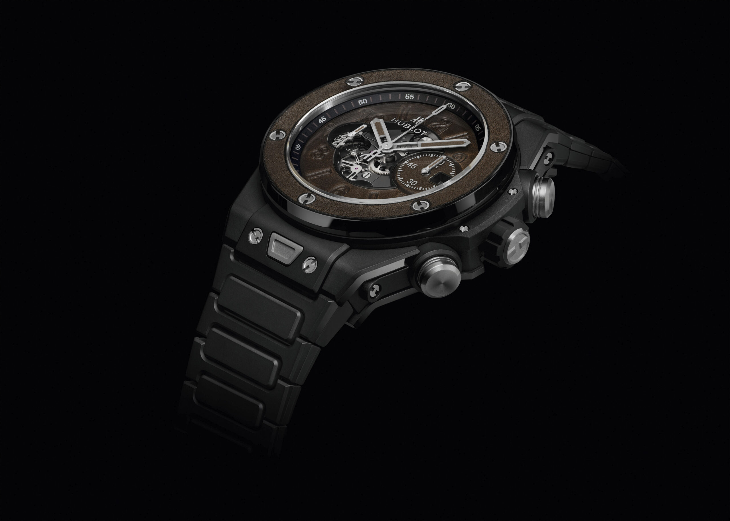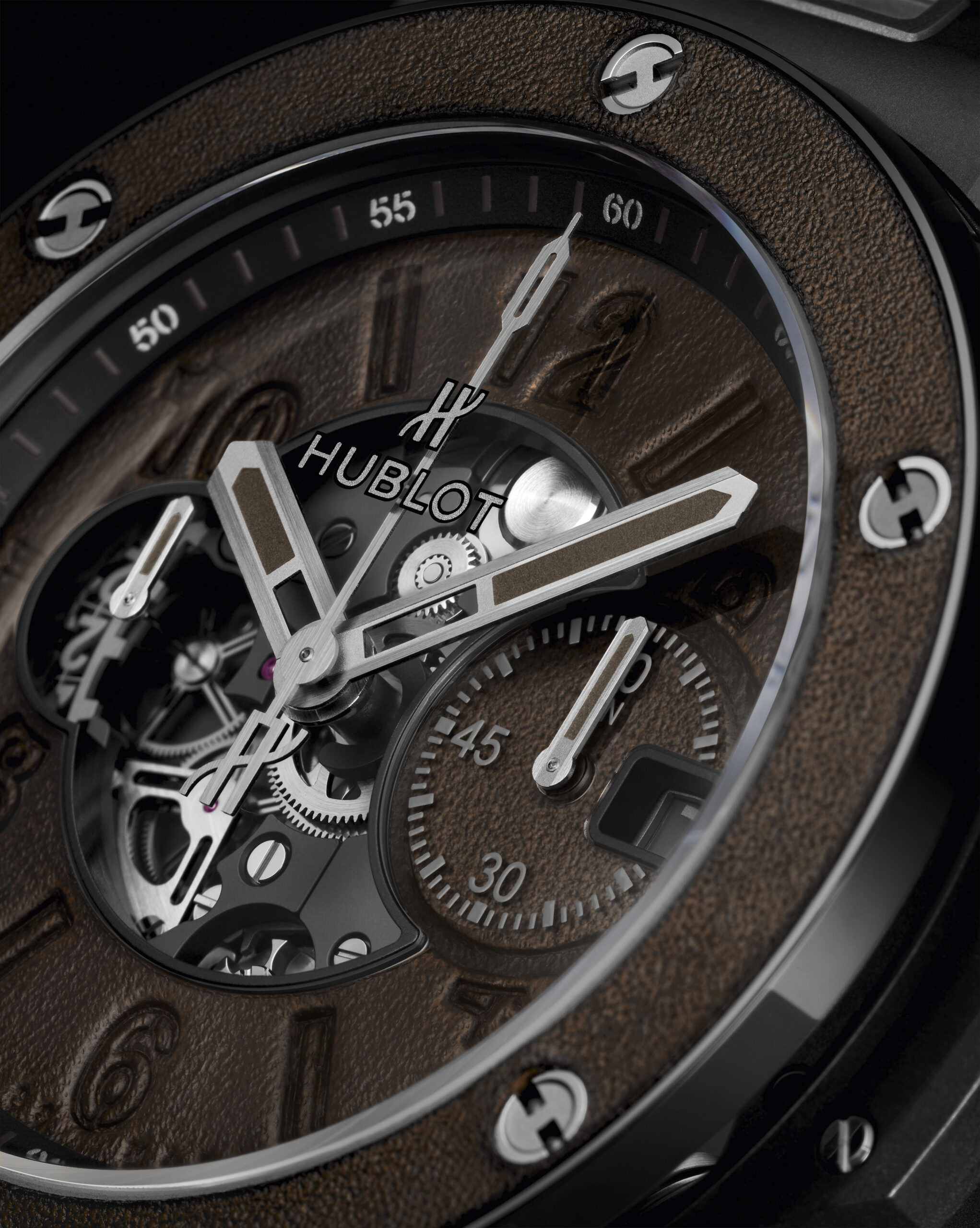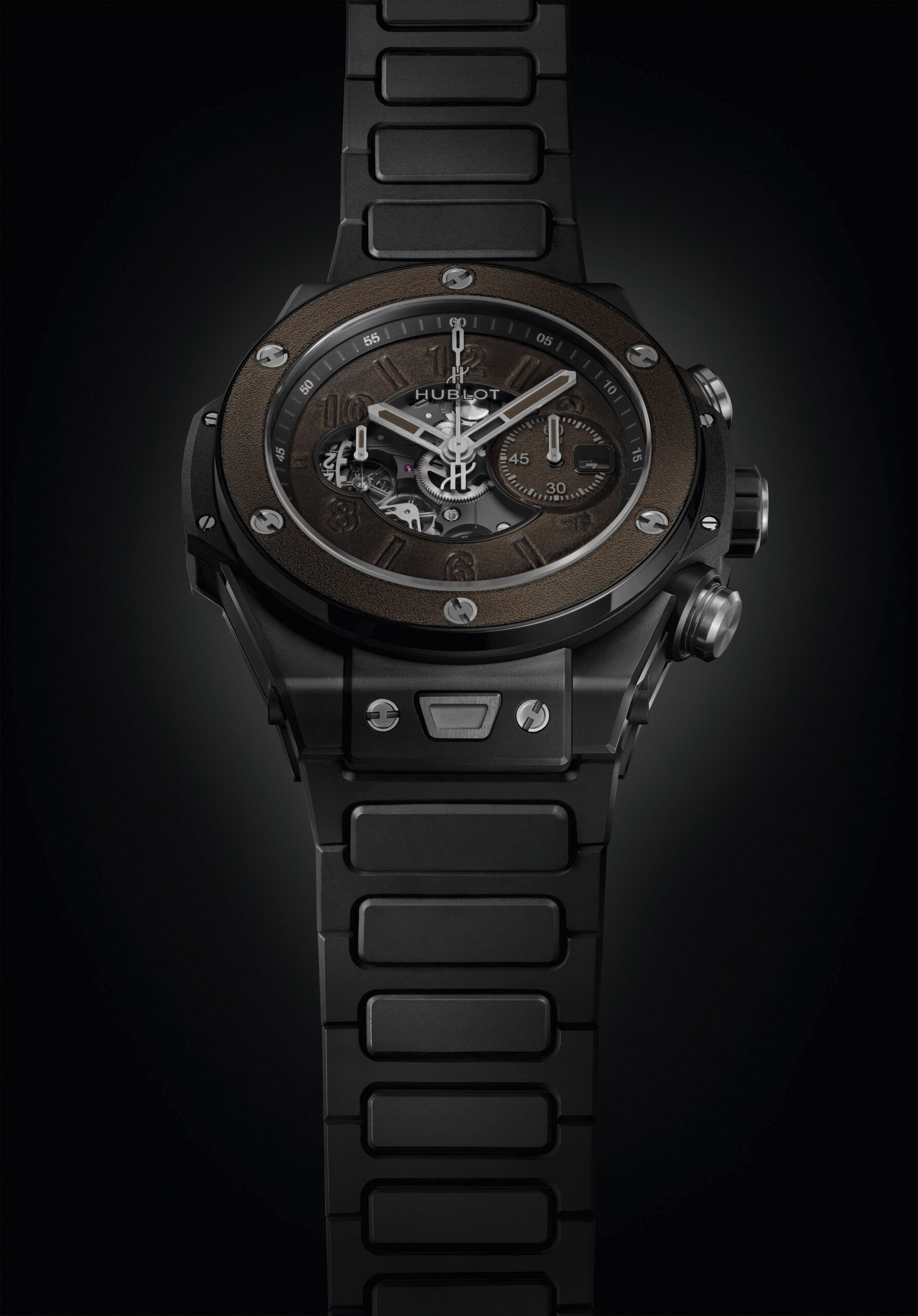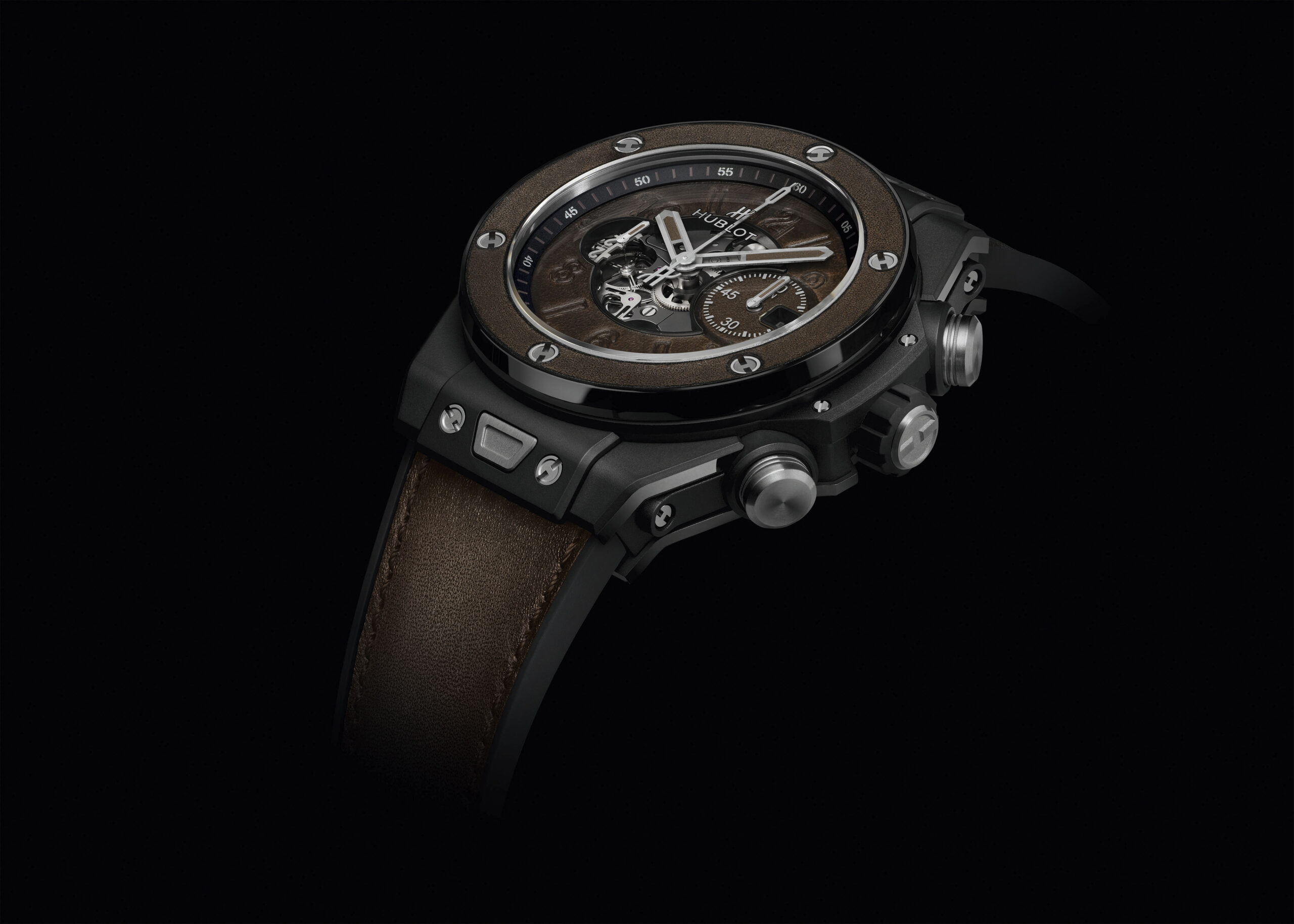Gracias a su dominio de los materiales, los ingenieros de Hublot se apoyaron en la experiencia adquirida durante las colaboraciones anteriores con Berluti para aplicar el emblemático cuero Venezia a la carátula del Big Bang Unico. El diseño del reloj integra el cuero entre dos piezas de cristal de zafiro. Cortadas por primera vez de forma que el usuario puede admirar los engranajes del movimiento Unico.