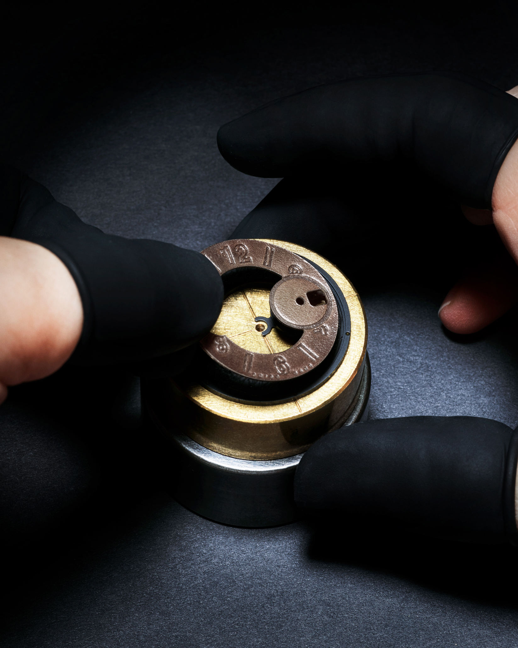 Otra de las innovaciones introducidas es que el cuero Venezia en forma de pátina Cold Brown aparece también en el bisel del reloj. Este logro ha sido posible gracias al desarrollo de un diseño completamente nuevo del bisel, en dos partes. Utilizando una resina adhesiva y rígida, la primera parte del bisel –de cuero, con un grosor aproximado de 1 mm– se inserta en la segunda, que es una base inferior de cerámica negra y a continuación se atornilla a la caja del reloj.