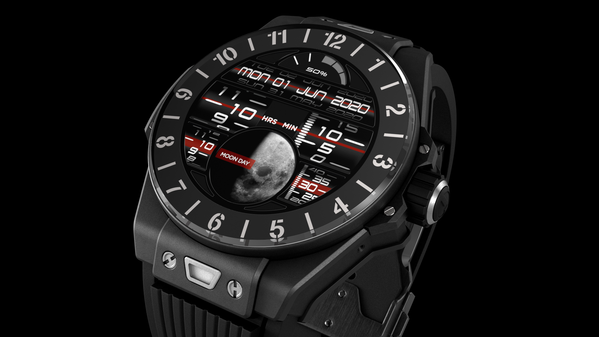 Su caja se ha realizado con materiales como la cerámica negra o el titanio siguiendo una construcción de tipo “sándwich”, una construcción innovadora ideada por Hublot en 2005. Extremadamente complejo, consta de 42 componentes, 27 de los cuales pertenecen exclusivamente al Módulo K, la “cage” que alberga el corazón digital del reloj. El diseño de los tornillos y los pulsadores, el cristal de zafiro irrayable y la correa de caucho con hebilla desplegable inventada por Hublot en 1980 para el modelo Classic, con el sistema patentado One Click para facilitar la intercambiabilidad, no dejan lugar a dudas: elemento a elemento, queda claro que se trata de un auténtico Big Bang.