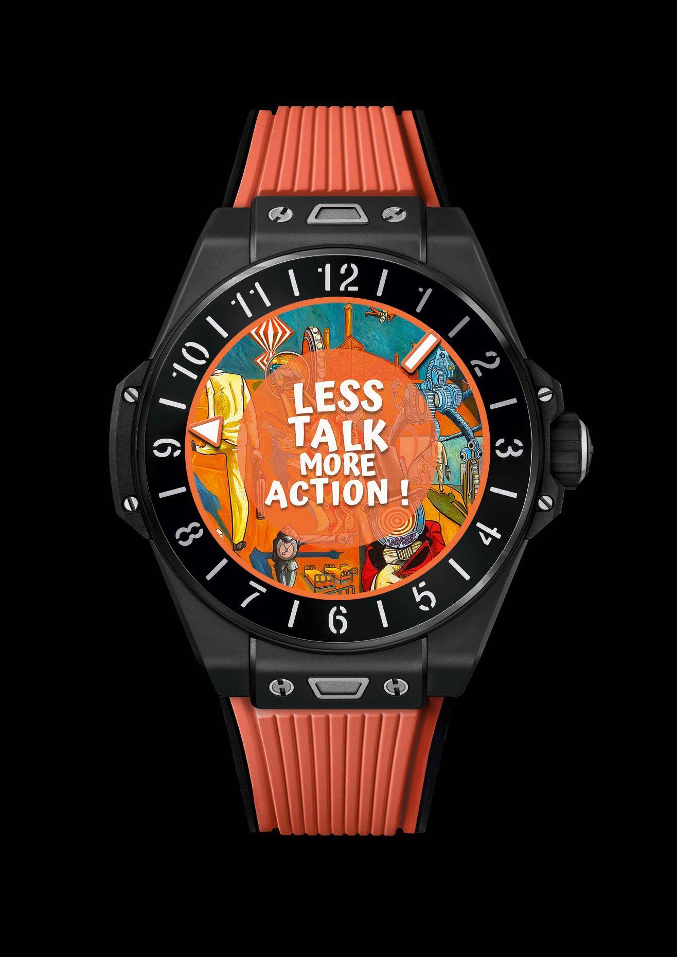 Ya disponible, la primera edición forma parte del movimiento #HublotLovesArt: una serie de ocho esferas surgidas de la imaginación de Marc Ferrero, artista creador del Storytelling Art. La esfera cambia de color cada tres horas, lo que implica la aparición secuencial de 8 creaciones a lo largo de un periodo de 24 horas. Cada una de ellas está basada en un color específico: Happy Yellow (amarillo alegre), Magic Blue (azul mágico), Orange Dynamite (naranja explosivo), All White (blanco total), Lucky Green (verde de la suerte), Magic Red (rojo mágico), Rainbow Spirit (espíritu del arco iris) y Black Magic (magia negra). Y aún hay más. Cada hora completa transcurrida se señala con la aparición de una animación que dura cinco segundos. Una forma muy #HublotLovesArt de añadir un toque de color y ritmo a distintos momentos a lo largo del día.