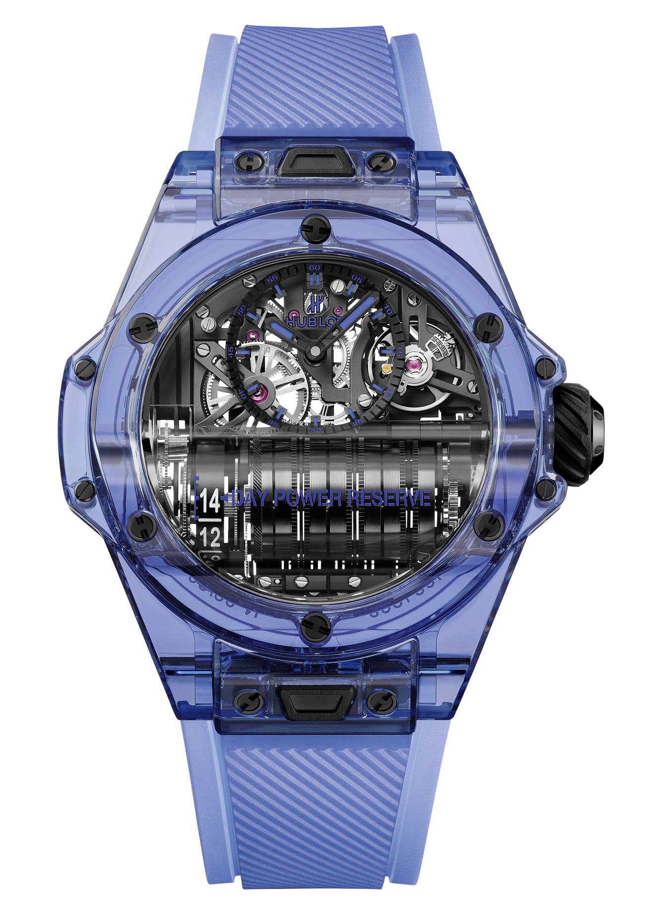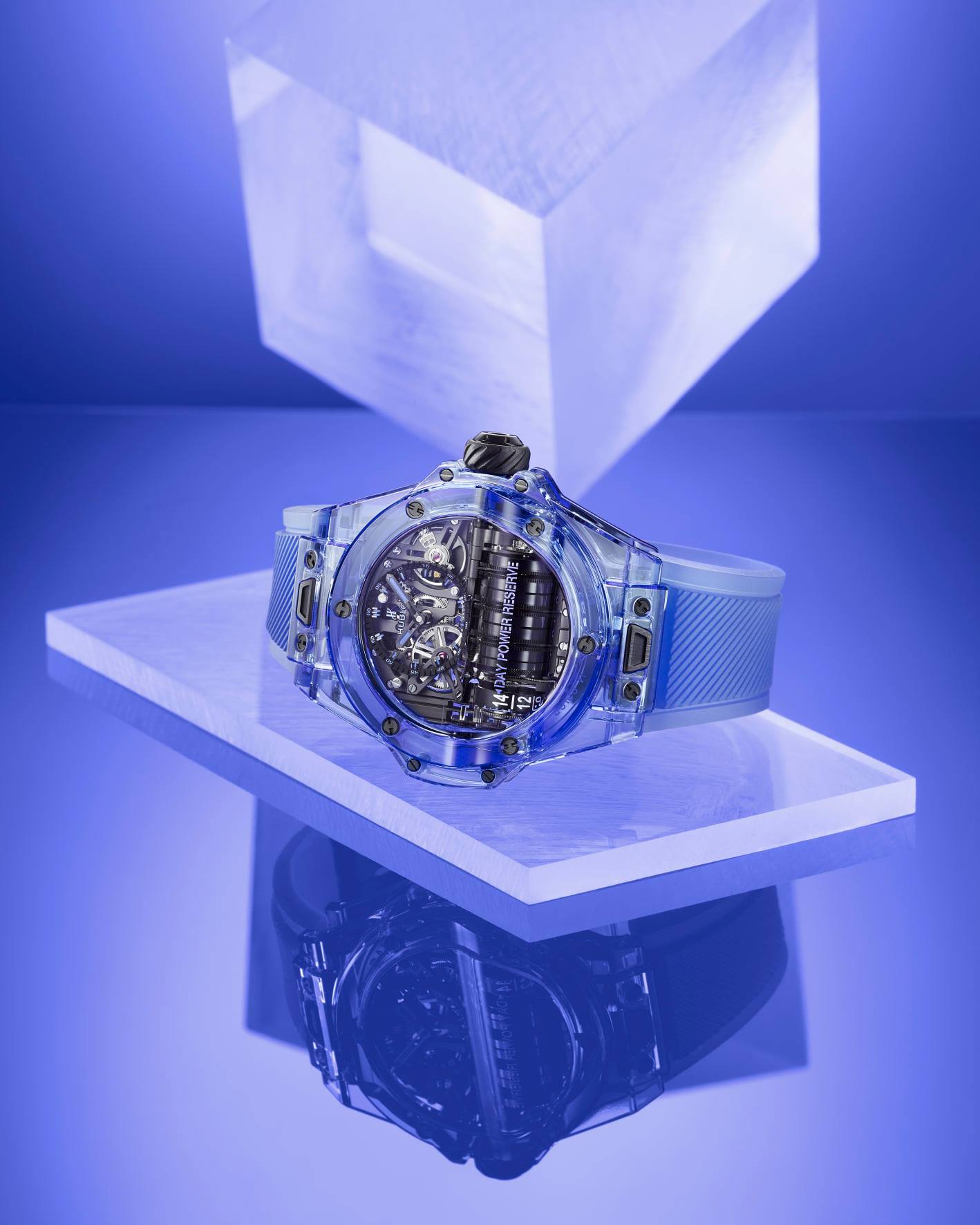 Big Bang MP-11 Blue Sapphire, también presentado como una Limited Edition de 50 unidades, que juega con las transparencias y adopta su resplandor e inimitable color de uno de estos zafiros sintéticos.