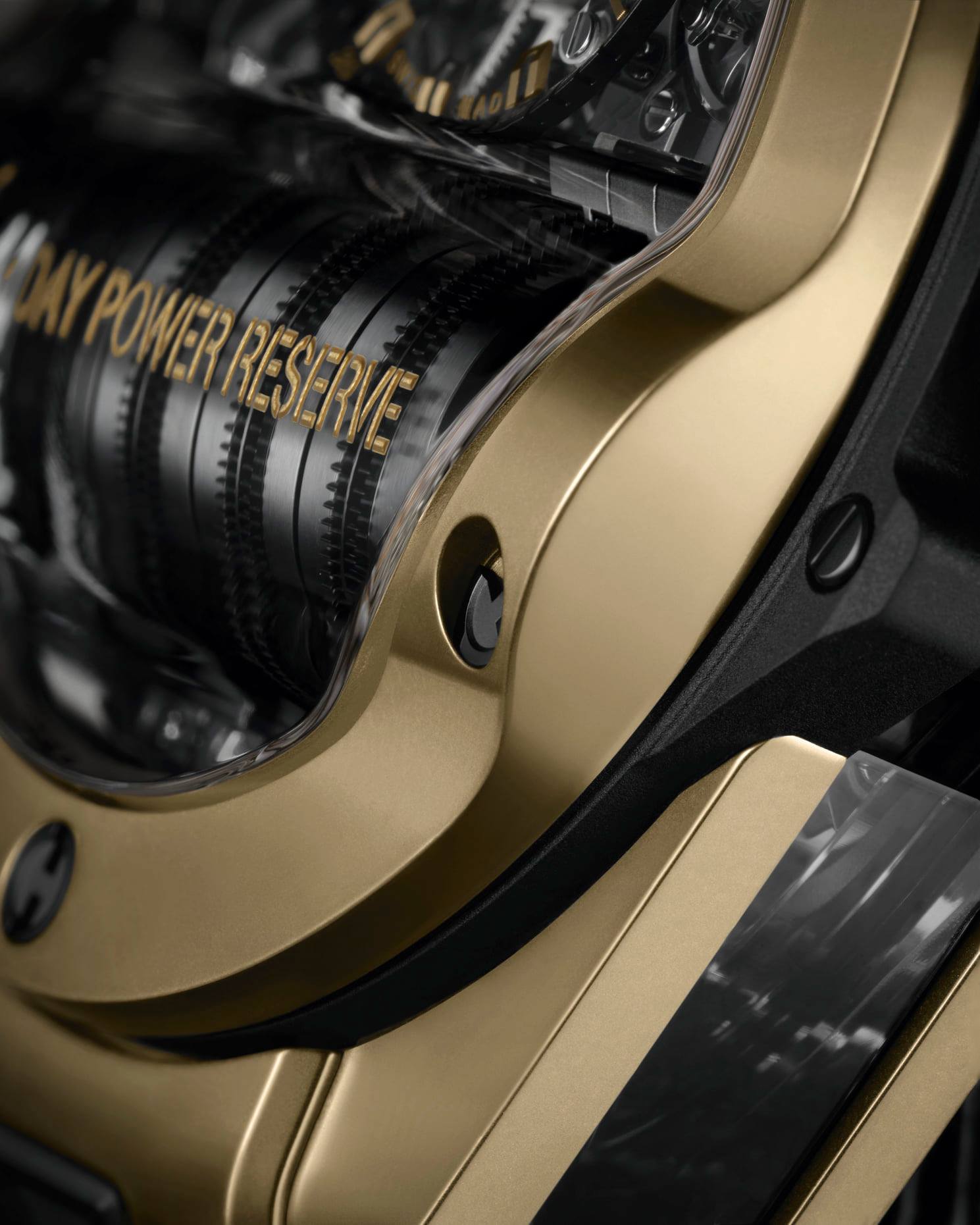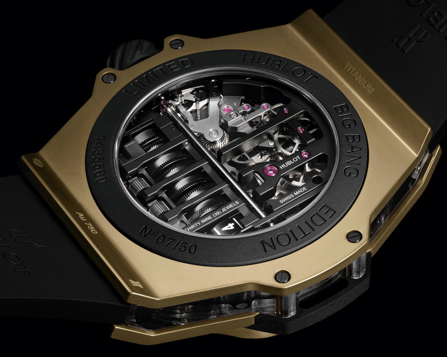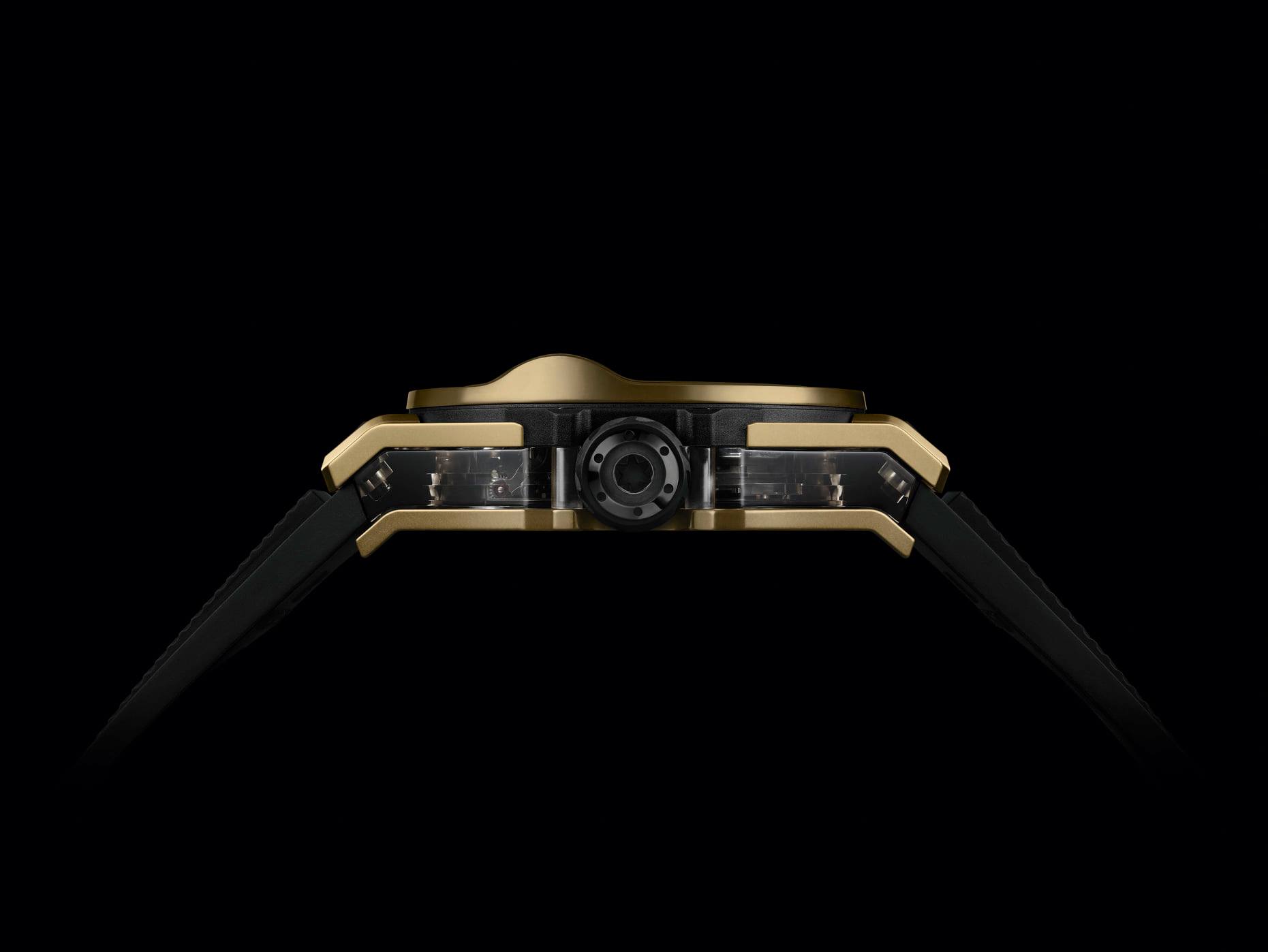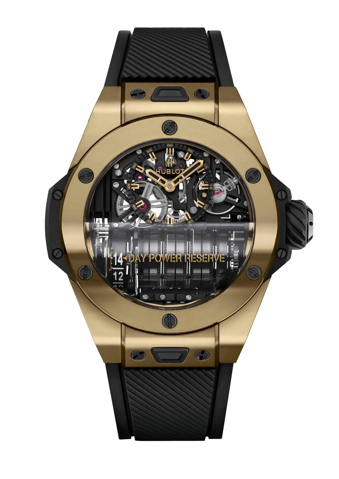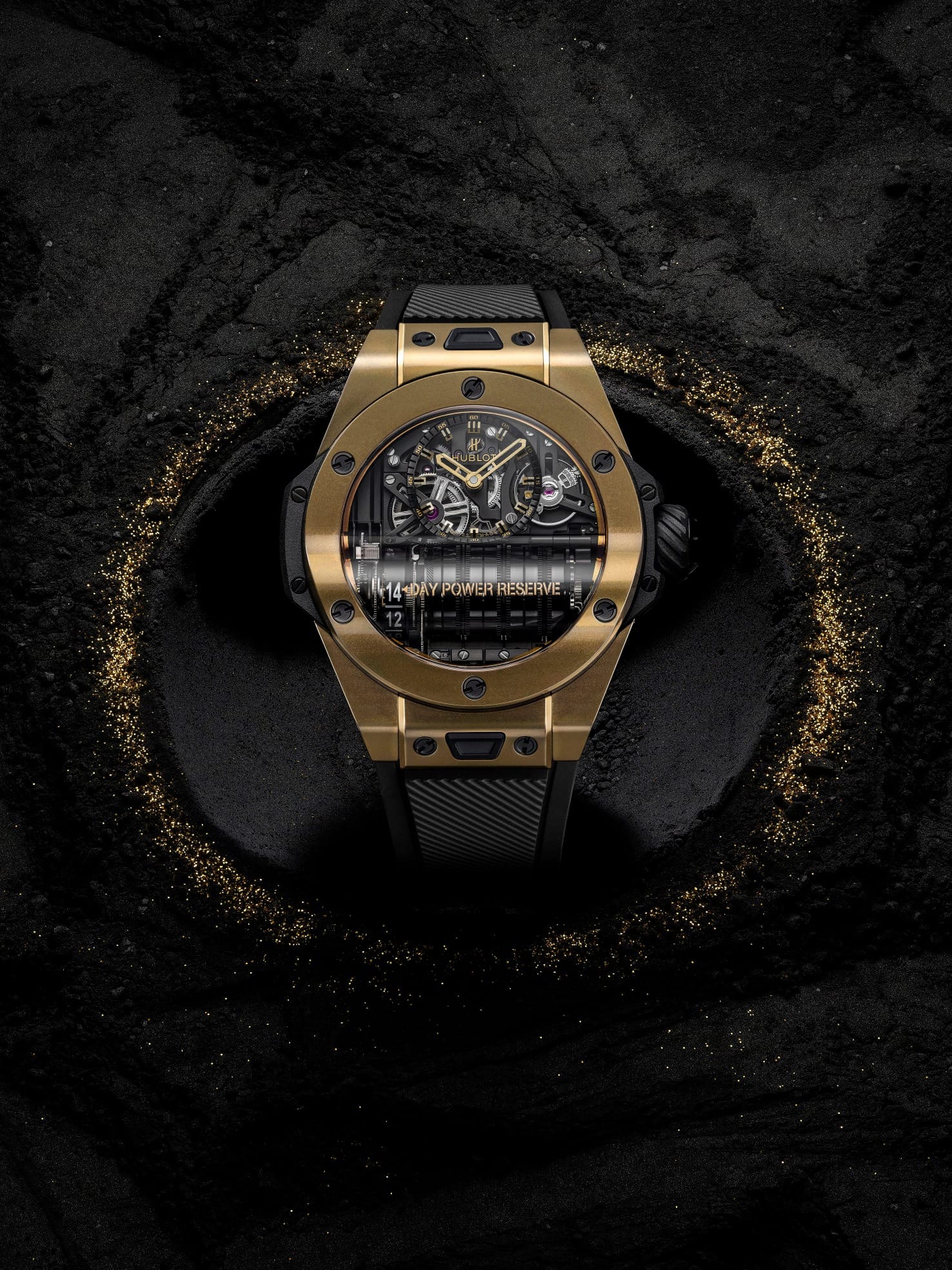 Big Bang MP-11 Magic Gold está disponible como Edición Limitada de 50 unidades, y reinterpreta el diseño contemporáneo y altamente técnico de la caja del Big Bang con el primer modelo del mundo en incorporar oro irrayable de 18 quilates, una aleación inventada y patentada por Hublot. El exclusivo color del Magic Gold se intensifica en el bisel gracias al contraste con los seis tornillos de titanio con forma de H tratados en negro. La fusión de una caja de oro de 18 quilates y una correa de caucho negro sirve para recordar que Hublot fue la primera marca en combinar con atrevimiento estos dos materiales en el mismo reloj en 1980, época en la que ambos elementos se consideraban incompatibles.