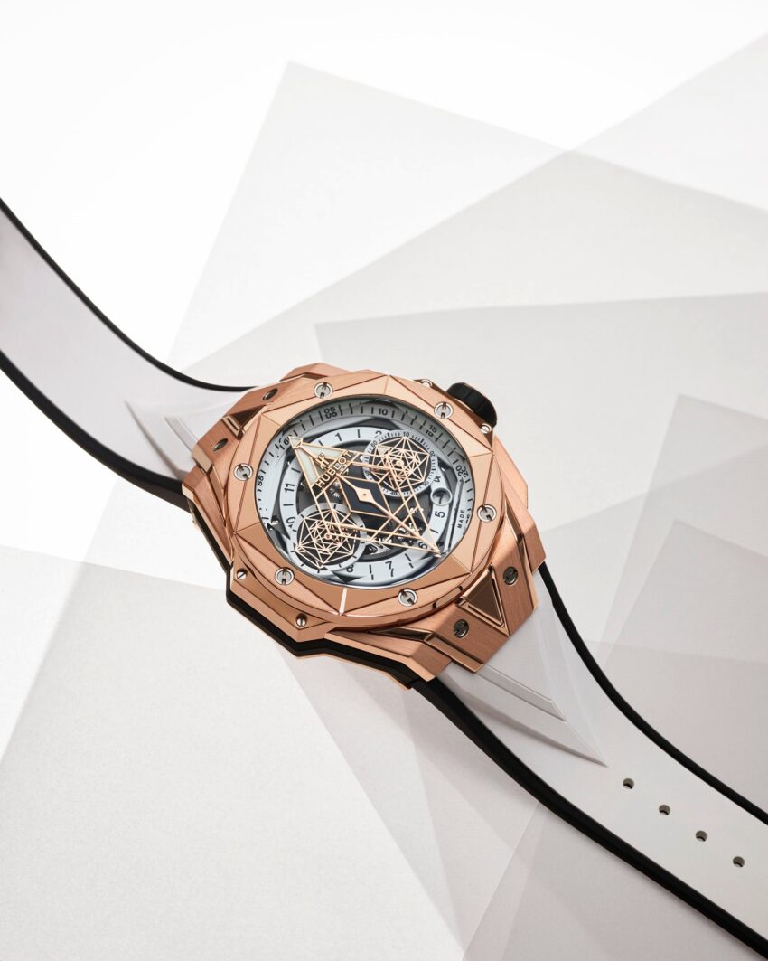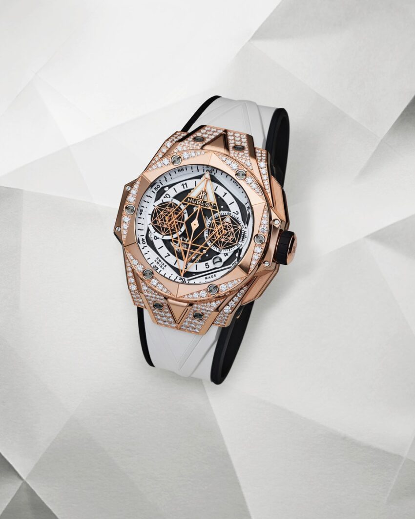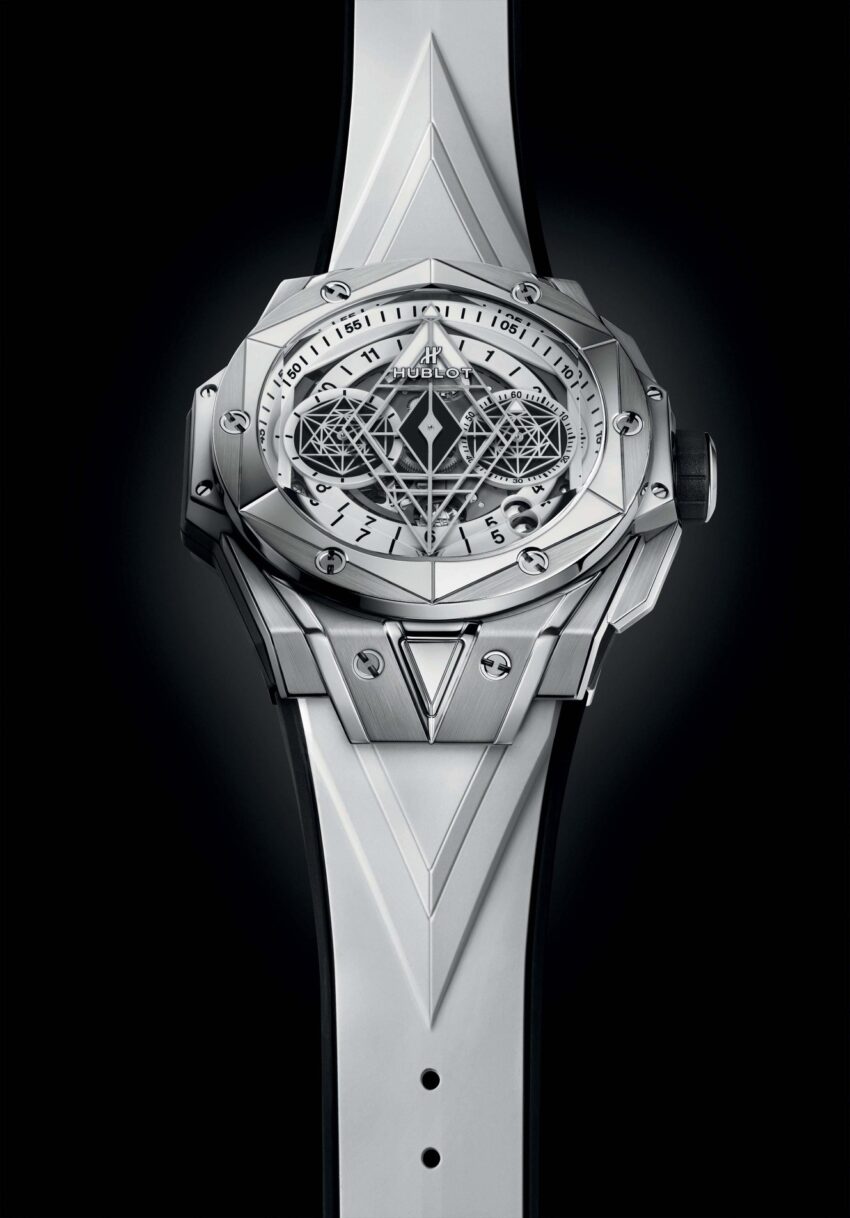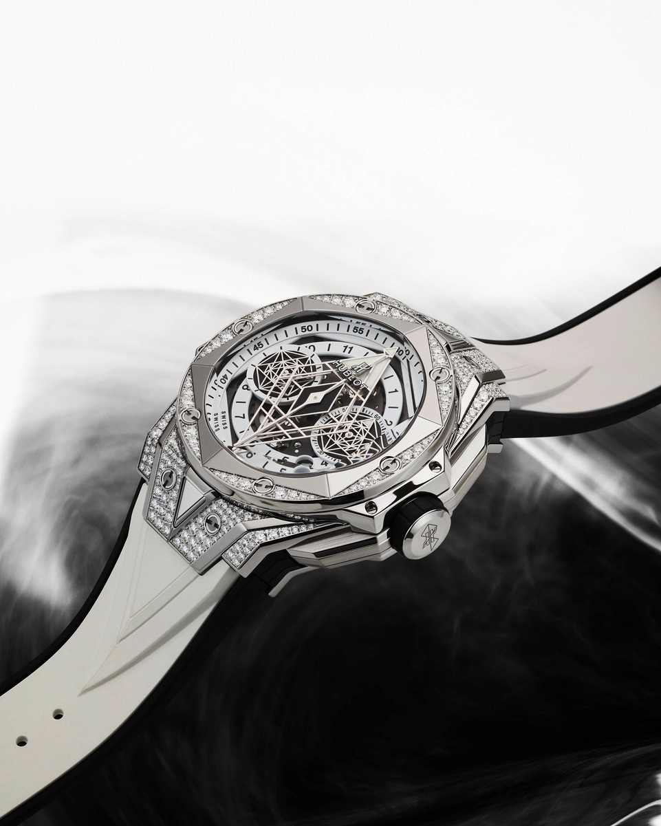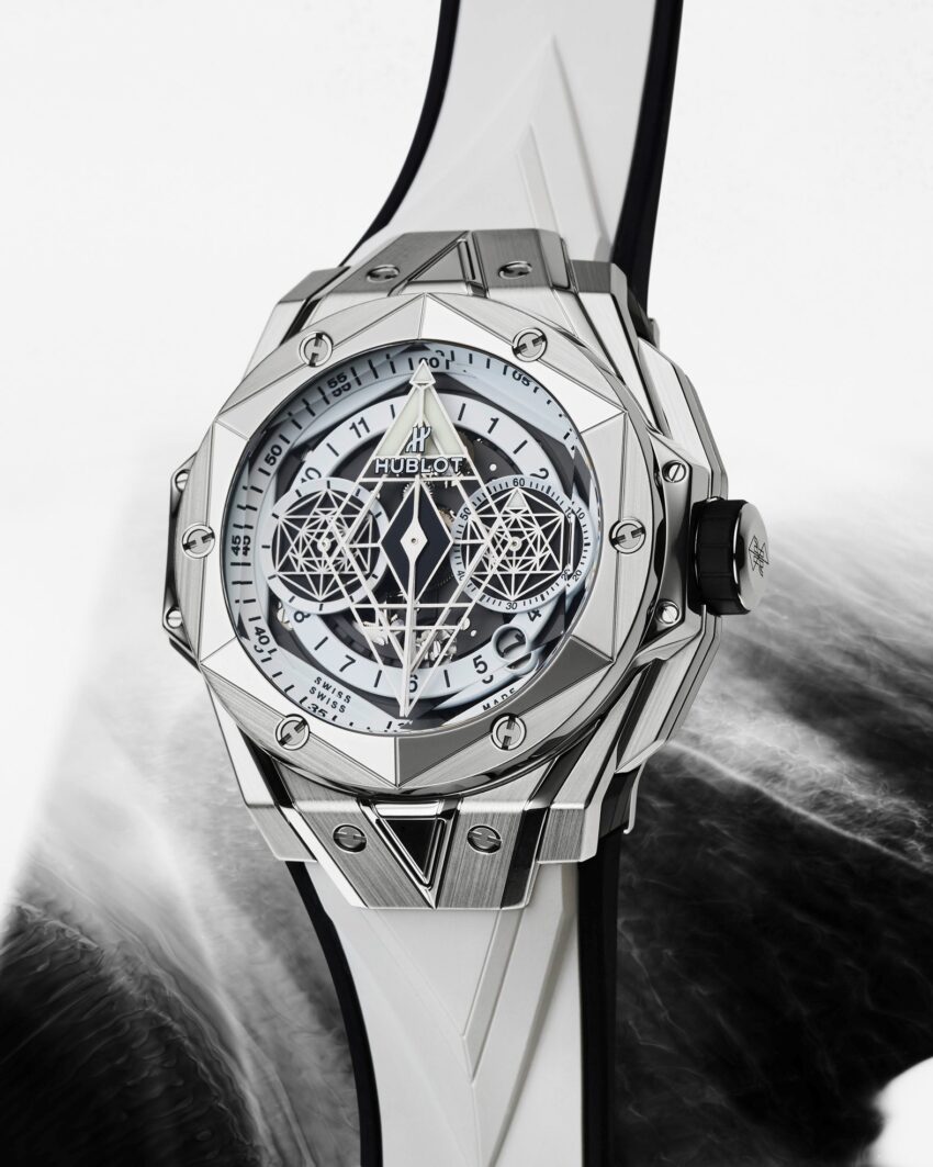 Detrás de todos estos ángulos, facetas y líneas, el maestro del tatuaje ha tallado y cincelado el material del Big Bang Sang Bleu II, desde la caja hasta el bisel hexagonal, desde el cristal de zafiro a las agujas. Un reloj de 45 mm de diámetro que revela la perfección y el equilibrio de las formas y recuerda la mira y el gesto de un esteta. Aunque sigue siendo reconocible el espíritu de la cuadratura del círculo que daba vida al primer ejemplar nacido de la colaboración entre Hublot y Sang Bleu, el nuevo ejemplar invita a los hexágonos, triángulos y rombos a adaptarse a la redondez en modo tridimensional.
