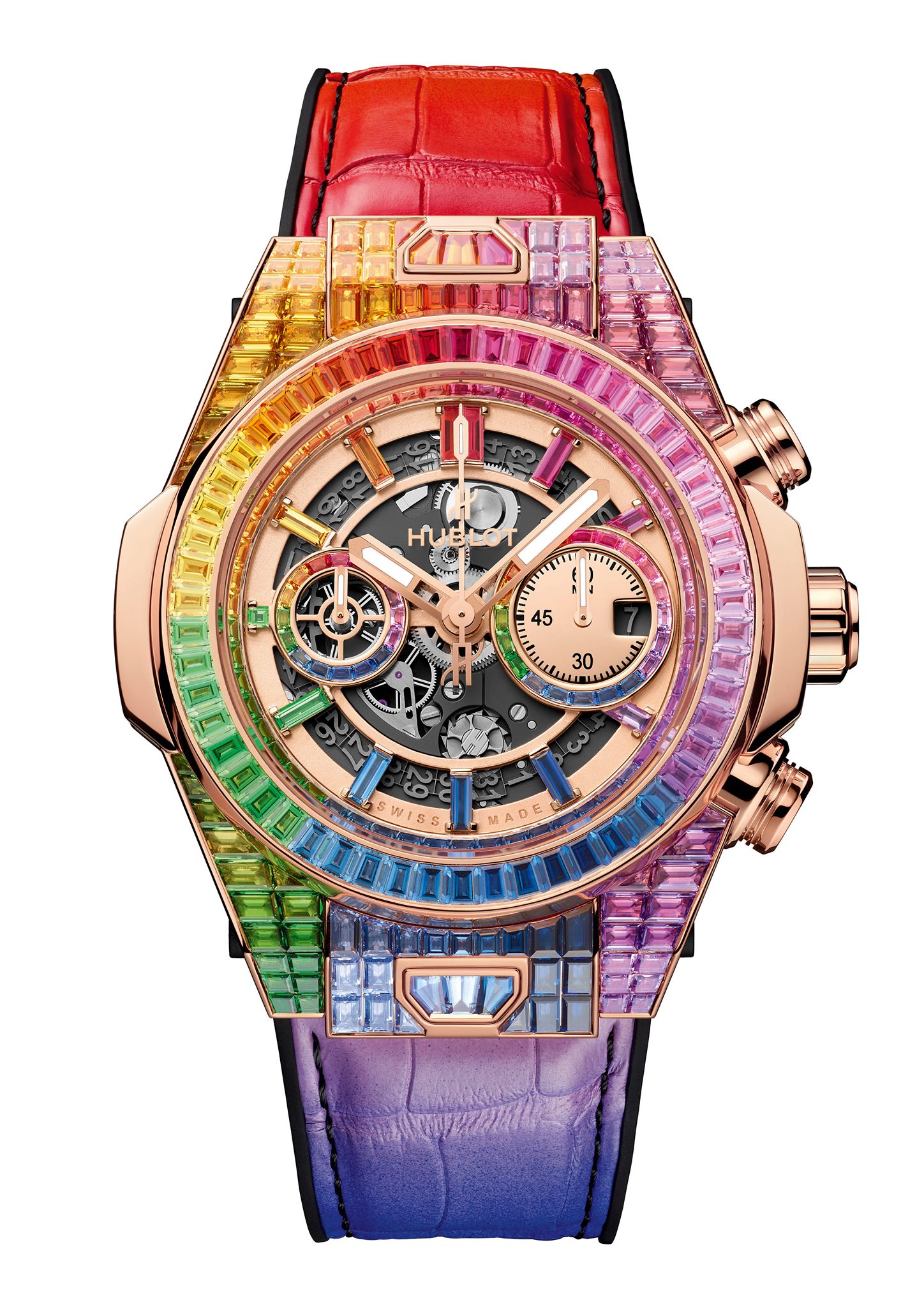 Los relojes Rainbow se han convertido en un clásico dentro de Hublot, este año –tan solo– se han presentado tres ejecuciones bajo este estilo: Spirit of Big Bang, Big Bang e, y ahora Big Bang Unico Full Baguette en oro King Gold.