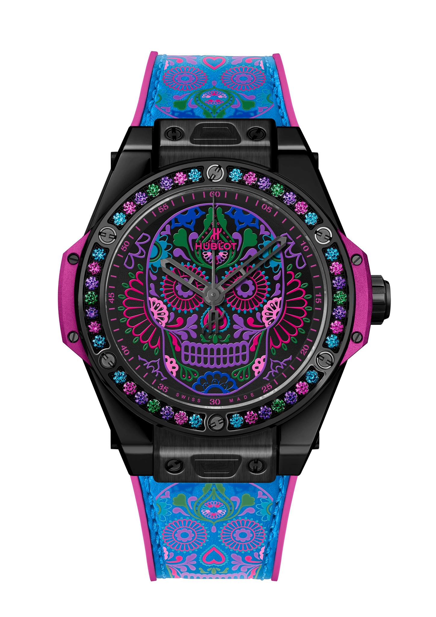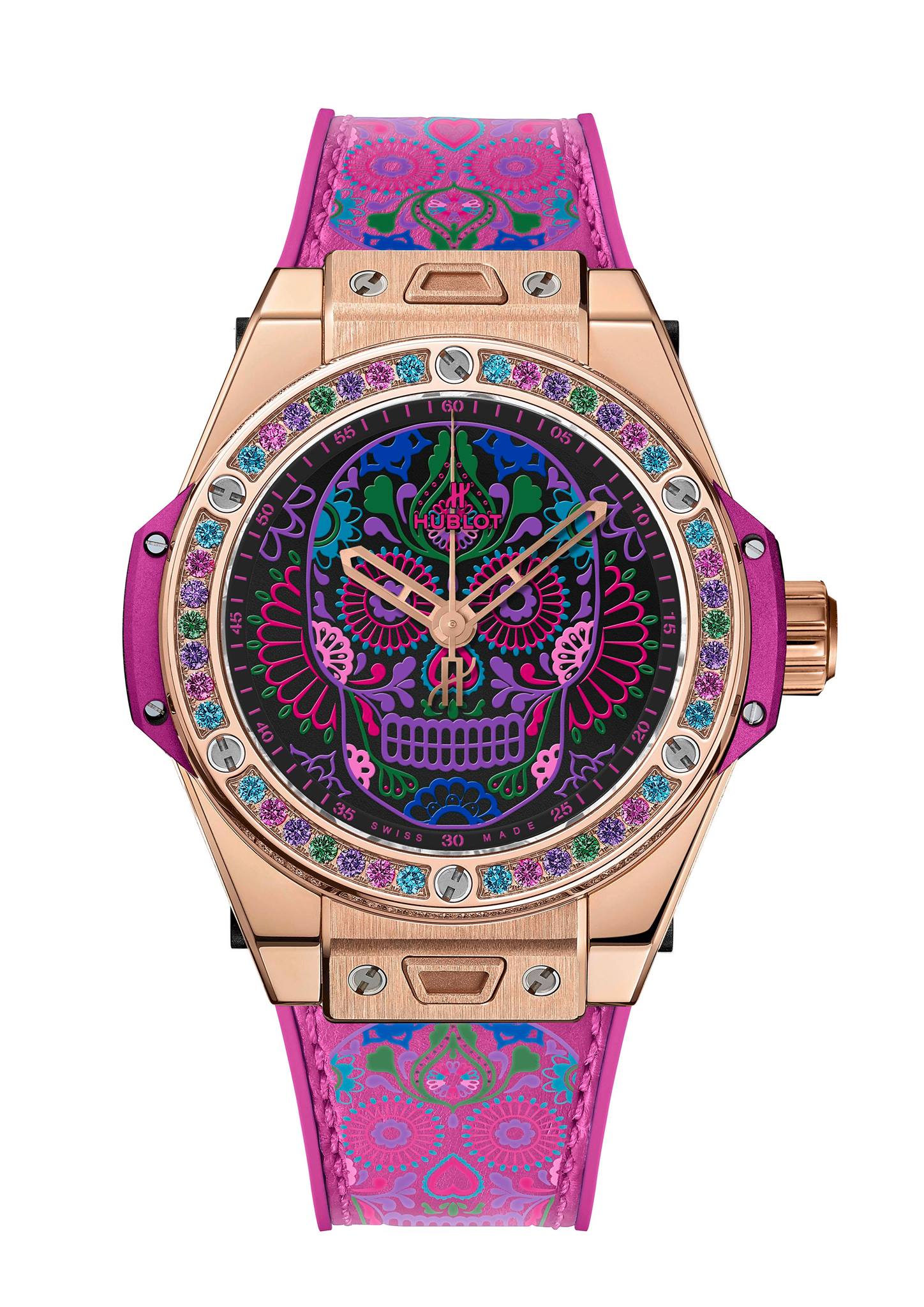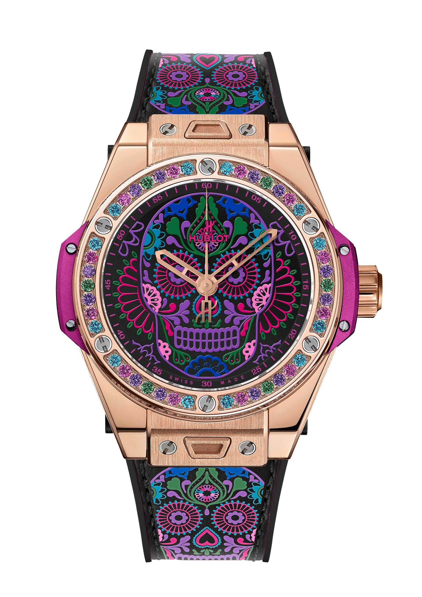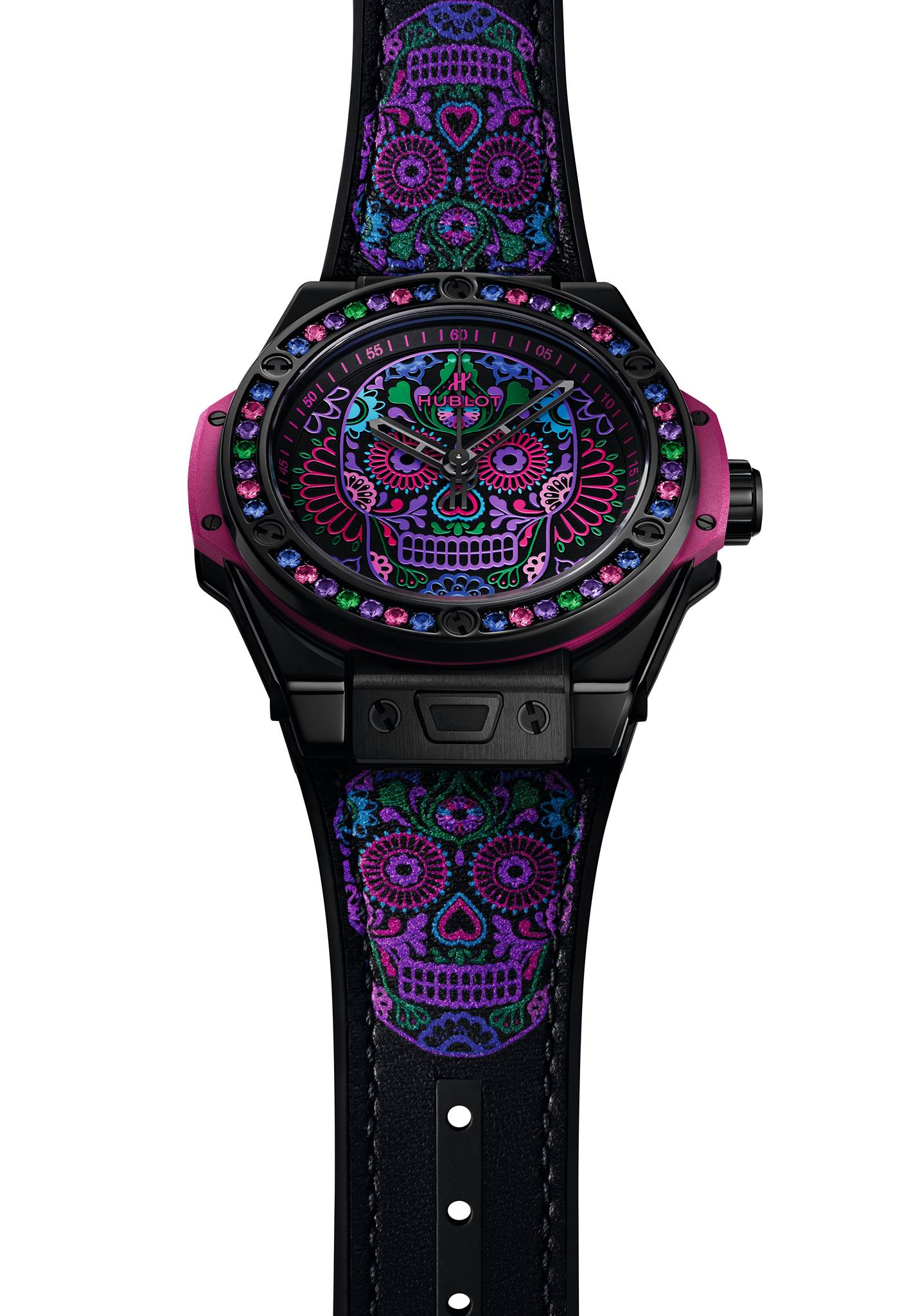 En celebración de las tradiciones católicas mexicanas y en honor a los Santos difuntos, Hublot lanza una colección conformada por tres diferentes referencias estéticas, las cuales lucen la inspiración de la tradicional calavera de azúcar –Sugar Skull–, y que forman parte de la línea Big Bang One Click, que posibilita el intercambio de las diferentes correas.