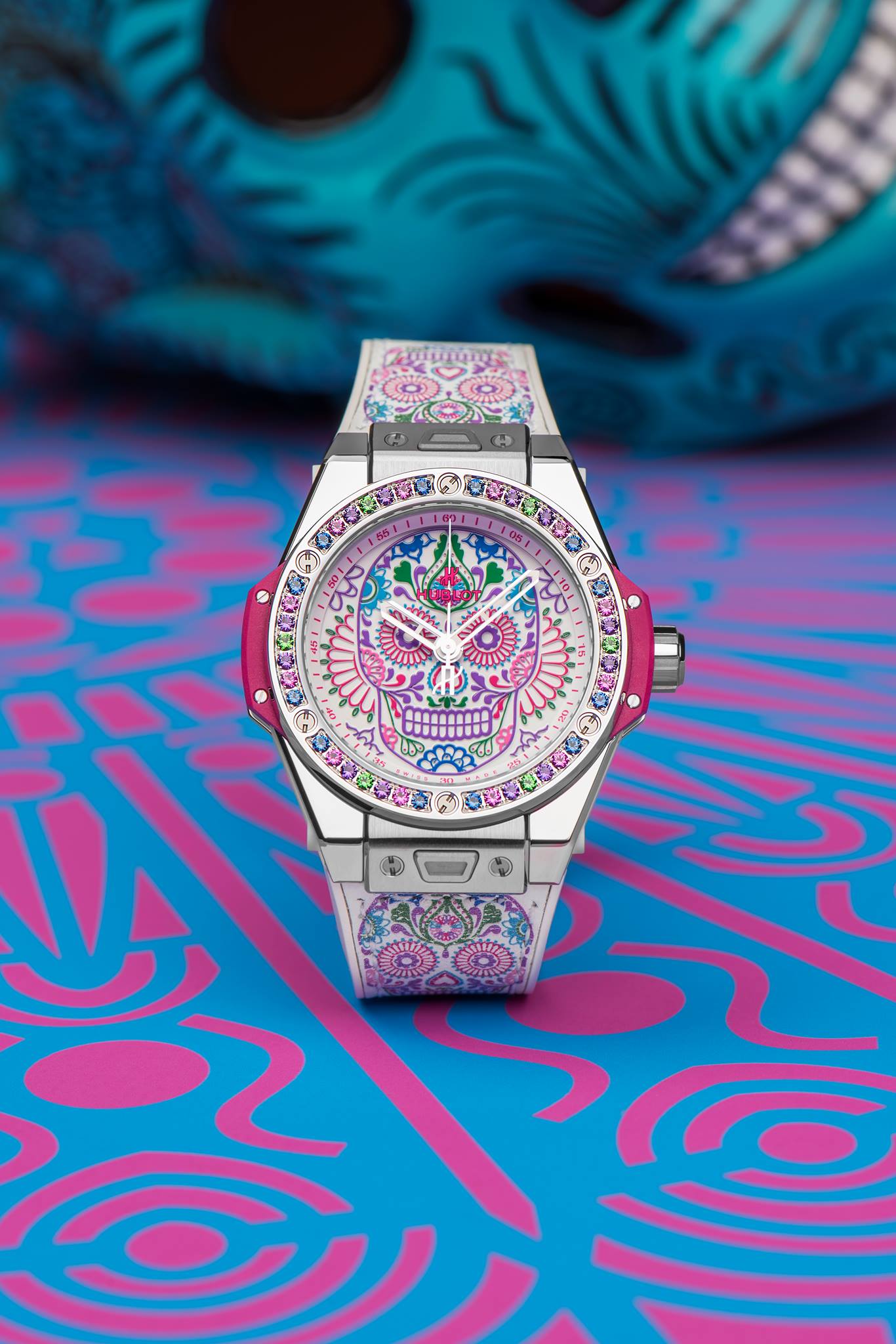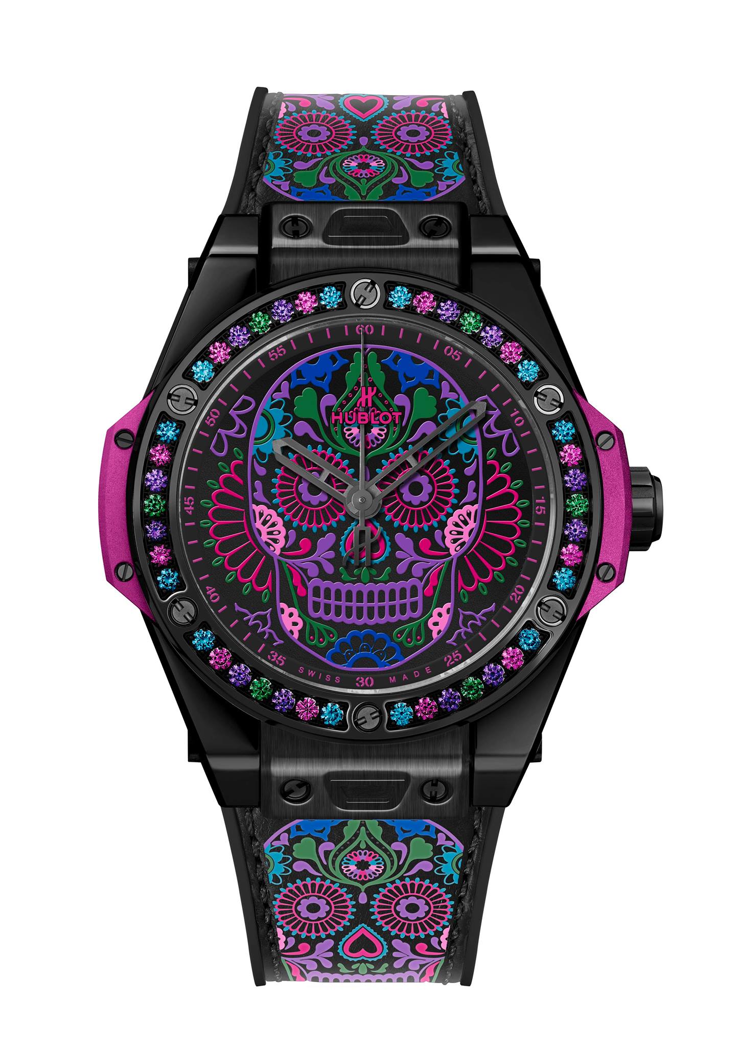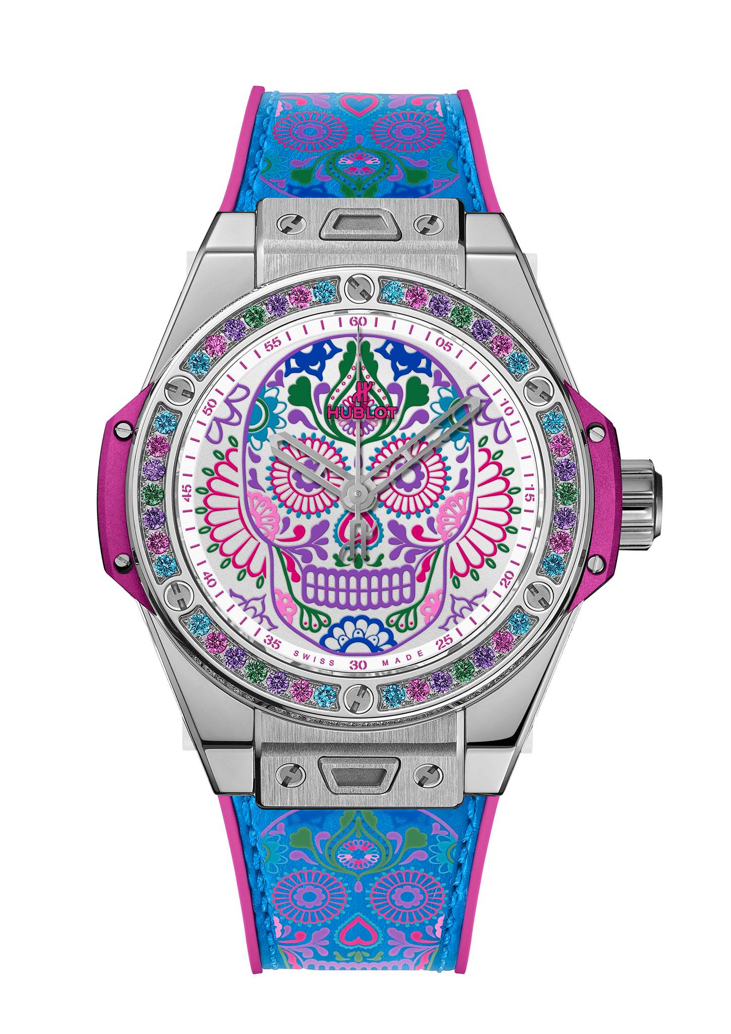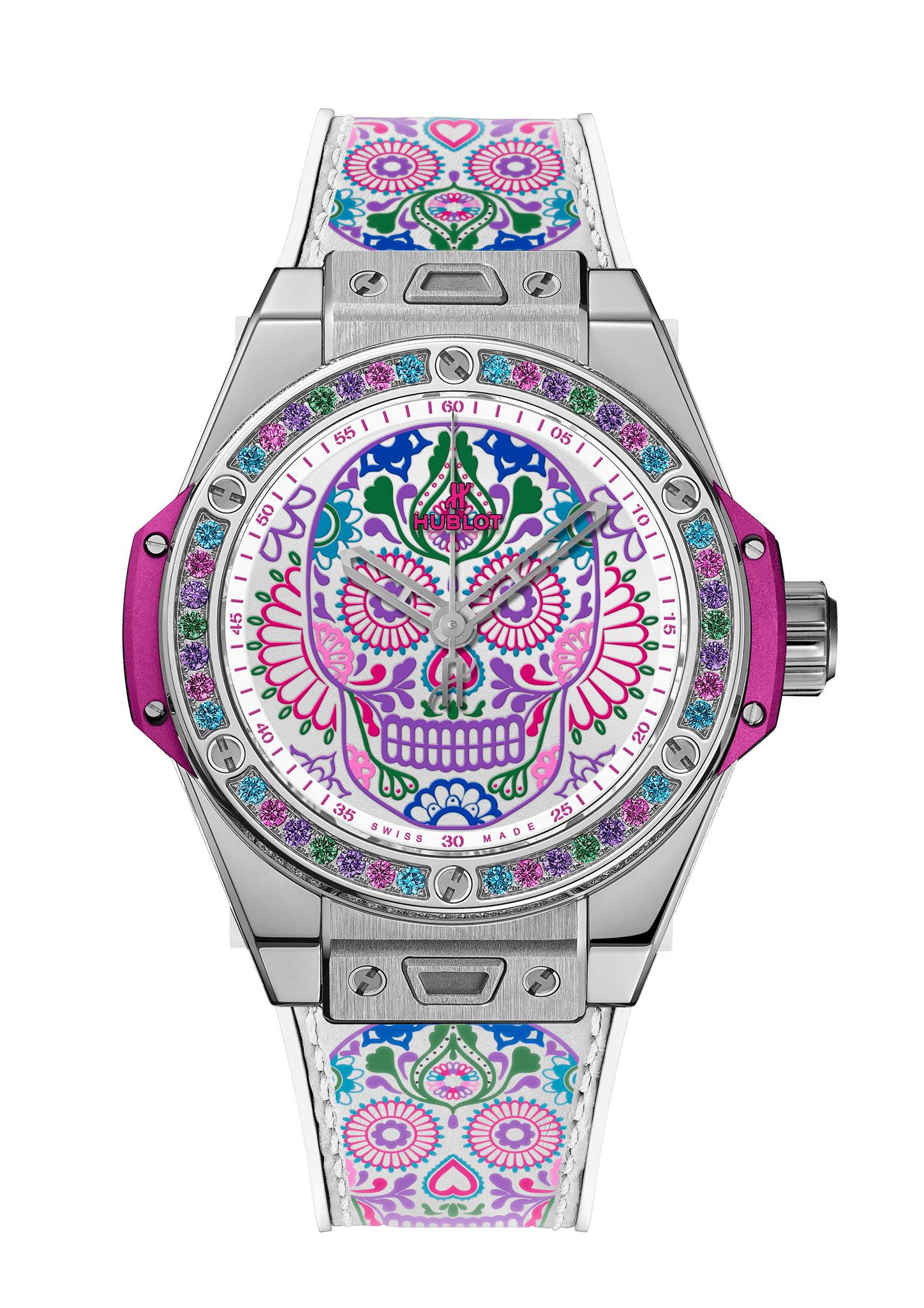 En celebración de las tradiciones católicas mexicanas y en honor a los Santos difuntos, Hublot lanza una colección conformada por tres diferentes referencias estéticas, las cuales lucen la inspiración de la tradicional calavera de azúcar –Sugar Skull–, y que forman parte de la línea Big Bang One Click, que posibilita el intercambio de las diferentes correas.