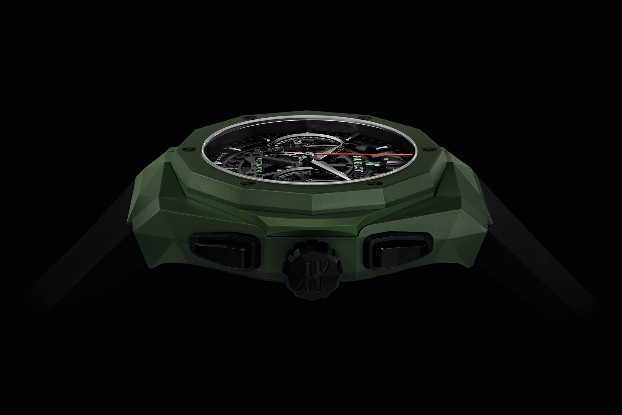 En sintonía con el color del año, el verde, la coincidencia nos trae una referencia de 45 mm de diámetro equipada por el calibre de cronógrafo carga automática HUB1155, visible a través de su fondo de cristal de zafiro, mismo que dibuja un águila devorando a una serpiente, homenaje a nuestro escudo nacional.