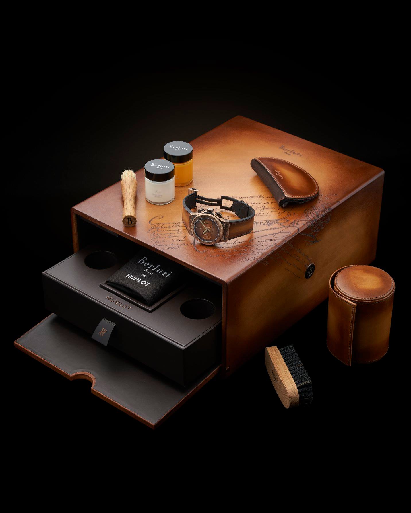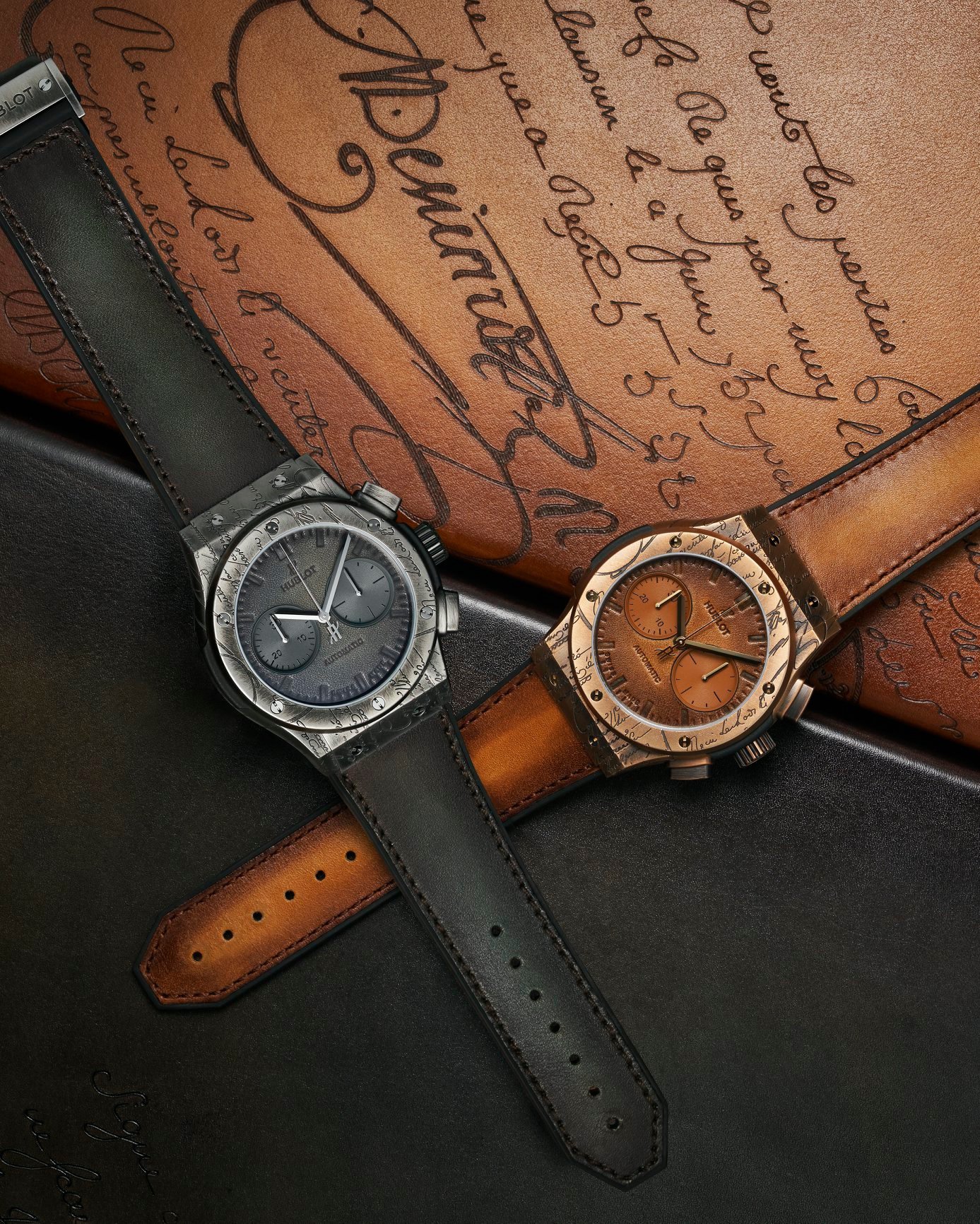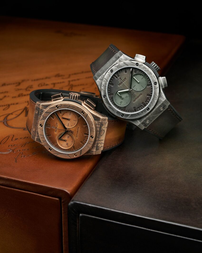 Hublot y Berluti lanzaron una primera línea de relojes en 2016, y desde ese momento el éxito ha sido rotundo. El coincidir entre el arte de hacer relojes y el quehacer de la piel enfocada en el calzado logró cooperar no sólo en el común denominador de una correa, sino en el grabado y la personalización total de la pieza gracias a la colección Scritto, un sello distintivo que la firma francesa destina a sus zapatos.