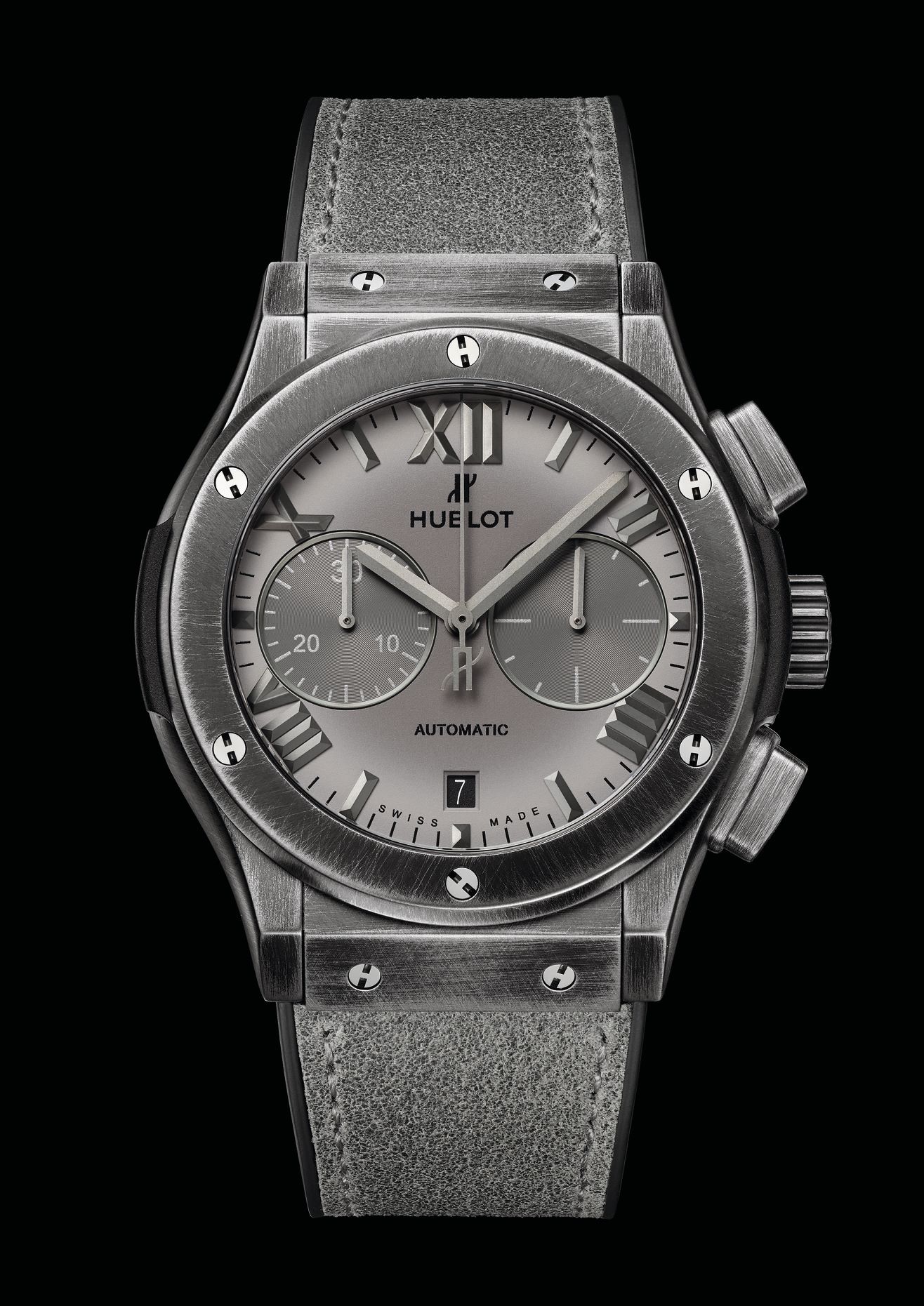 Desarrollada en titanio negro cepillado para caja y bisel, sus 45 mm lucen un efecto ligeramente envejecido. Una elección cromática de claroscuro que envuelve la estética de todos los componentes del reloj, incluida la correa de cuero cosida sobre cuero negro. Mecánicamente porta el movimiento cronógrafo automático HUB1143, dotado de 42 horas de autonomía.