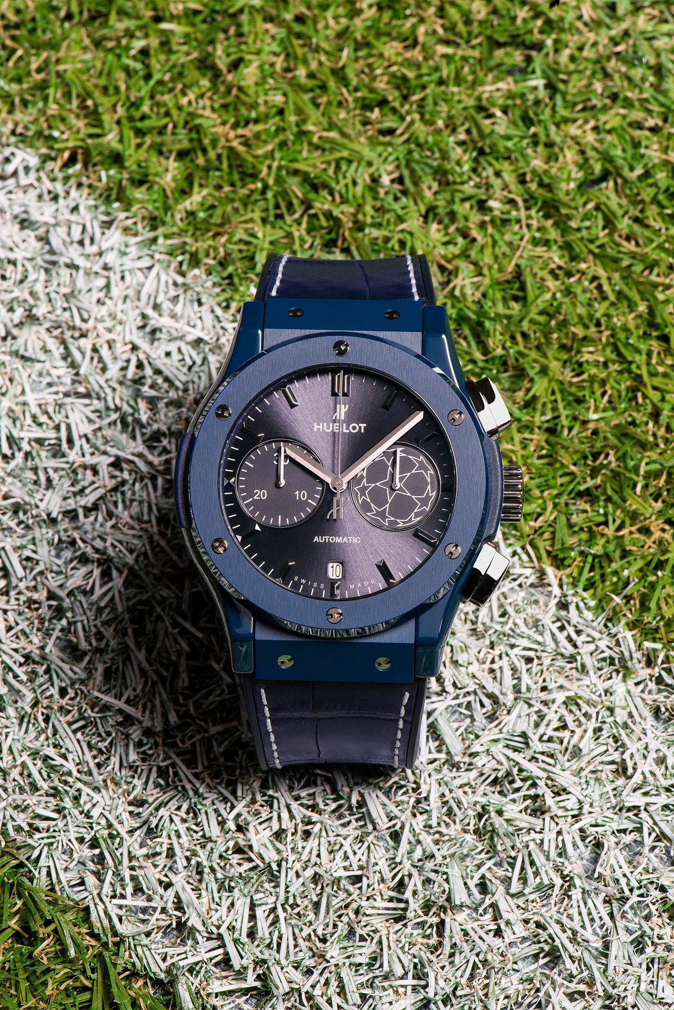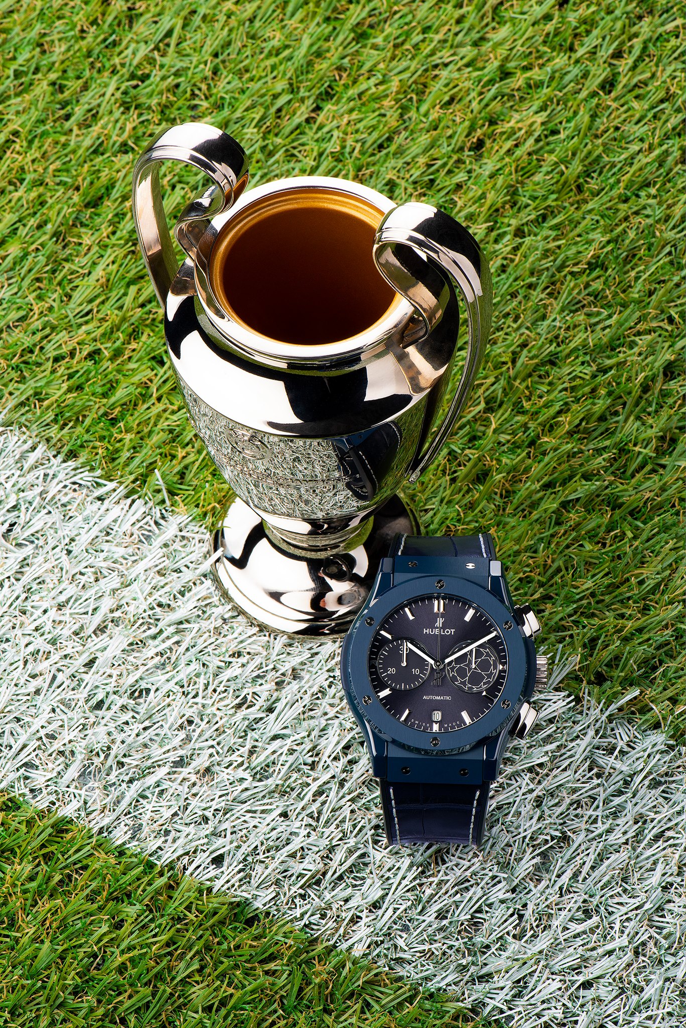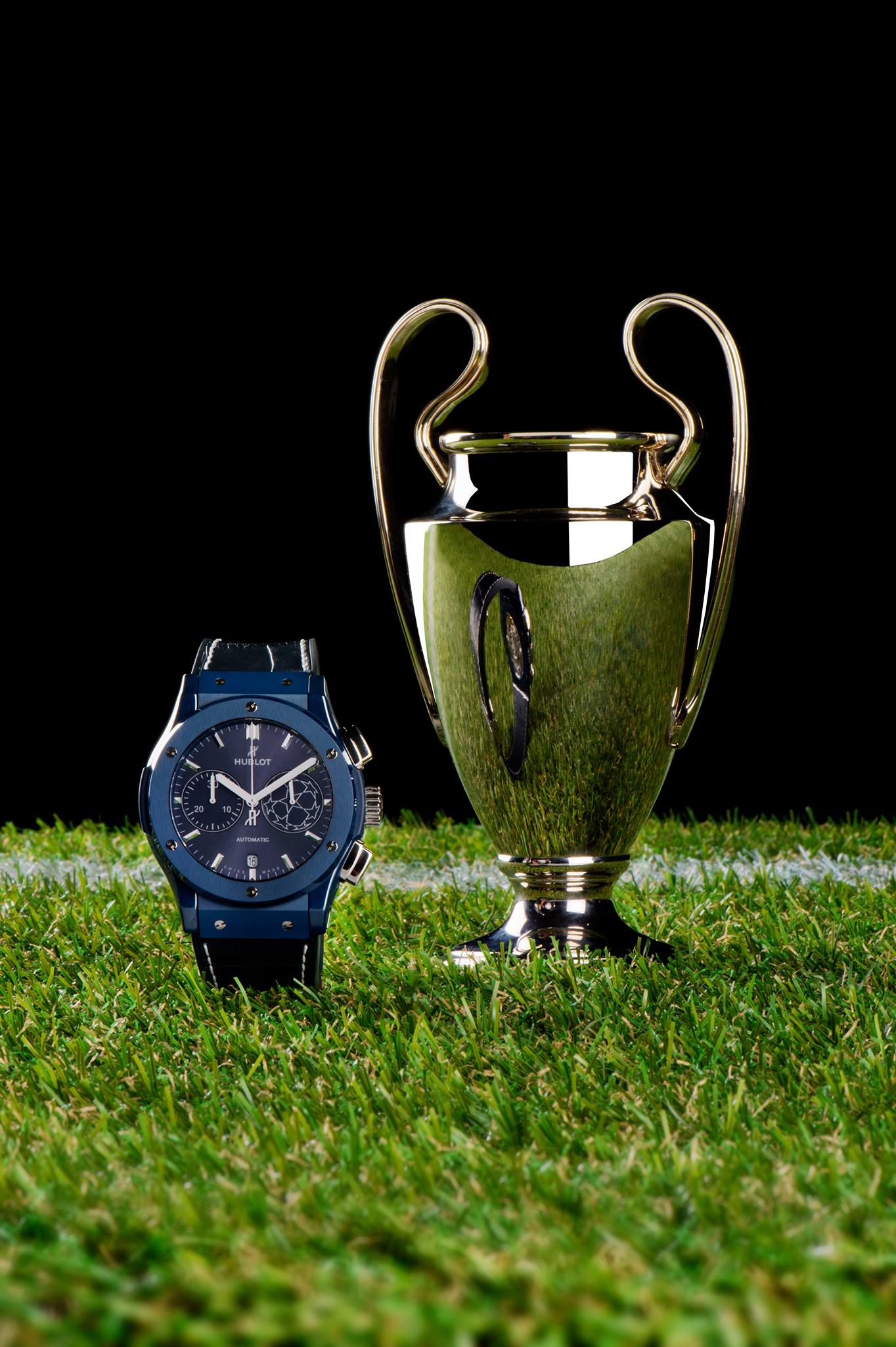 Desarrollado en caja de cerámica, esta pieza luce el color azul noche inspirado en la Champions, mientras que enseña pespuntes y vivos en color blanco, que replican las líneas de los estadios de fútbol. Esta pieza se suma a las 3 desarrolladas con anterioridad, pues desde hace 4 se liga a la justa como Cronometrador Oficial.