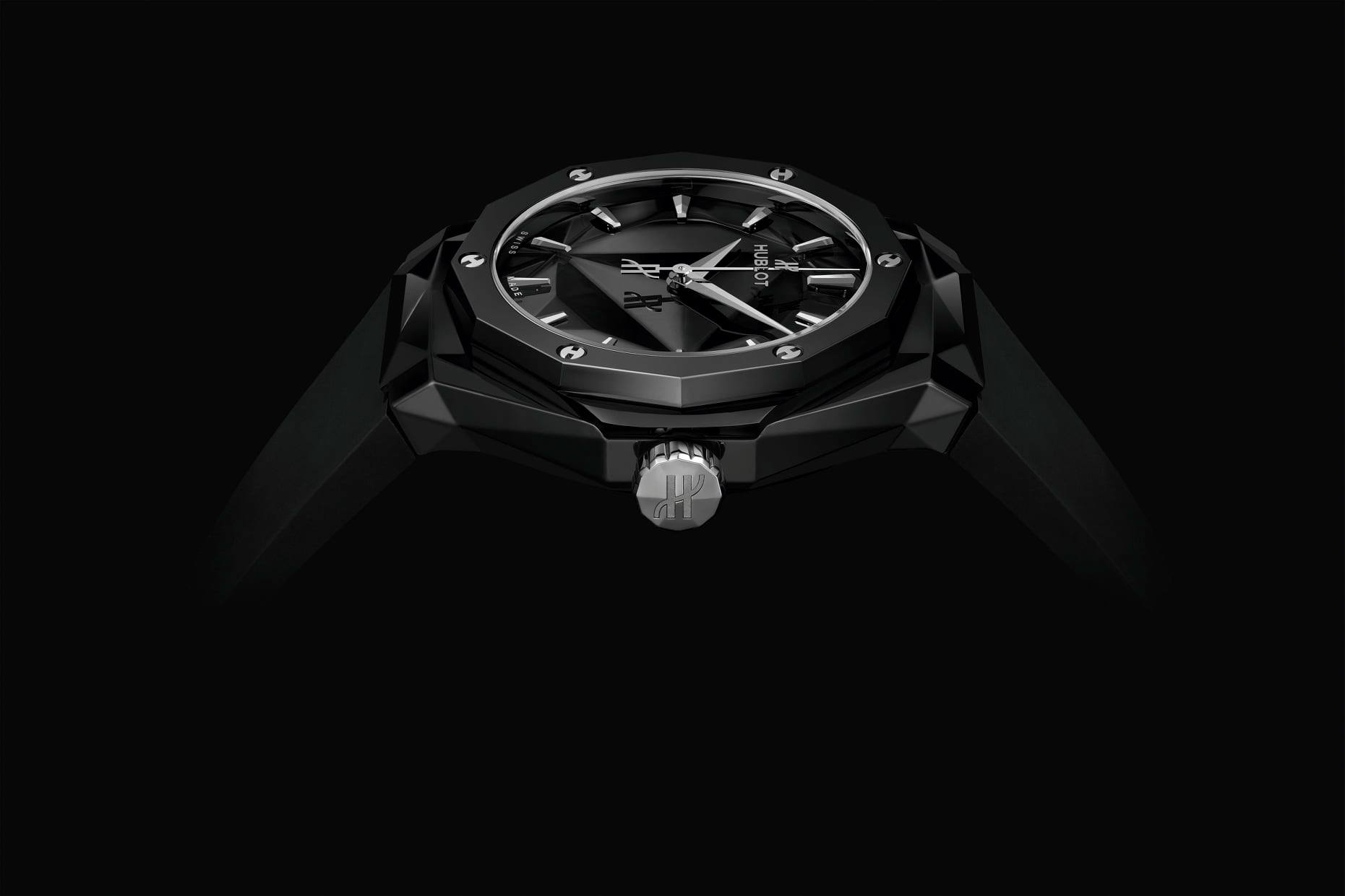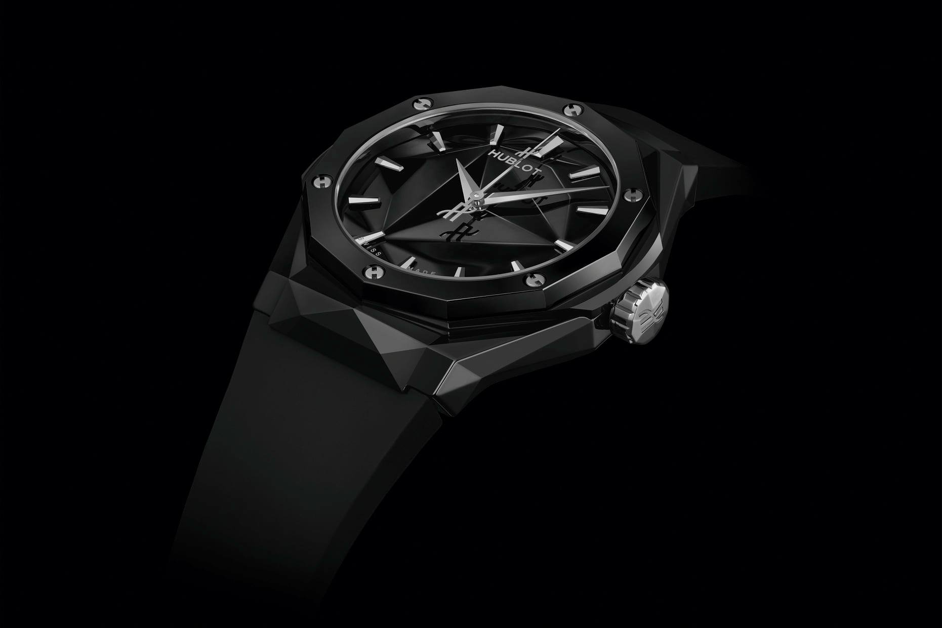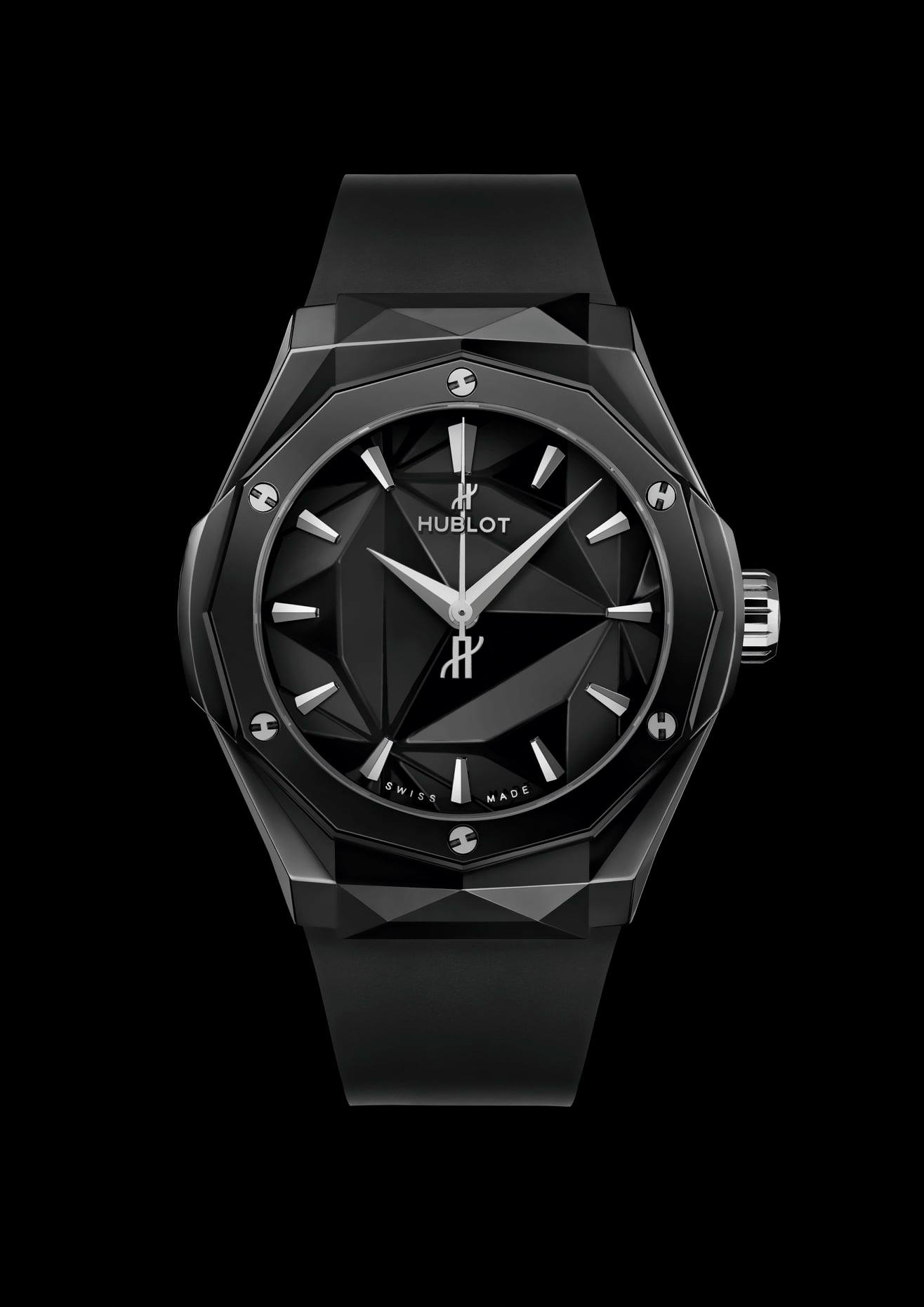 Su carátula replica la esencia de la caja facetada, justo como lucen las esculturas del artista francés. El material elegido para estas dos ediciones es la cerámica. Fabricada en los departamentos de I+D y de Metalurgia de la firma, hoy se ofrece en este par de piezas estilo origami con extensión a 40 mm de diámetro.