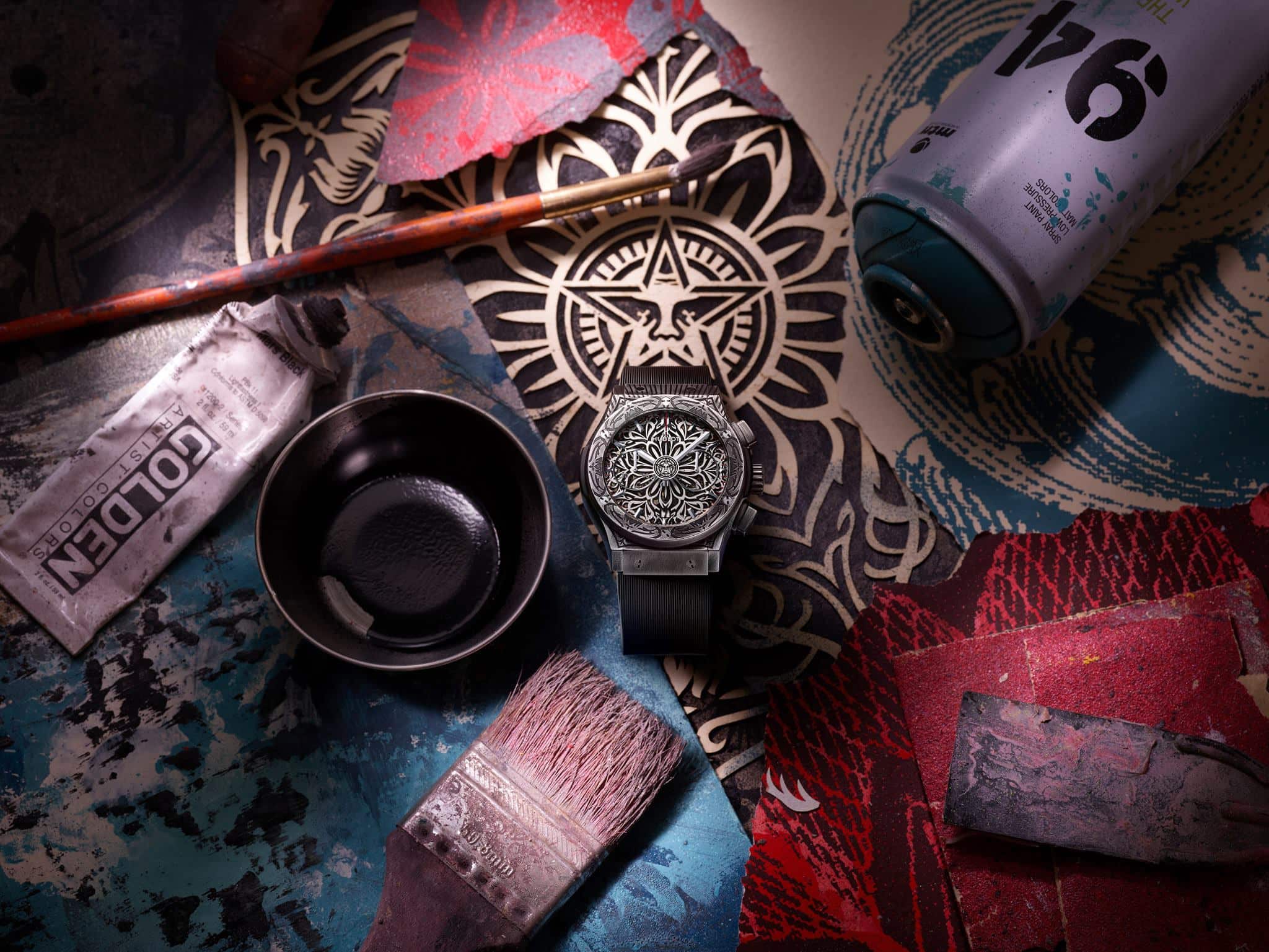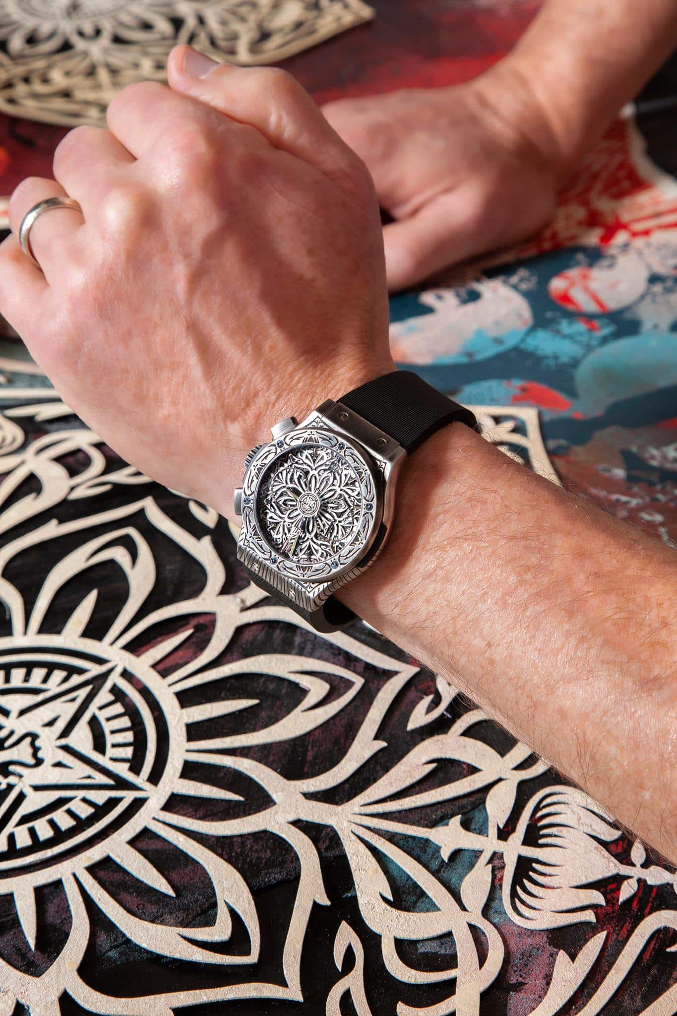 Hublot y Shepard Fairey escogieron un reloj de la colección Classic Fusion como base para su segunda colaboración. En este caso, el artista estadounidense, que se implicó profundamente en el proyecto, decidió dar vida a una pieza que simboliza un mandala, símbolo ornamental que tiene su origen en diversas culturas de todo el planeta.