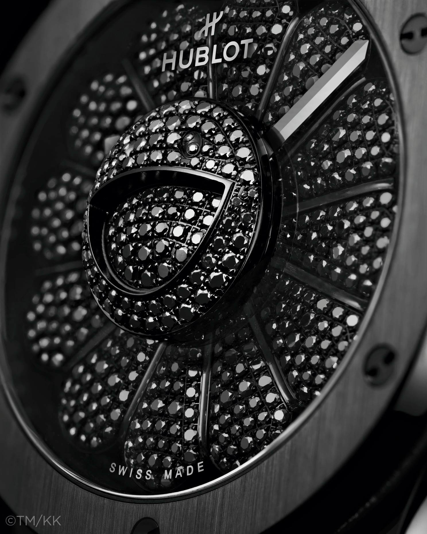 Una primera visita a la manufactura Hublot en febrero de 2020 permitió a Takashi Murakami familiarizarse con el diseño y la fabricación de relojes. Este momento fue el desencadenante de un proceso creativo cuyo resultado es el innovador reloj Classic Fussion Takashi Murakami All Black, inspirado en el icono del artista: la flor sonriente. Esta vive tanto dentro del reloj como sobre este. Gracias a un inteligente sistema de rodamiento de esferas desarrollado por los ingenieros de Hublot, sus pétalos comienzan a girar. El centro de la flor sonriente se inserta sobre el cristal de zafiro, mostrando su gran y prominente sonrisa para crear un efecto tridimensional único. Para lograr un efecto aún más acentuado, los pétalos (456 brillantes) y el pistilo (107 brillantes) se encuentran engastados con diamantes negros.