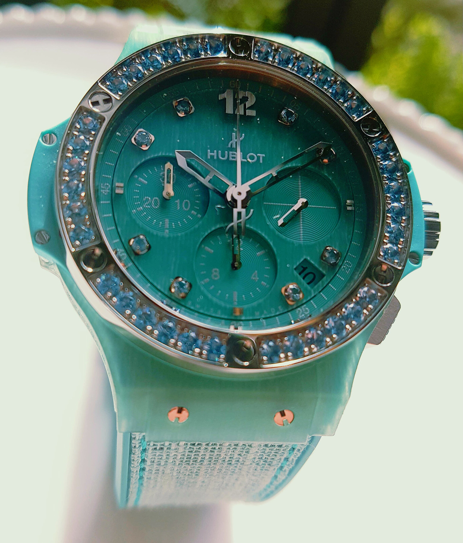 Finalmente, Big Bang Steel Diamonds de 38 mm, un reloj ideal para un estilo de vida casual, deportivo y chic; atemporal como la belleza de una mujer y reforzado con el brillo del engaste de diamantes en su bisel en comunión con una correa de caucho a juego.