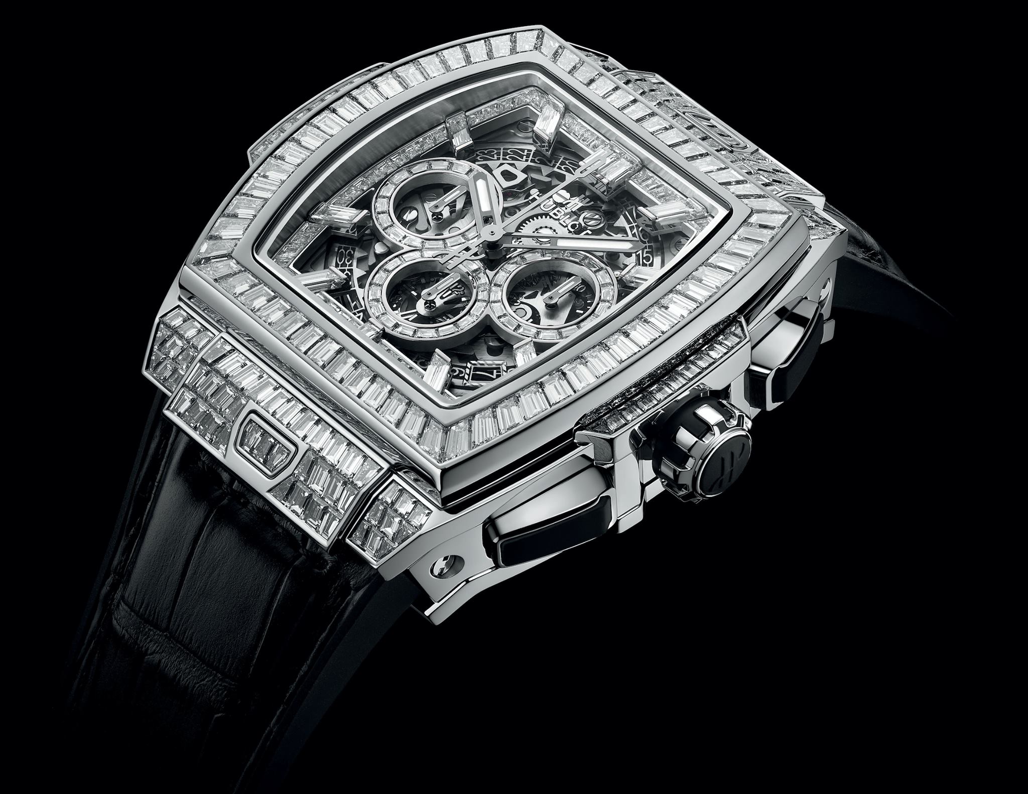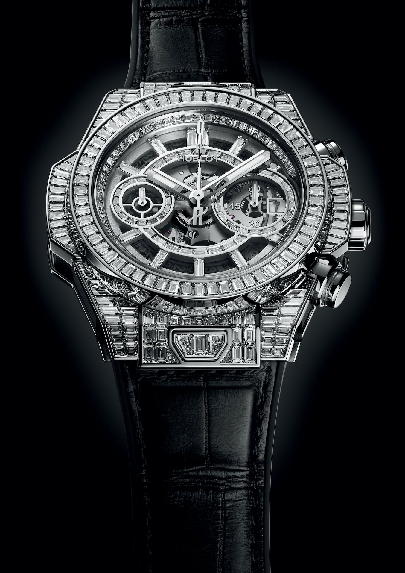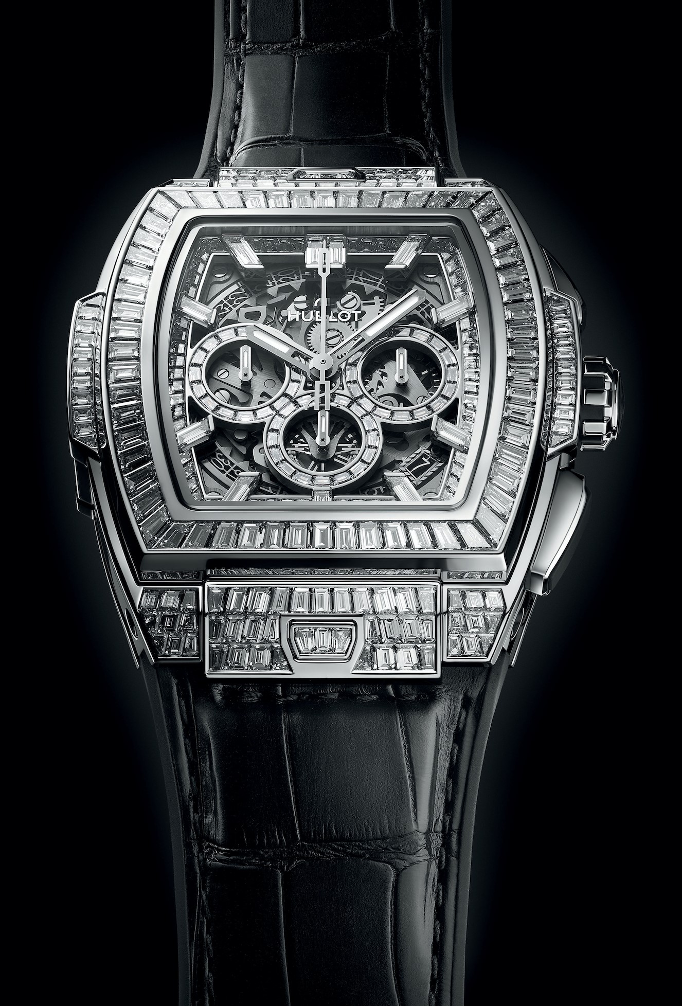 Dotado de 334 diamantes de talla baguette y 12,5 quilates dispuestos en filas estrechas de engastes cerrados invisibles sobre un lienzo de oro blanco de 18 quilates, 243 diamantes (8,6 quilates) engalanan la caja de 42 mm y el bisel, mientras que 61 piedras (1,3 quilates) otorgan una opulencia contemporánea a la carátula. En su interior vibra un calibre de cronógrafo flyback HUB1280 de desarrollo interno Unico 2 con una arquitectura completamente novedosa e innovaciones que incluyen un segundo embrague oscilante y un sistema de fricción de cronógrafo con rodamiento de esferas ajustable. Se han registrado cuatro solicitudes de patente para esta maravilla de la tecnología, que se ha combinado con una correa de piel de aligátor con hebilla desplegable y 30 diamantes engastados (2,6 quilates).