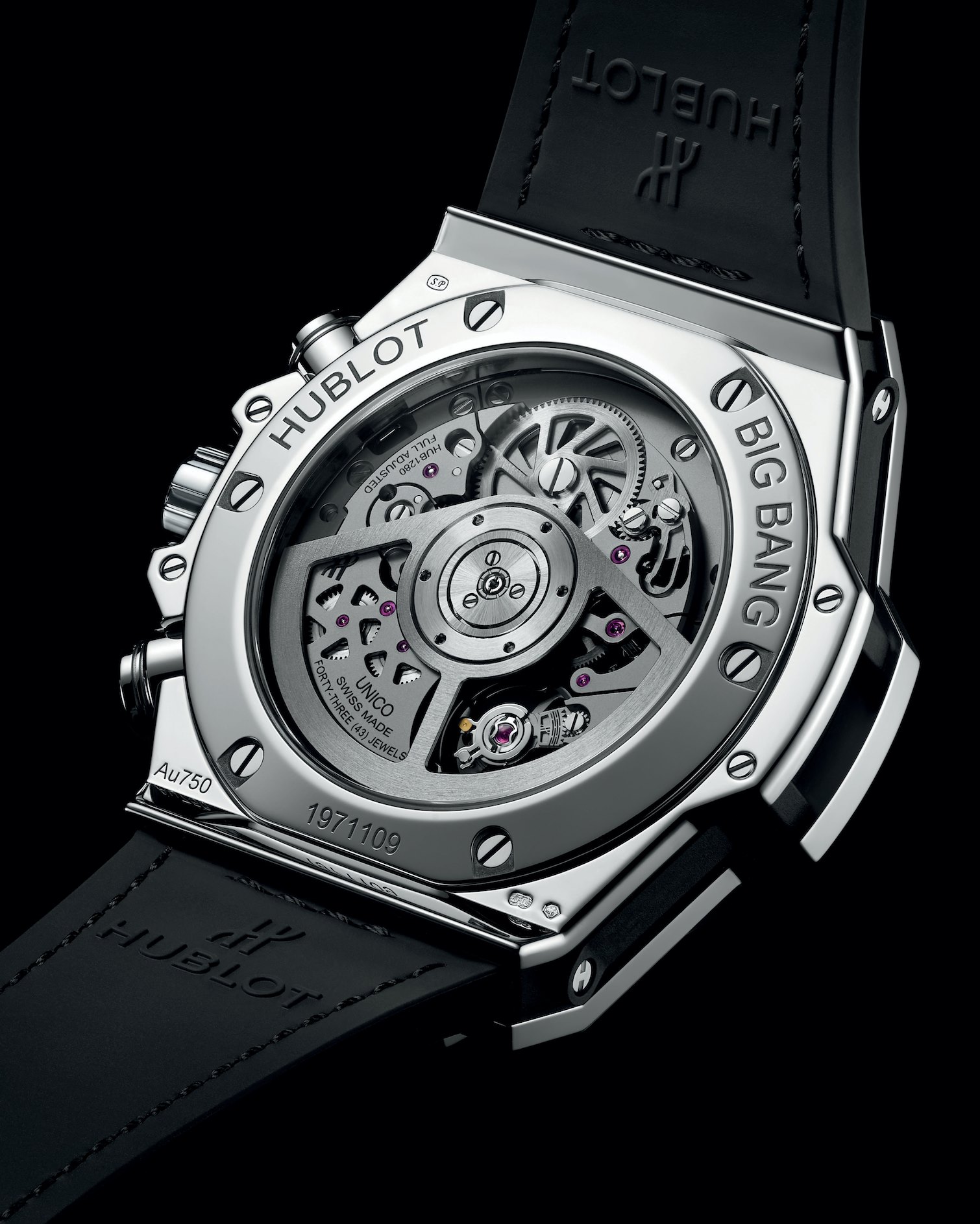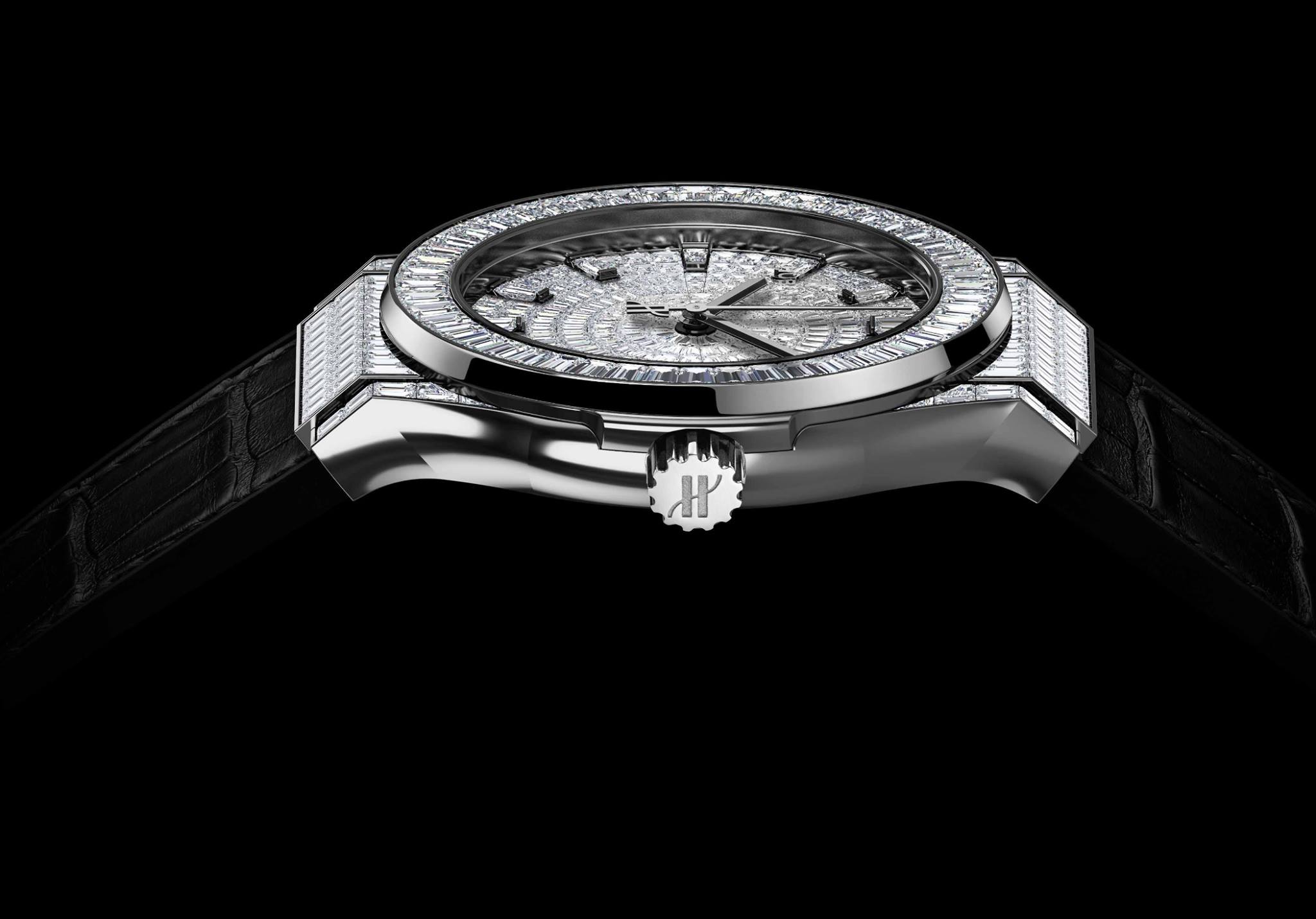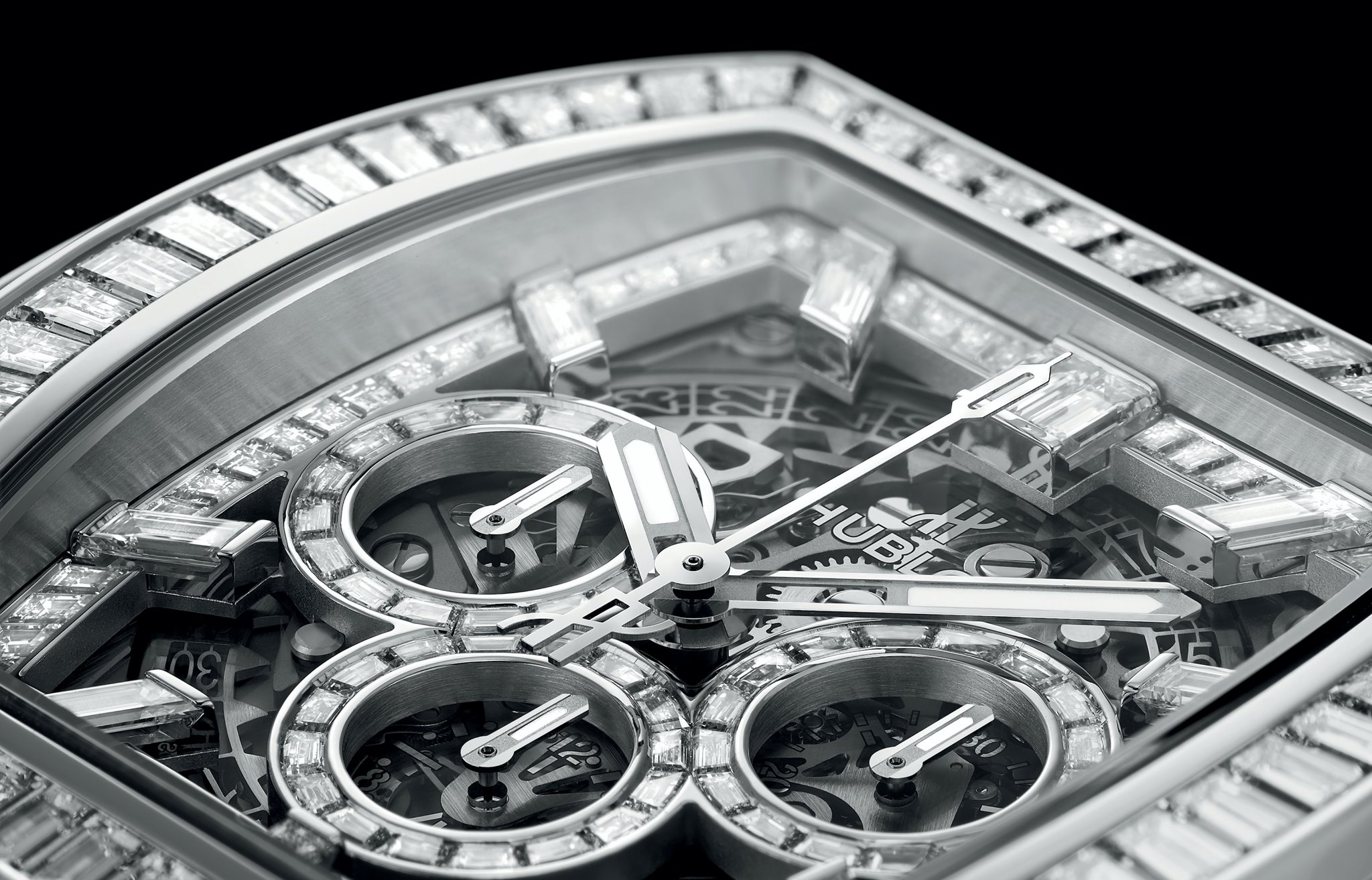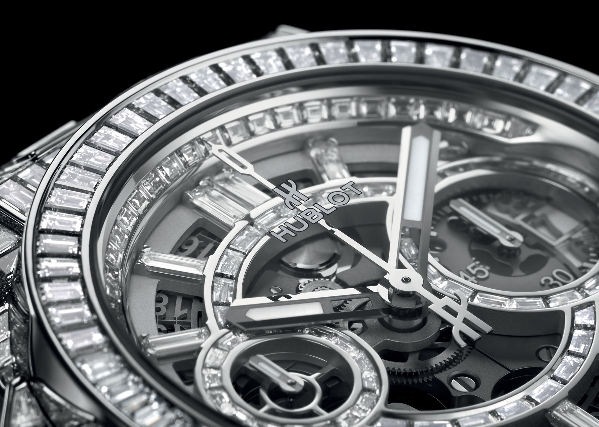 Dotado de 334 diamantes de talla baguette y 12,5 quilates dispuestos en filas estrechas de engastes cerrados invisibles sobre un lienzo de oro blanco de 18 quilates, 243 diamantes (8,6 quilates) engalanan la caja de 42 mm y el bisel, mientras que 61 piedras (1,3 quilates) otorgan una opulencia contemporánea a la carátula. En su interior vibra un calibre de cronógrafo flyback HUB1280 de desarrollo interno Unico 2 con una arquitectura completamente novedosa e innovaciones que incluyen un segundo embrague oscilante y un sistema de fricción de cronógrafo con rodamiento de esferas ajustable. Se han registrado cuatro solicitudes de patente para esta maravilla de la tecnología, que se ha combinado con una correa de piel de aligátor con hebilla desplegable y 30 diamantes engastados (2,6 quilates).